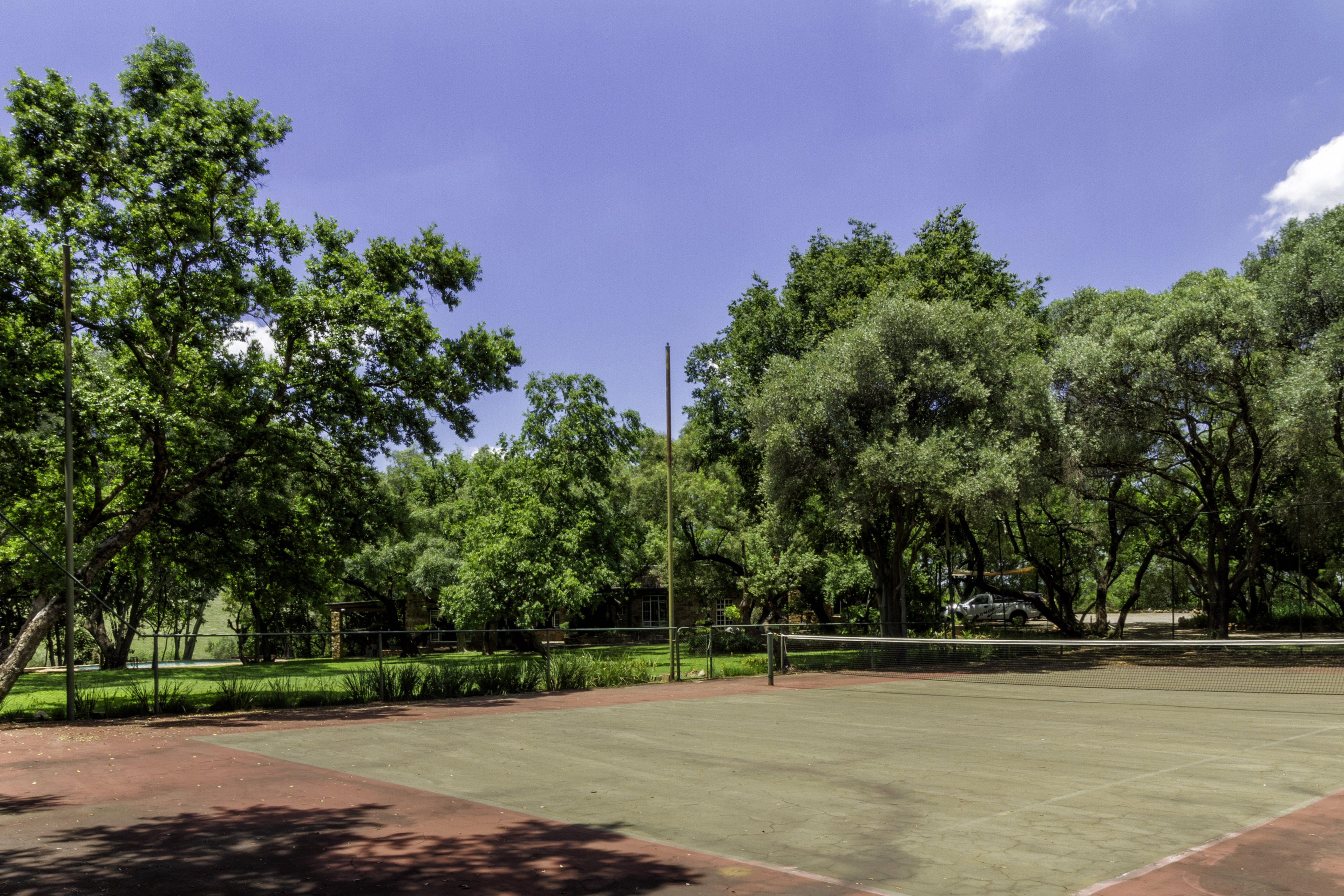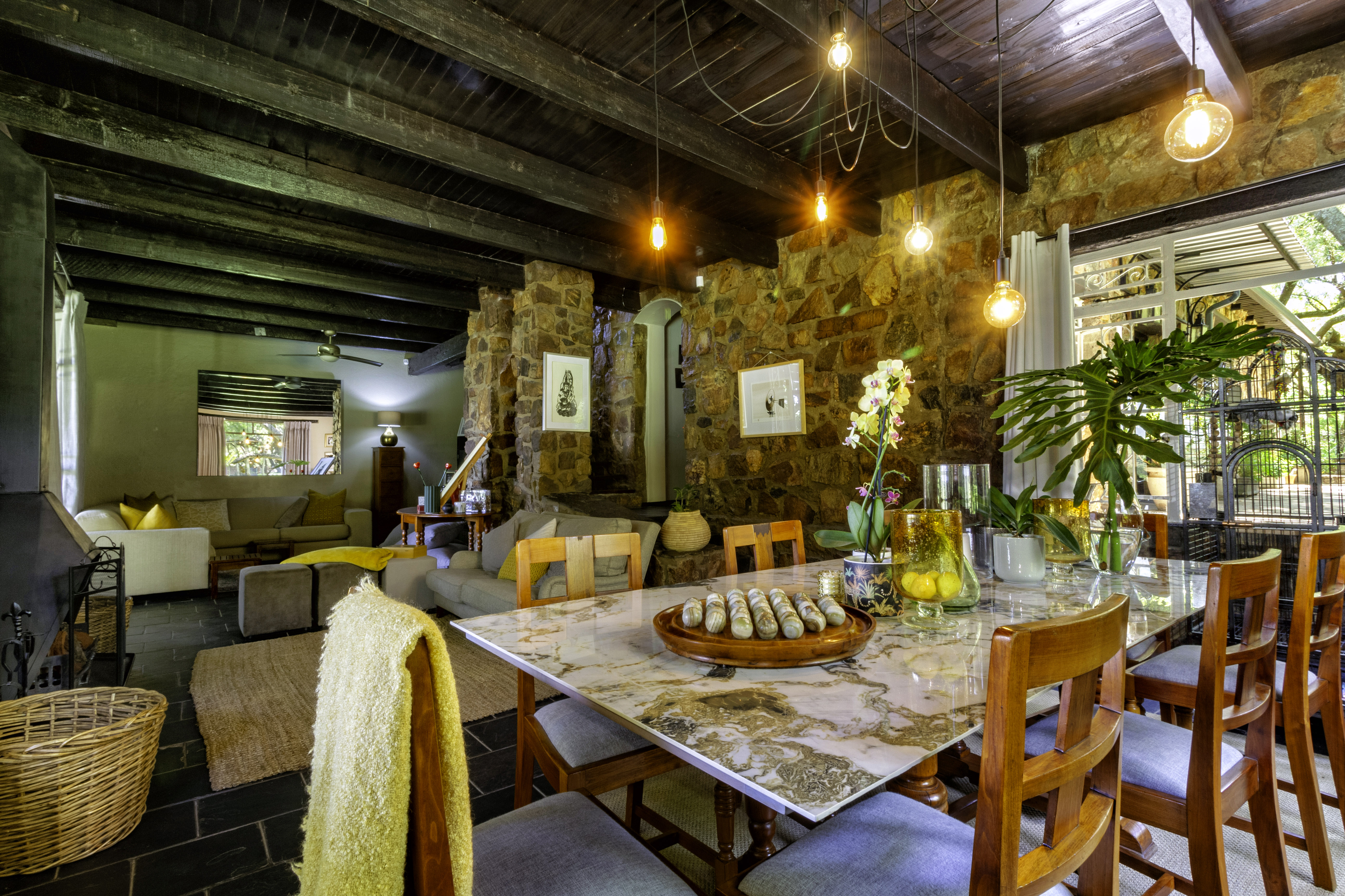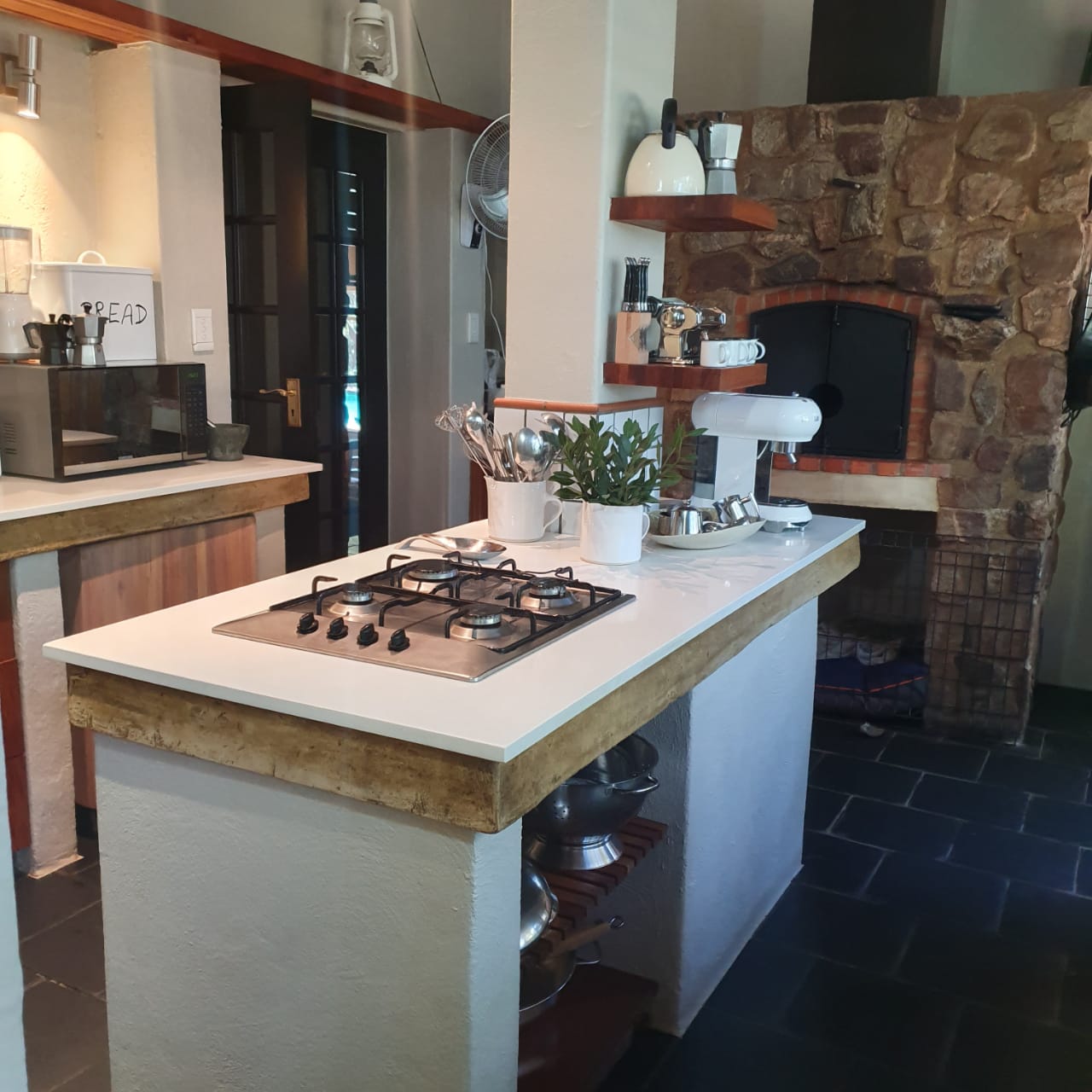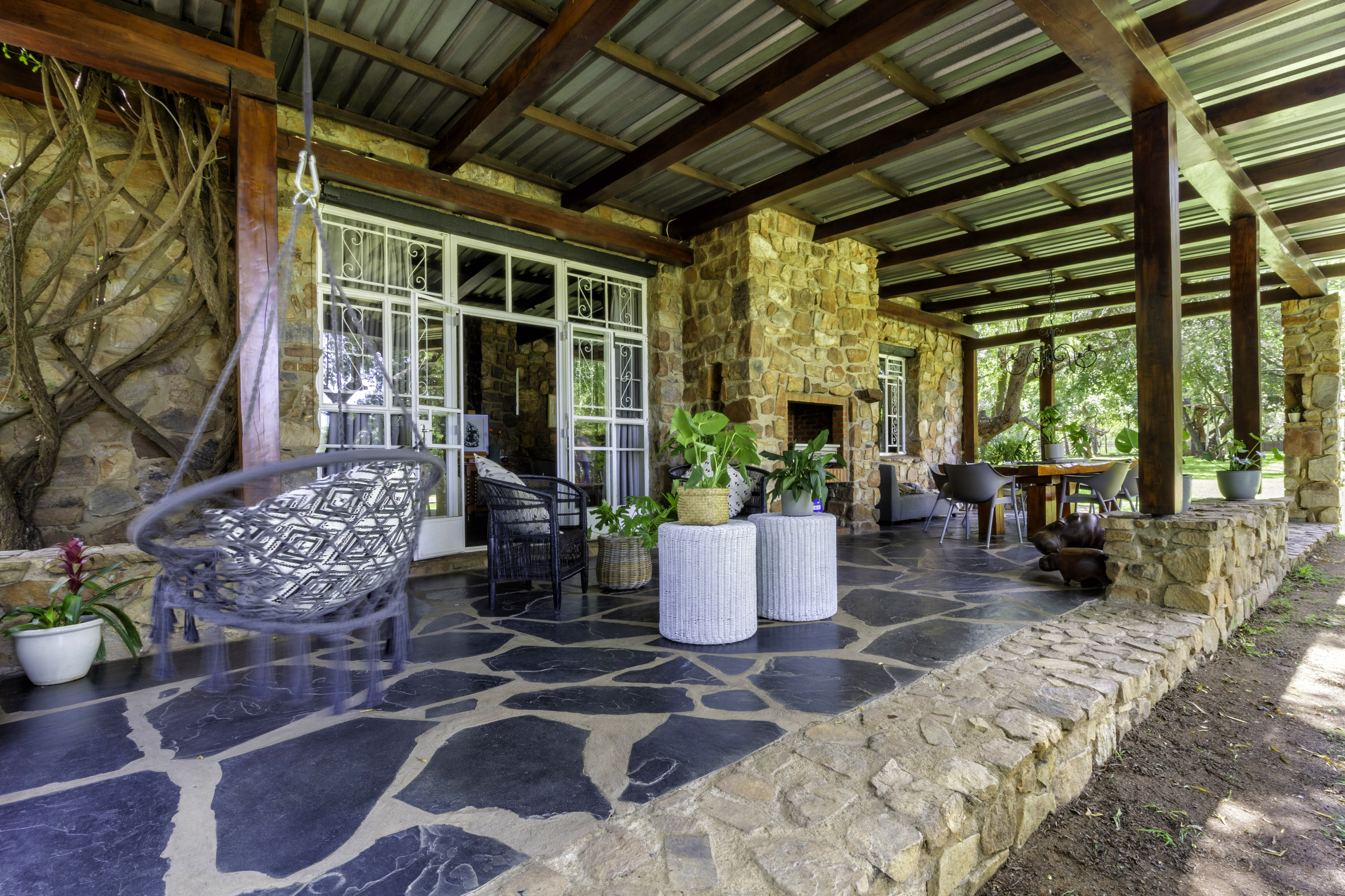 Open plan living area, made up of Dining and Lounge, with the addition of a wood burning fire place for those winter nights. Built in wooden T.V. unit and double doors that lead out onto an exquisite covered patio, large enough to satisfy any event, with the addition of a built in gas braai. The patio has a wonderful view of the tennis court, surrounding garden, pool, fire-pit and nearby watering hole, where game come in at intervals and quench their thirst.
