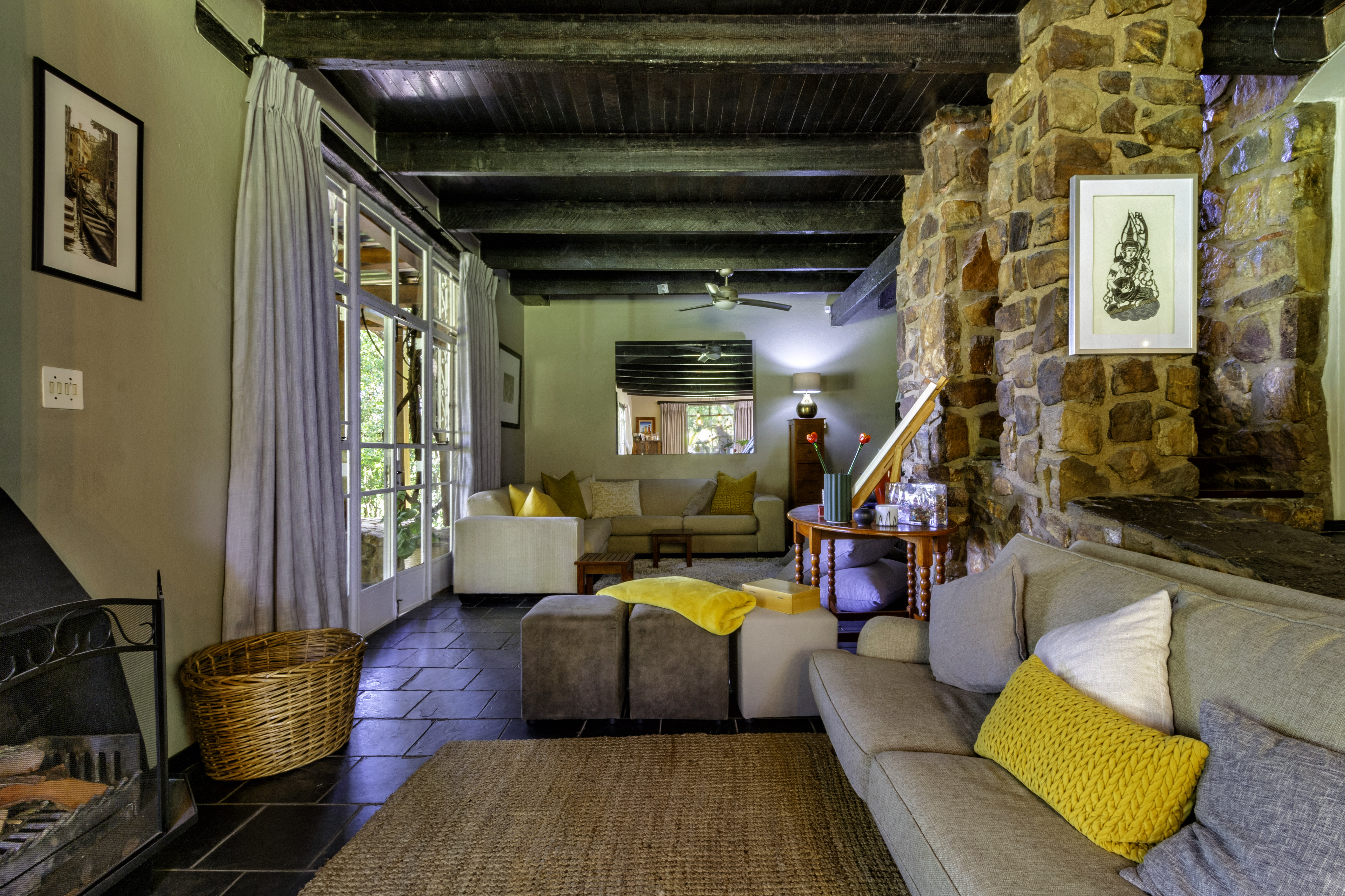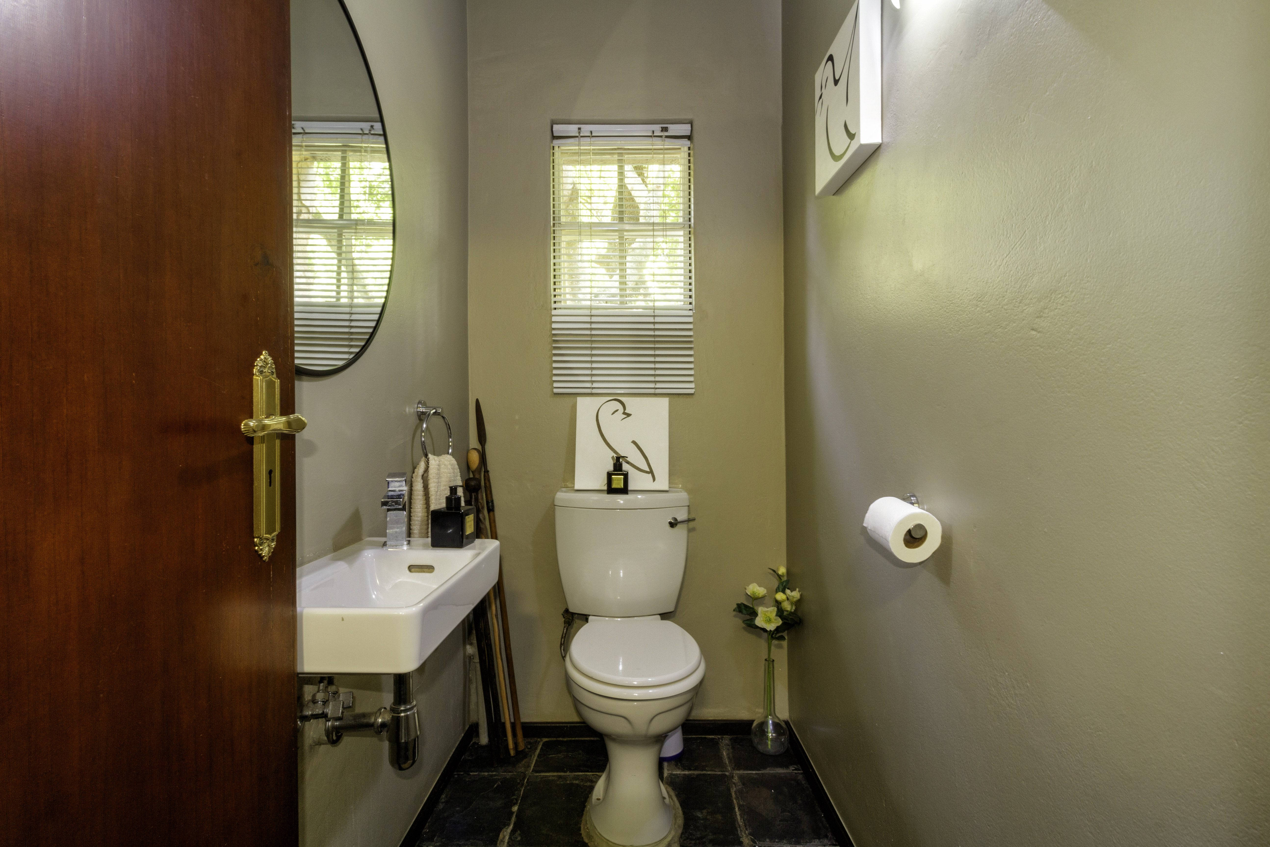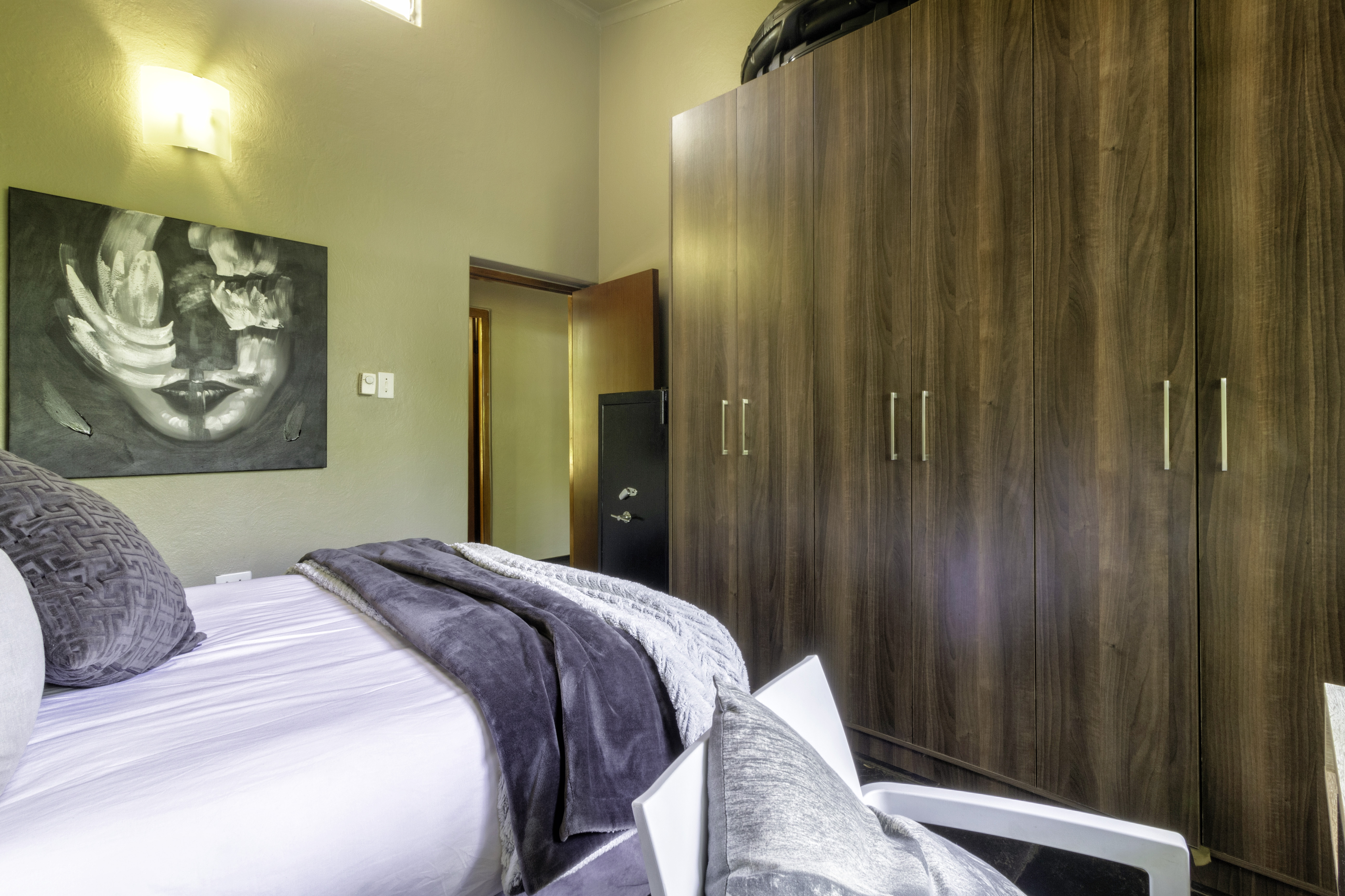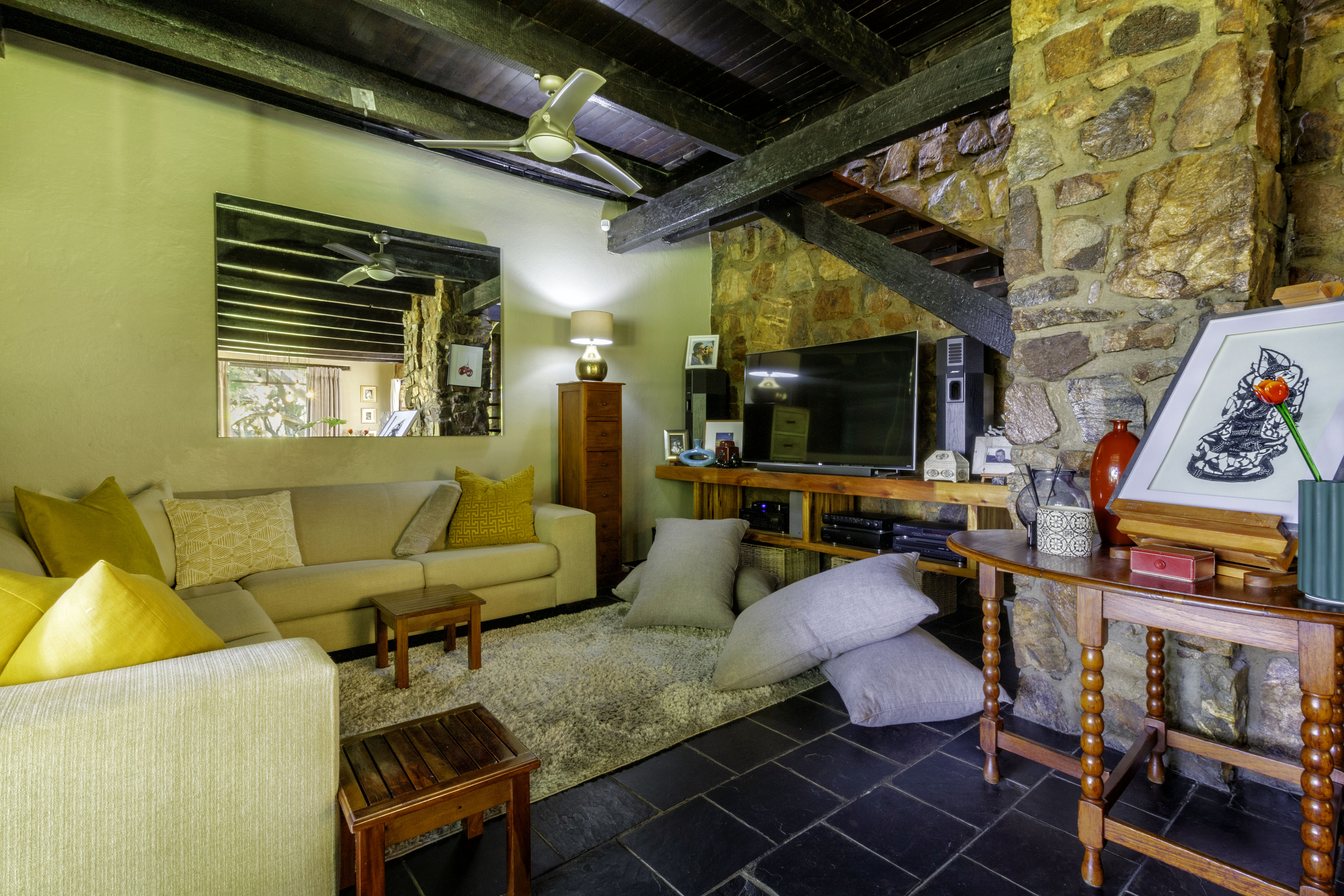 Open plan living area, made up of Dining and Lounge, with the addition of a wood burning fire place for those winter nights. Built in wooden T.V. unit and double doors that lead out onto an exquisite covered patio, large enough to satisfy any event, with the addition of a built in gas braai. The patio has a wonderful view of the tennis court, surrounding garden, pool, fire-pit and nearby watering hole, where game come in at intervals and quench their thirst.