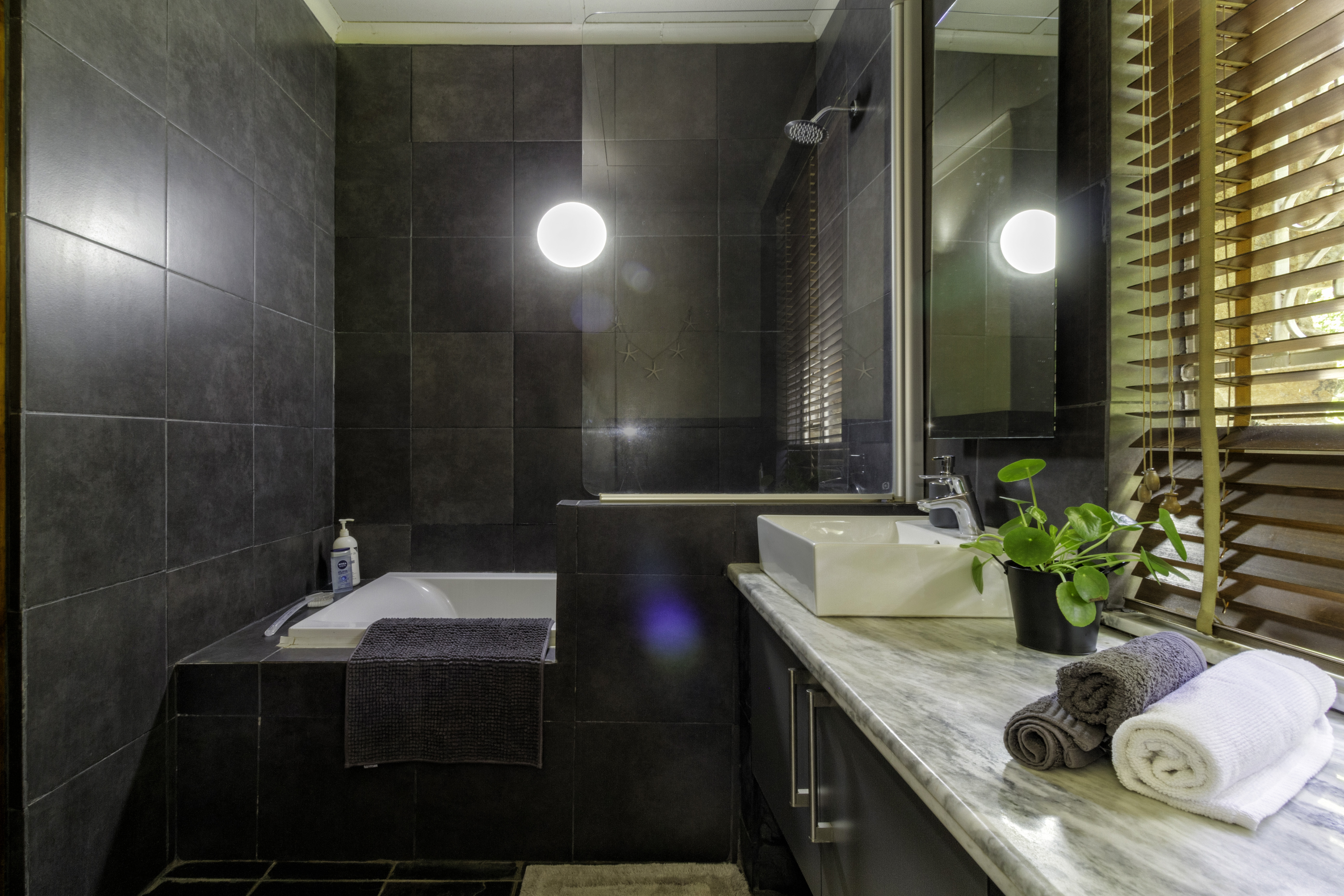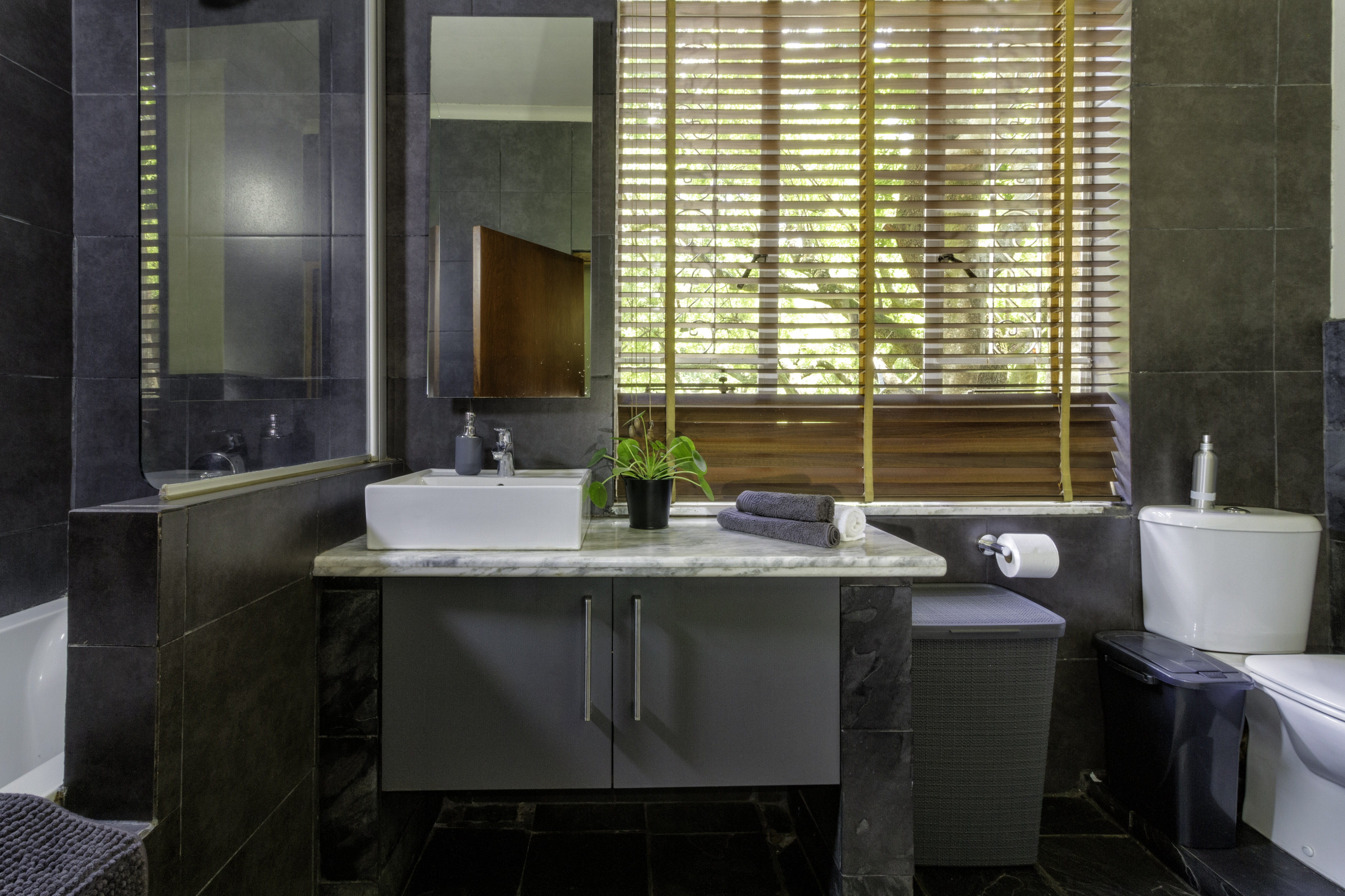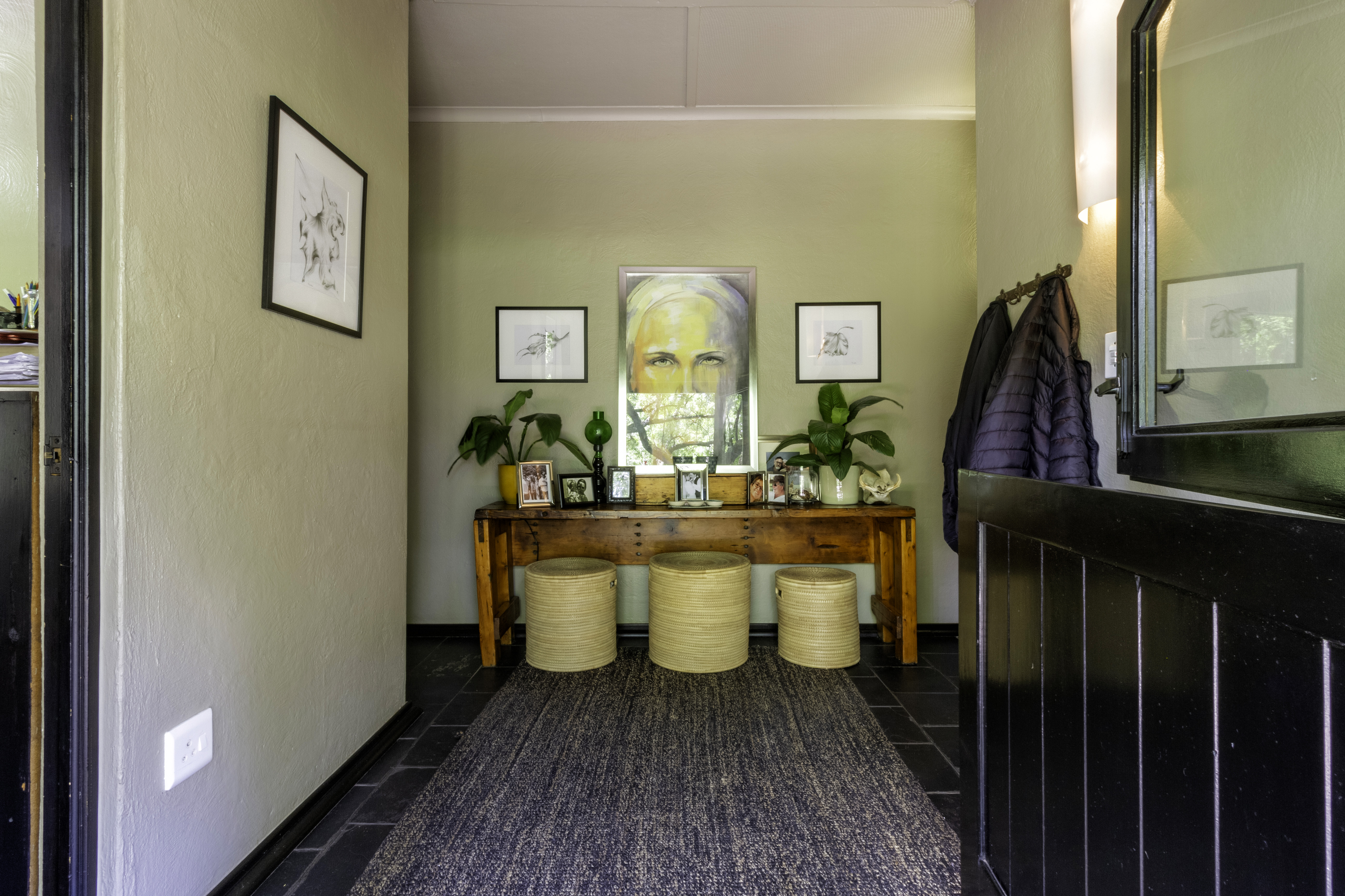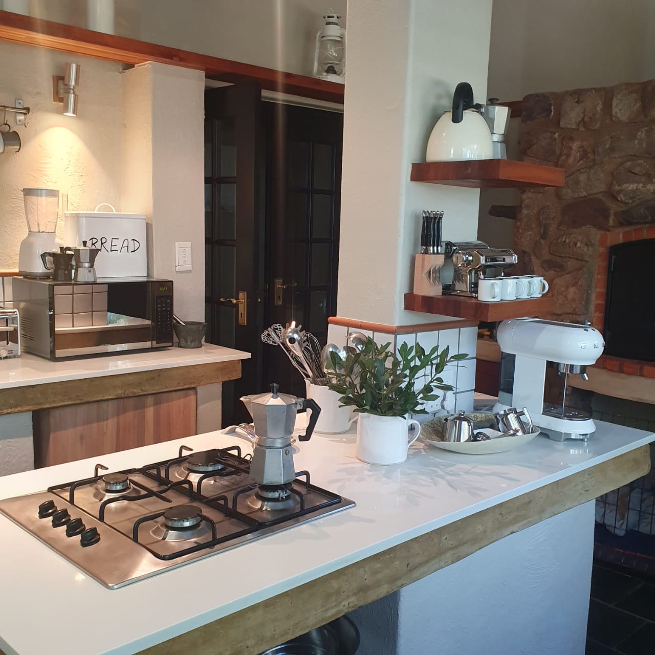 Open plan living area, made up of Dining and Lounge, with the addition of a wood burning fire place for those winter nights. Built in wooden T.V. unit and double doors that lead out onto an exquisite covered patio, large enough to satisfy any event, with the addition of a built in gas braai. The patio has a wonderful view of the tennis court, surrounding garden, pool, fire-pit and nearby watering hole, where game come in at intervals and quench their thirst.