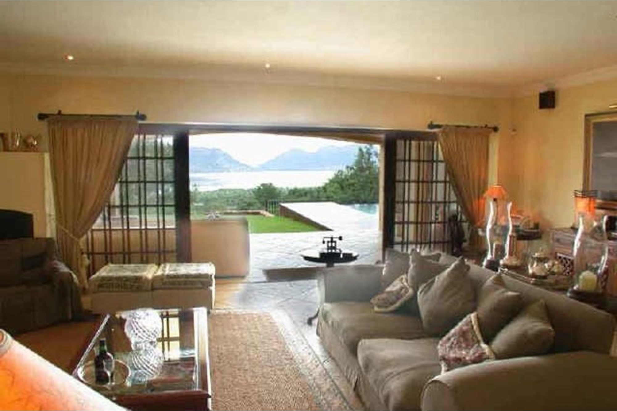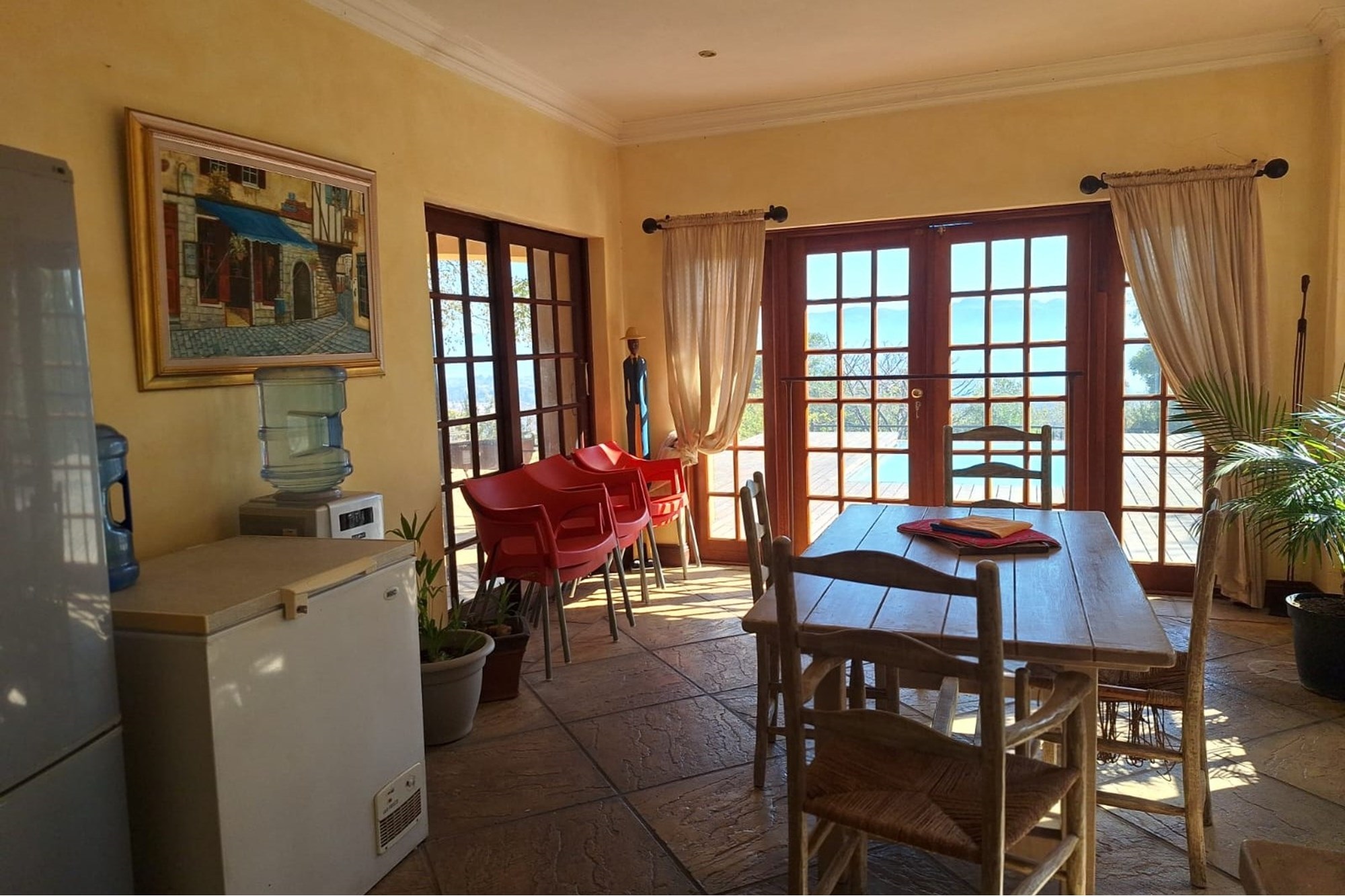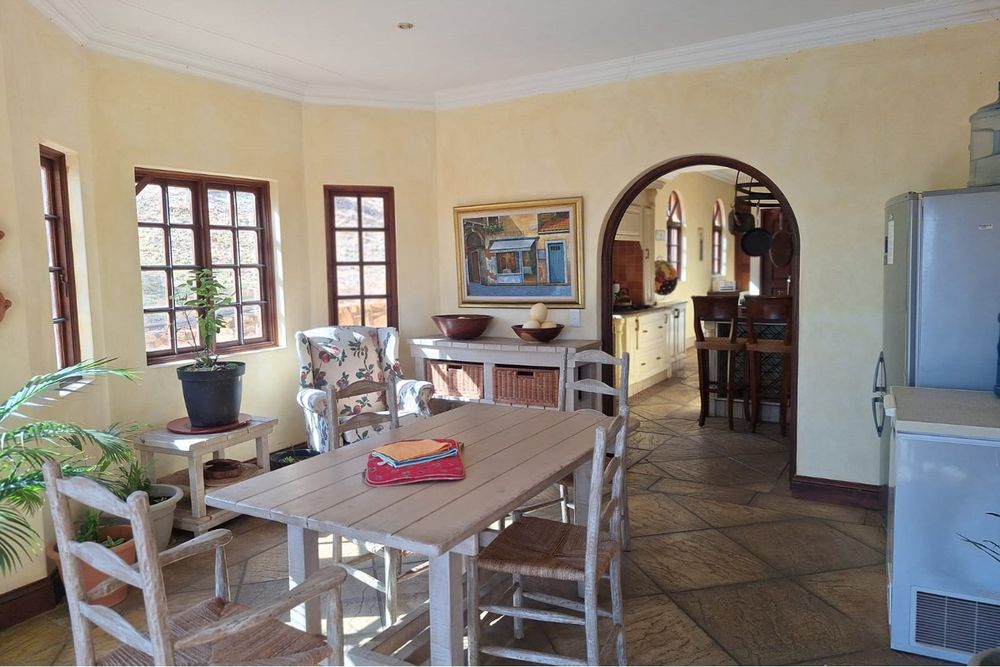 The spacious lounge flows effortlessly through classic wooden sliding doors onto a tiled patio, complete with a built-in braai. This outdoor entertainment space overlooks a lush garden, sparkling swimming pool, and offers breathtaking panoramic views of the dam.