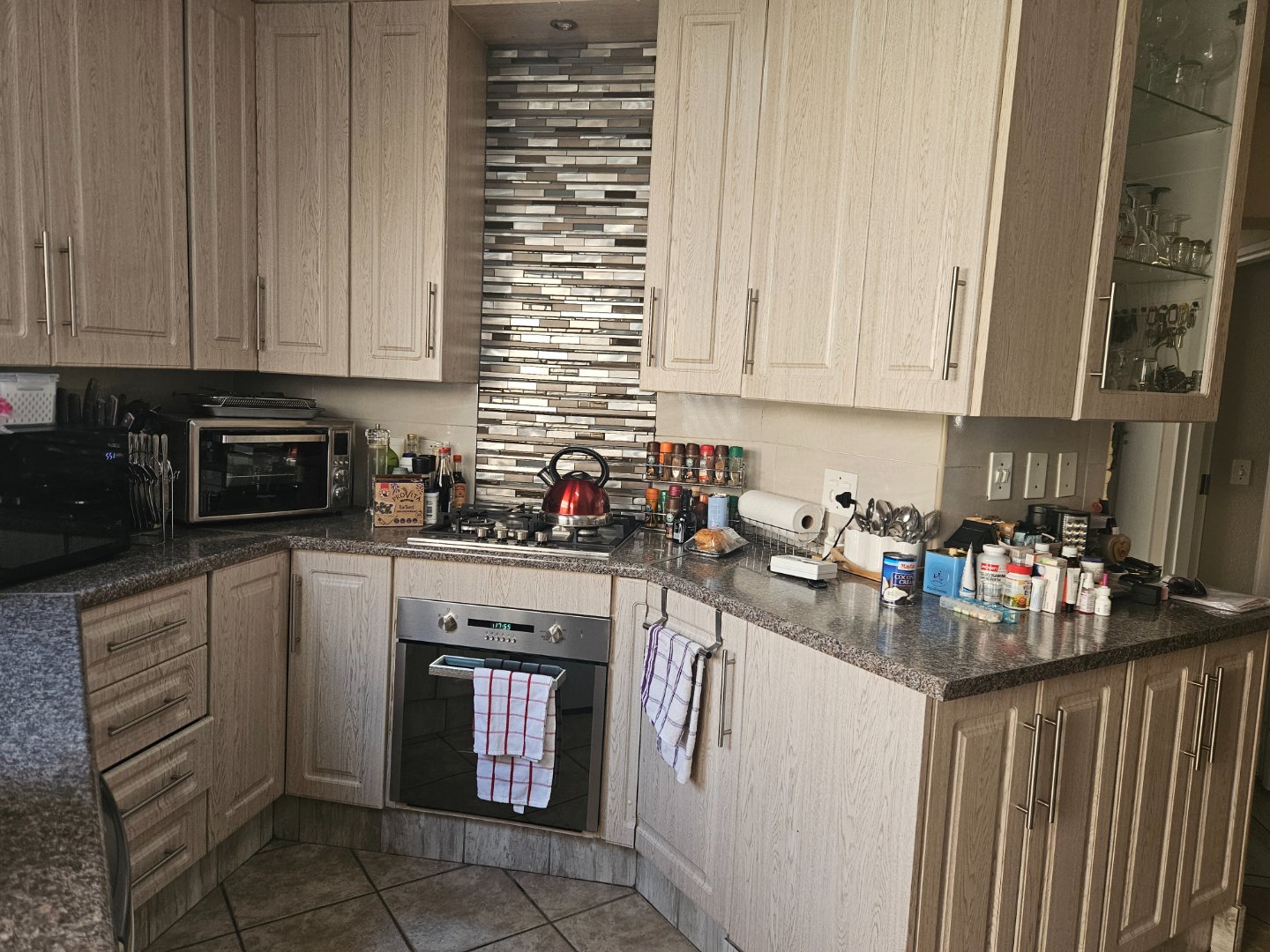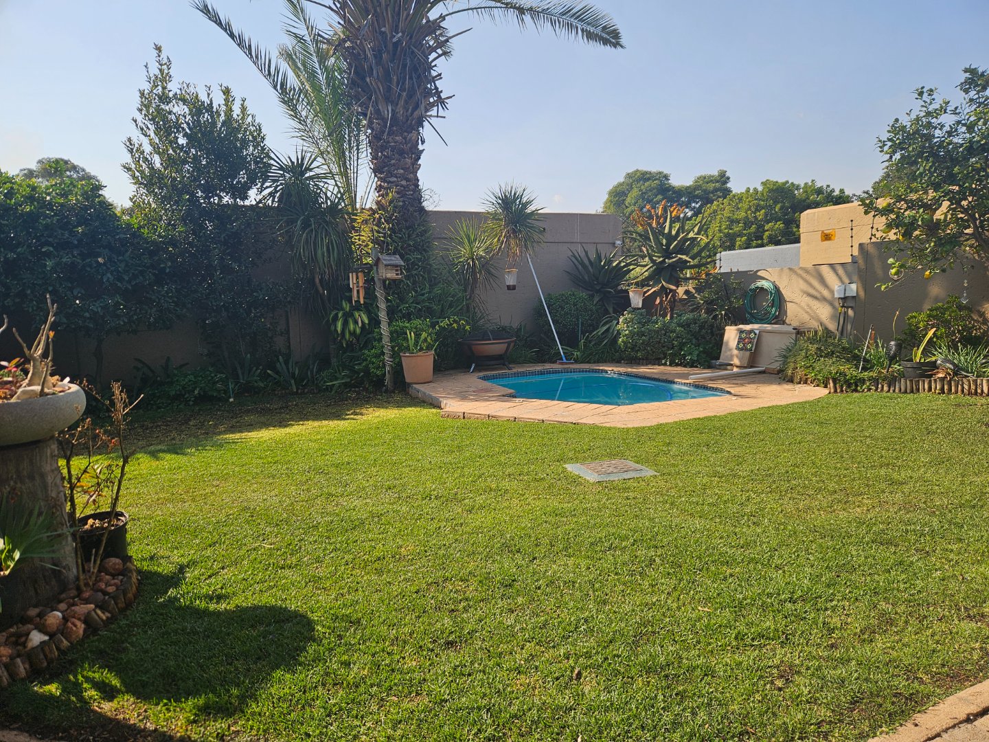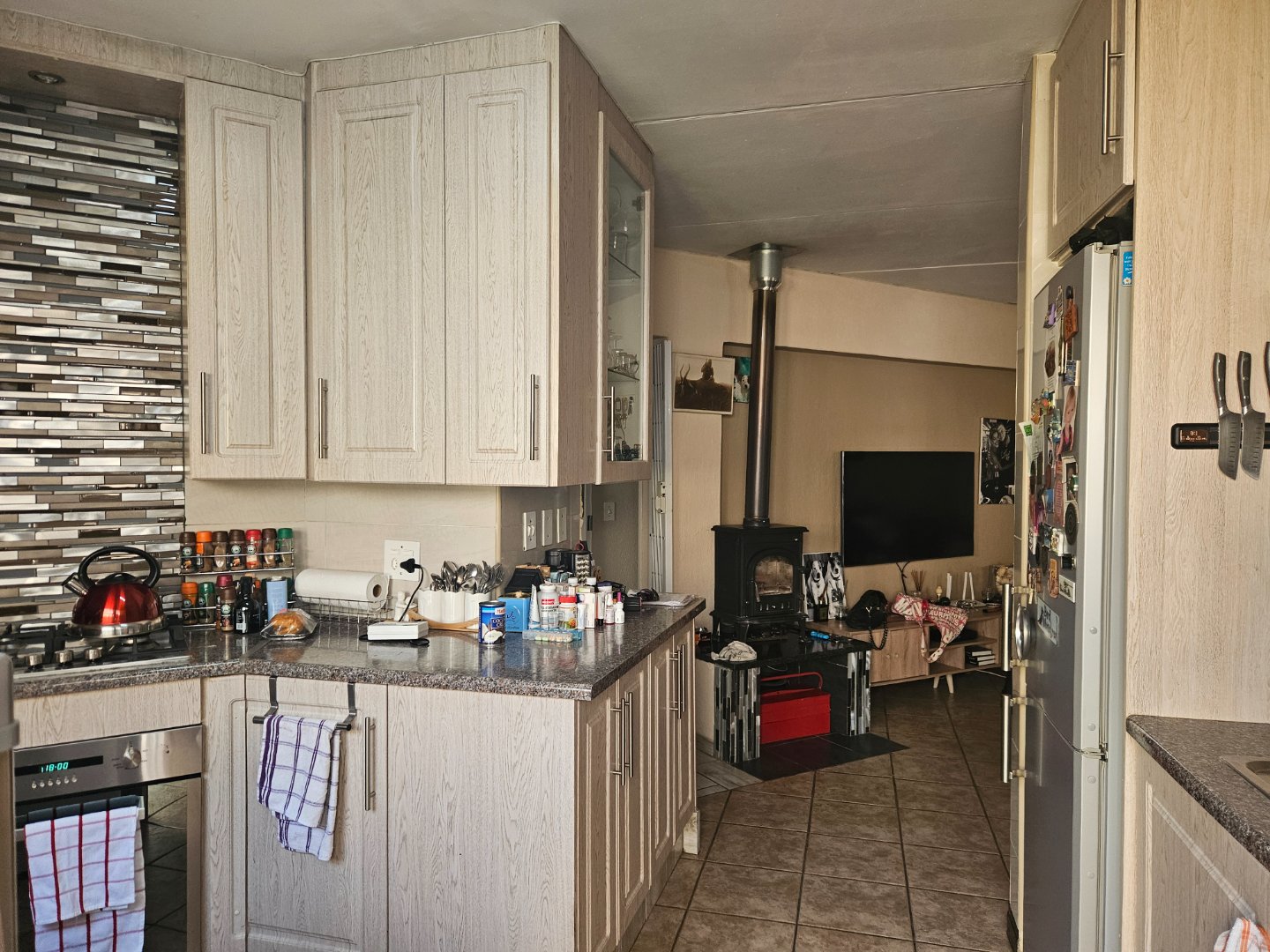 The lounge includes a cozy fireplace, while the modern kitchen is fitted with a gas hob, ample cupboard space, and room for two appliances. The home has aluminum windows throughout, a solar geyser with electric backup, and a gas supply stored in a secure cage. The double garage is motorized on one side and extended for extra space. The wraparound garden is beautifully landscaped, featuring a borehole, 5,000L water tank, big blue filtration system, and pressure pump.
