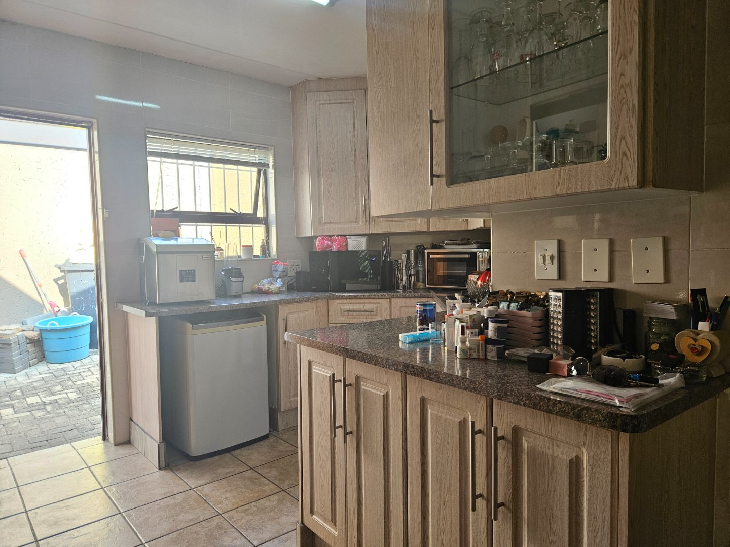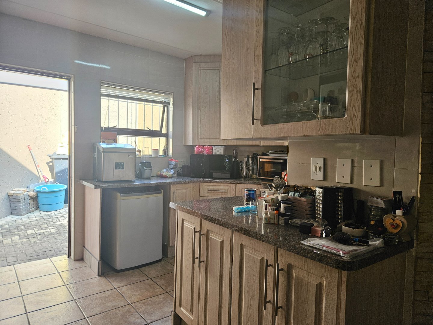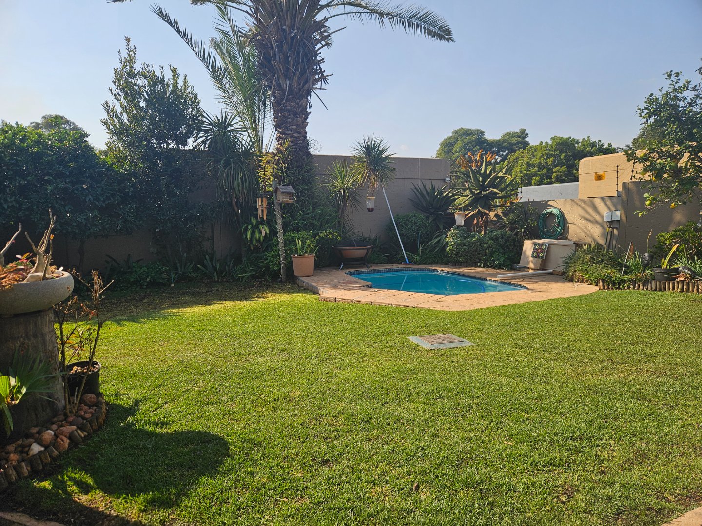 The lounge includes a cozy fireplace, while the modern kitchen is fitted with a gas hob, ample cupboard space, and room for two appliances. The home has aluminum windows throughout, a solar geyser with electric backup, and a gas supply stored in a secure cage. The double garage is motorized on one side and extended for extra space. The wraparound garden is beautifully landscaped, featuring a borehole, 5,000L water tank, big blue filtration system, and pressure pump.