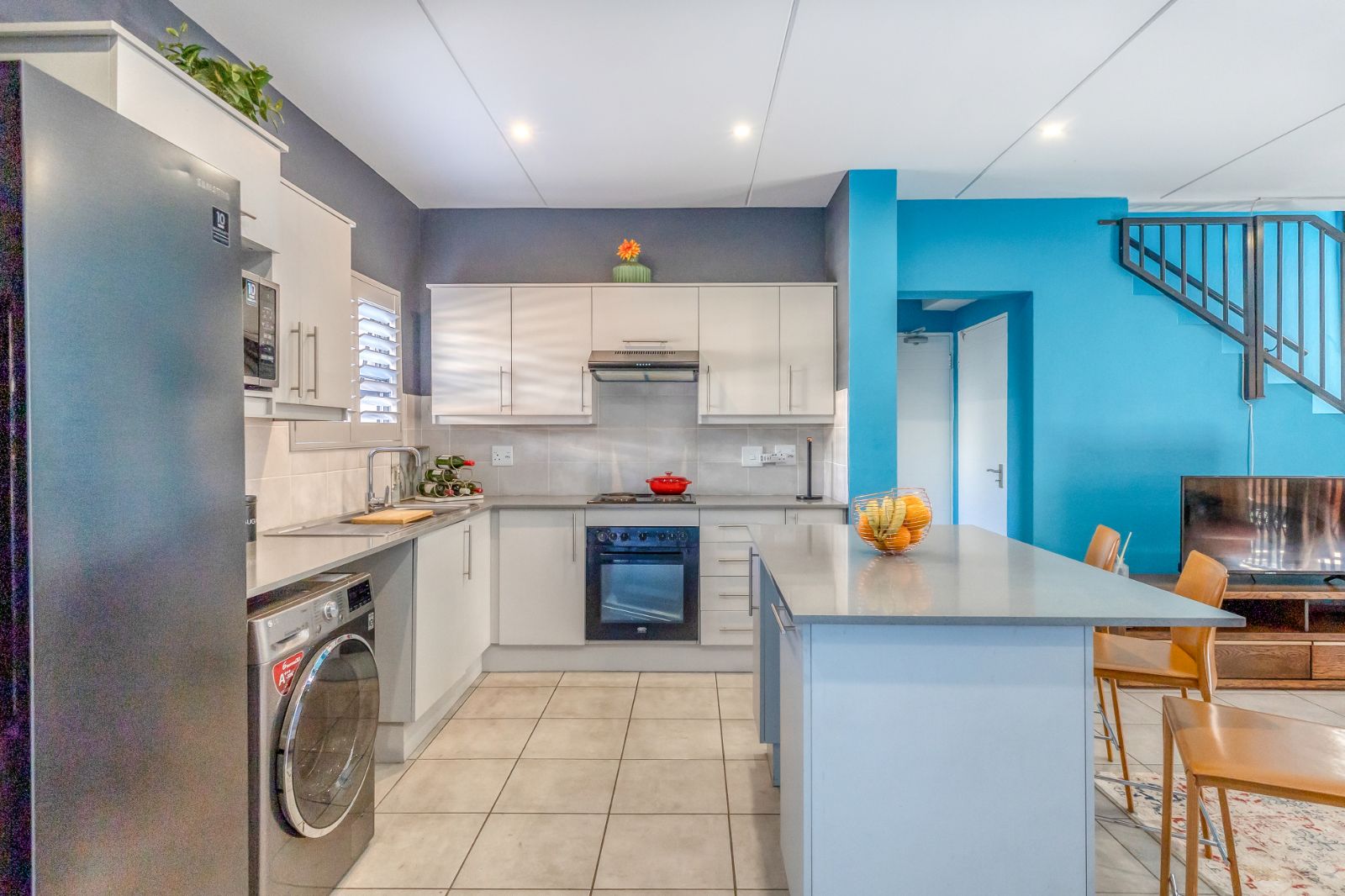 At the heart of the home lies a stunning kitchen, where Caeaserstone countertops, ample cabinetry, and a central island set the tone for both functionality and flair. The kitchen accommodates two under-counter appliances, a double door fridge, and features an under-counter oven and hob – making it a dream space for home chefs and entertainers alike.