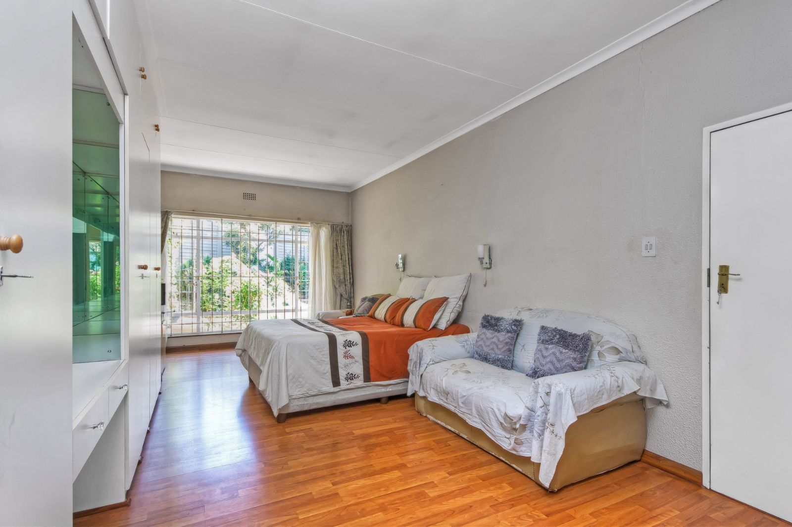 A well equipped kitchen offers ample cupboard space, double door fridge space, stove, extractor, double eye level oven and a separate walk-in pantry. The backdoor opens to a private functional area. At the rear you’ll find a cottage or staff quarters with a separate small gate providing direct access to the complex for convenience.