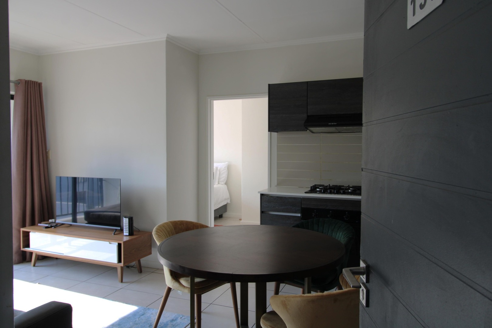 The bedroom is en-suite with only a shower and is situated to the left of the kitchen, while the remaining bedrooms and bathroom are located to the right of the kitchen and dining area.