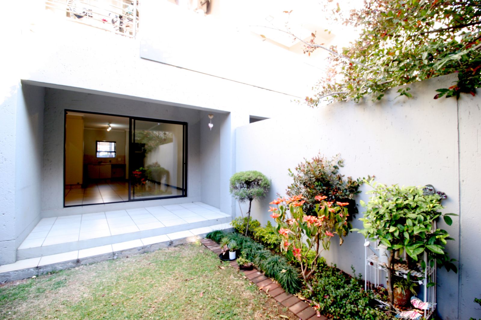 The open-plan living area leads out to a private and beautifully manicured garden, providing an ideal space for relaxation, outdoor dining, and entertaining.