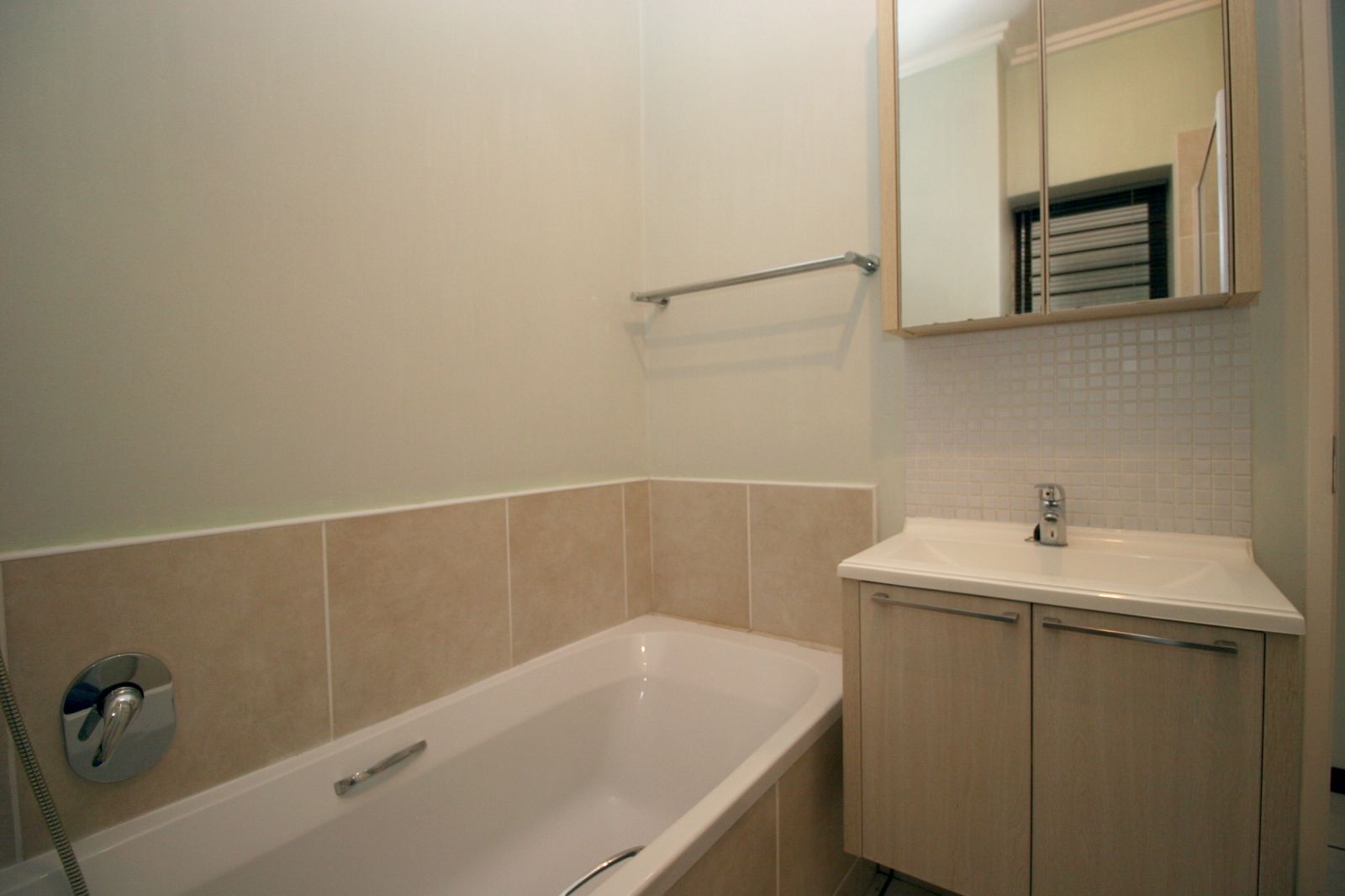 The kitchen has a modern feel, fitted with Caesarstone countertops. There is space for a washing machine and dishwasher.