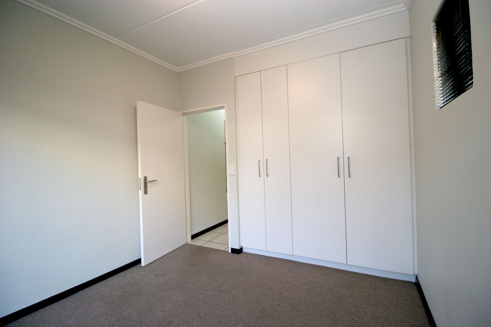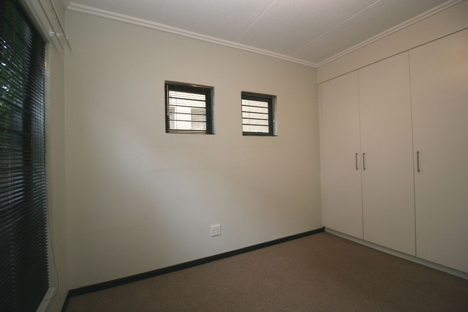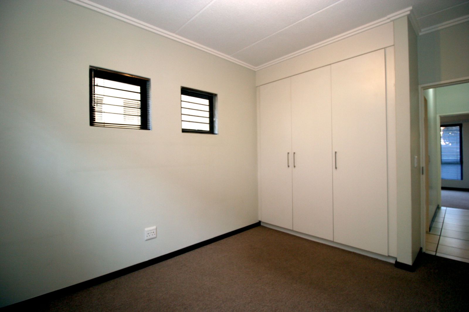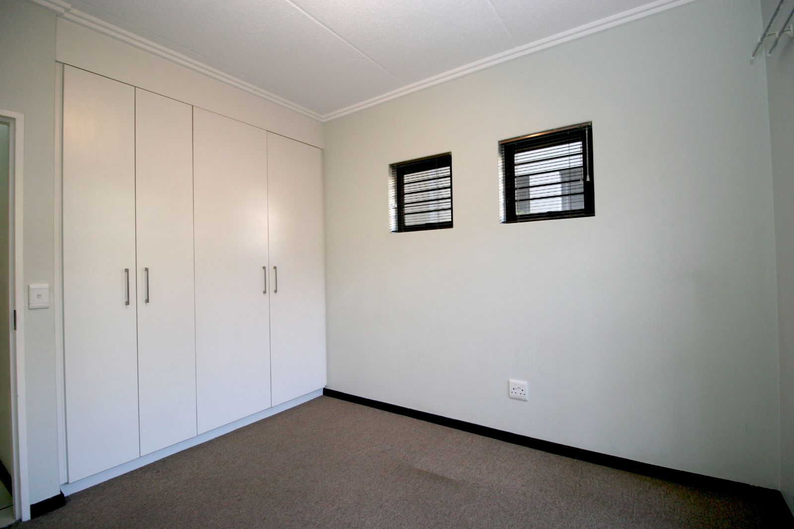 The bedrooms are spacious, fitted with carpets, and both offer ample cupboard space.