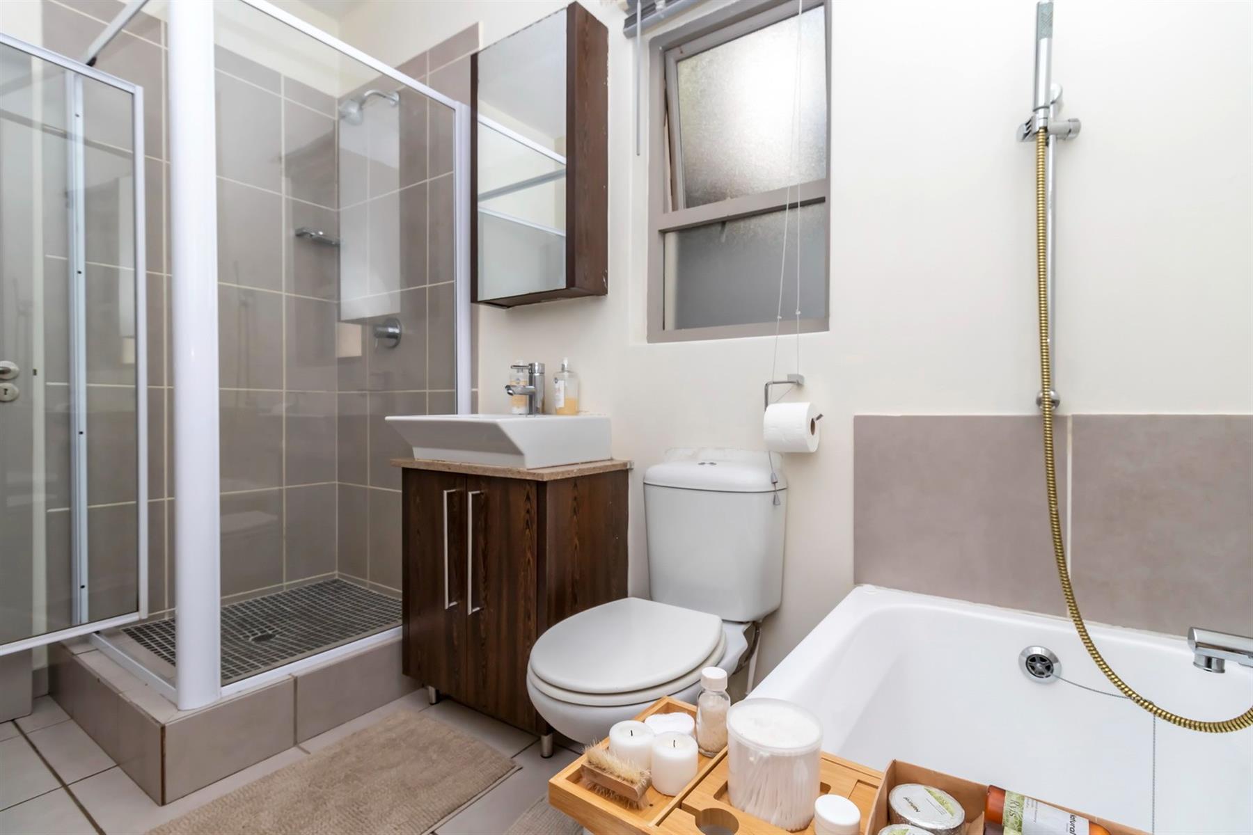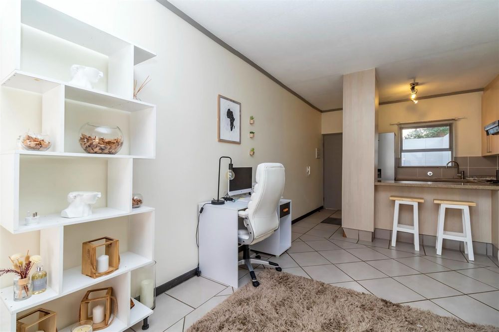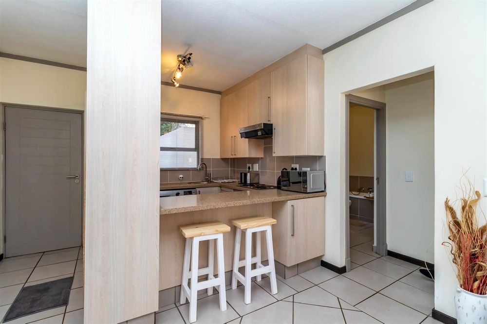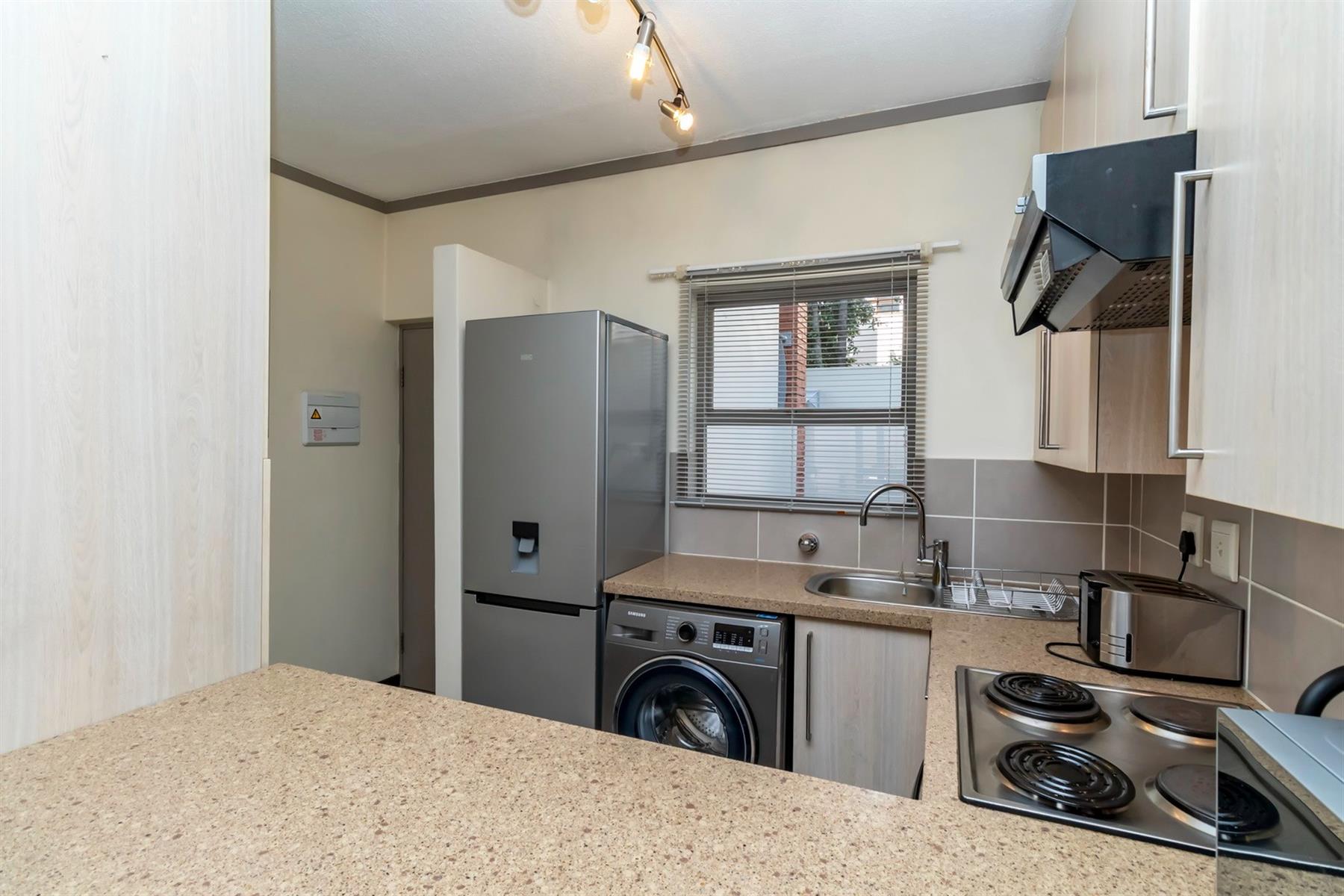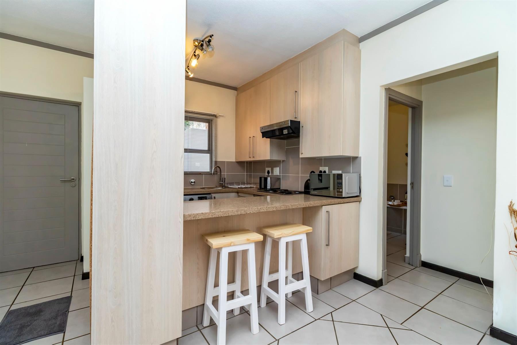 The bathroom is neatly appointed with a shower, bathtub, and stylish vanity. The kitchen, part of the open-plan layout, offers decent cupboard space, room for a single-door fridge, and space for one under-counter appliance. The lounge area is roomy enough to include a small dining nook and opens onto a covered patio overlooking the garden - perfect for entertaining or enjoying meals outdoors.