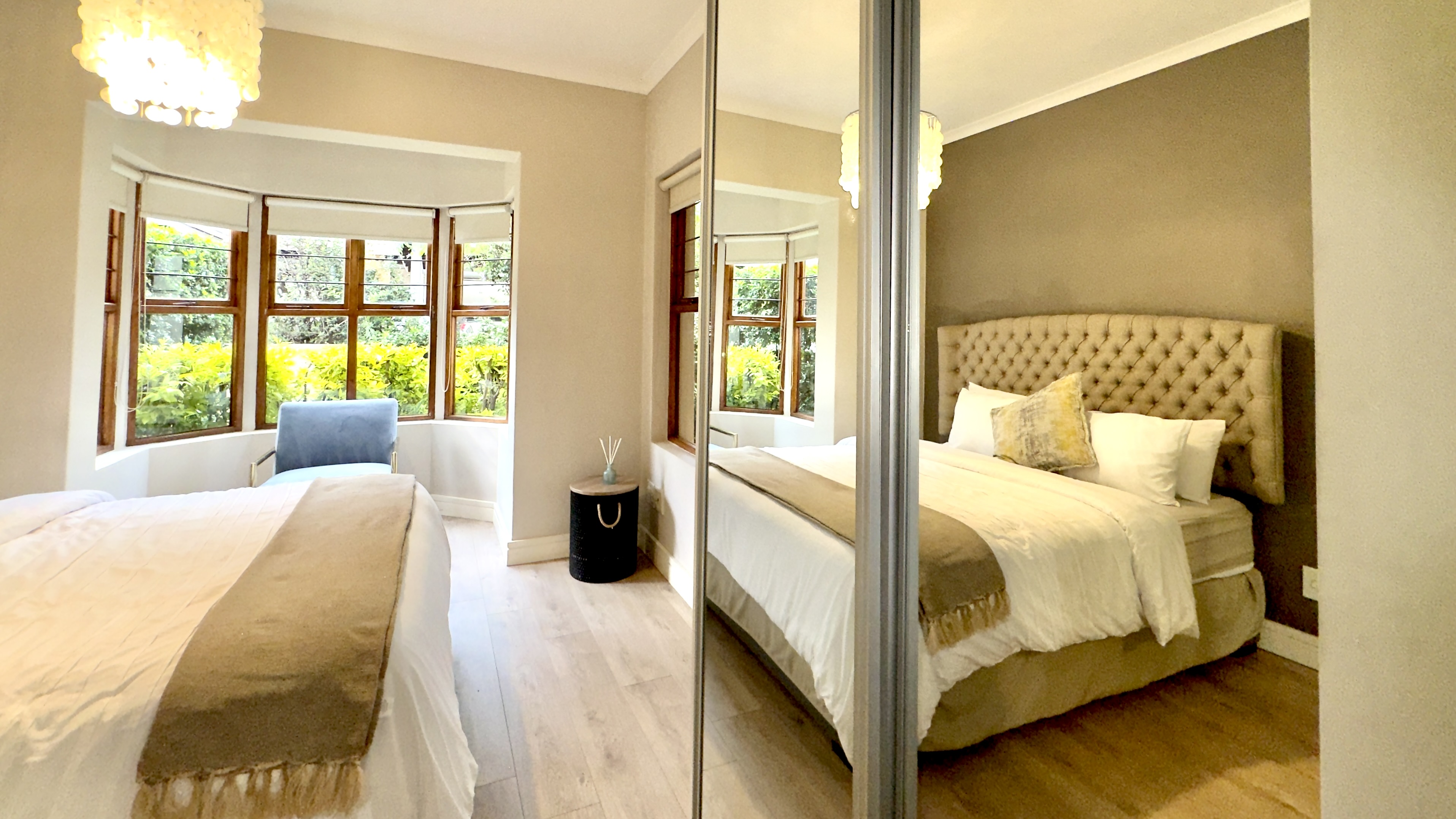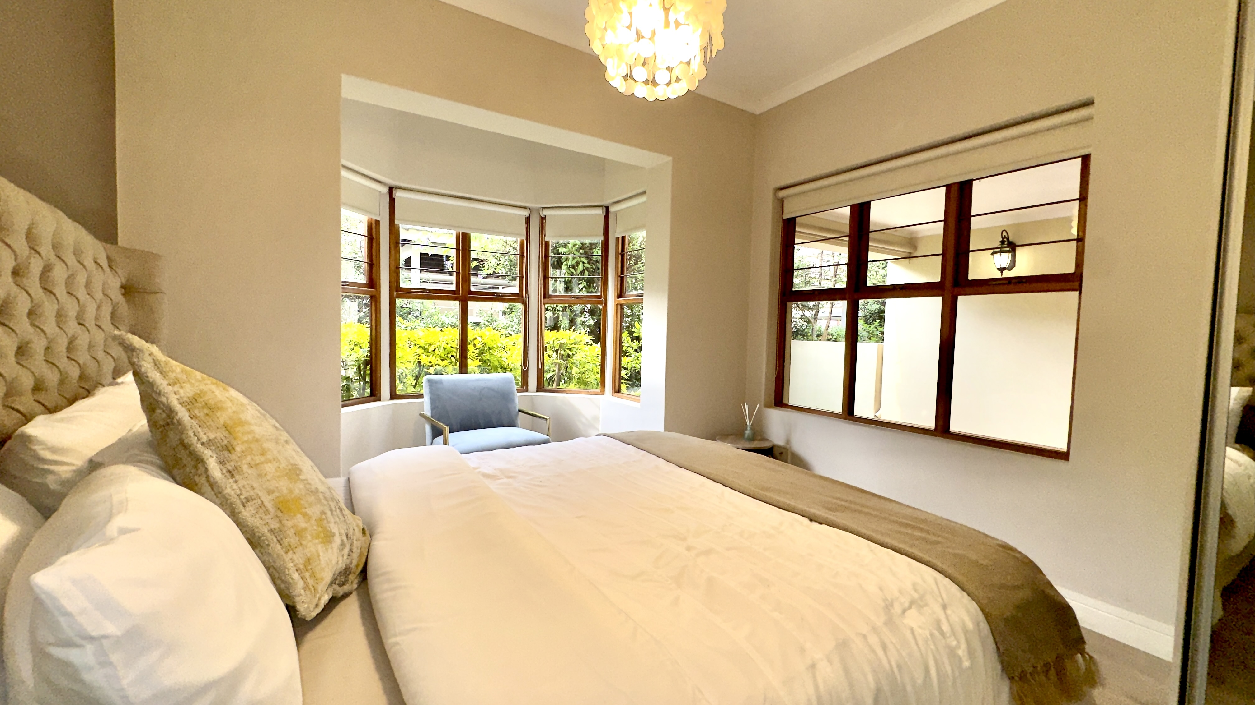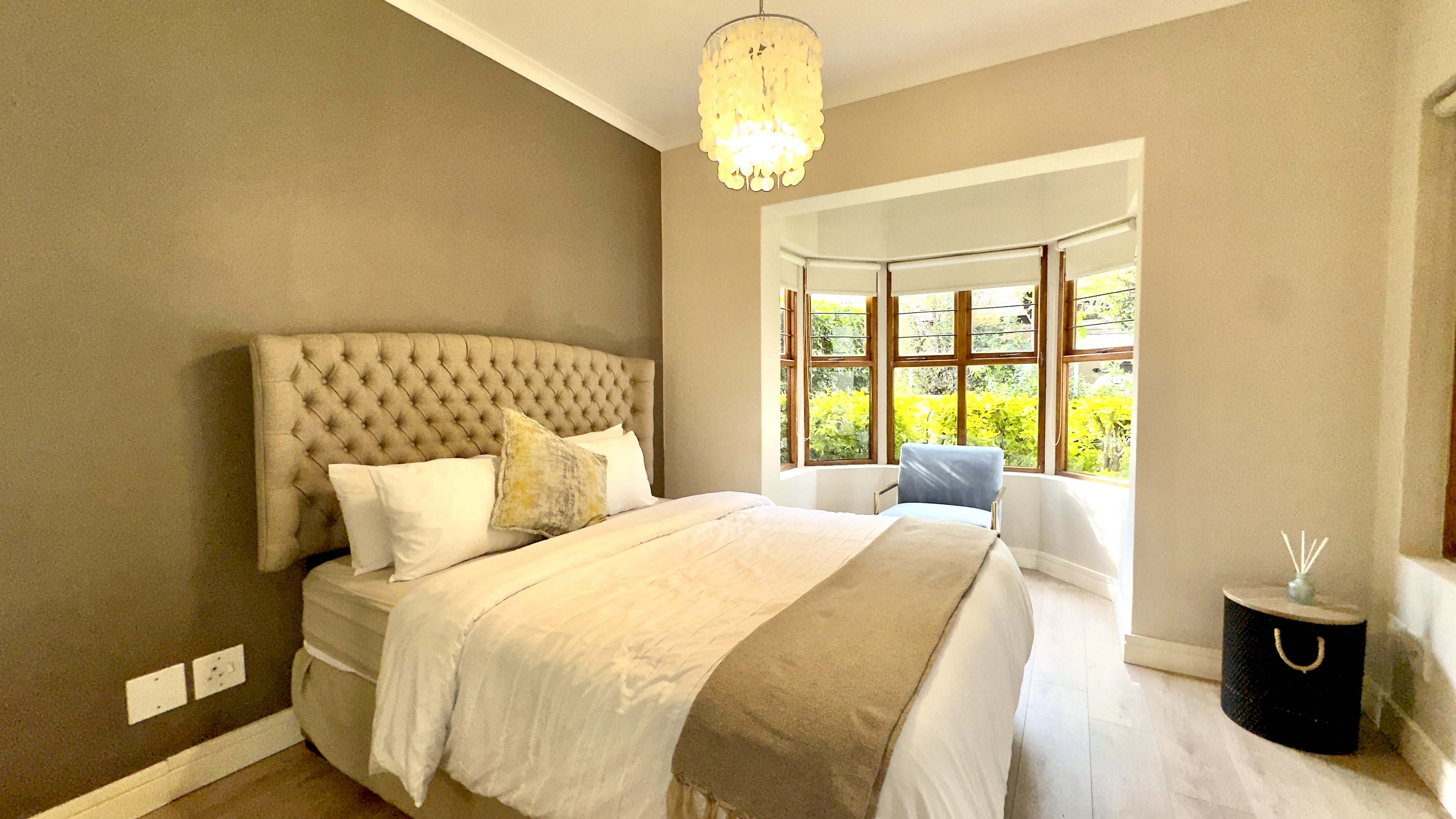Main Bedroom: Queen bed, linen, chair