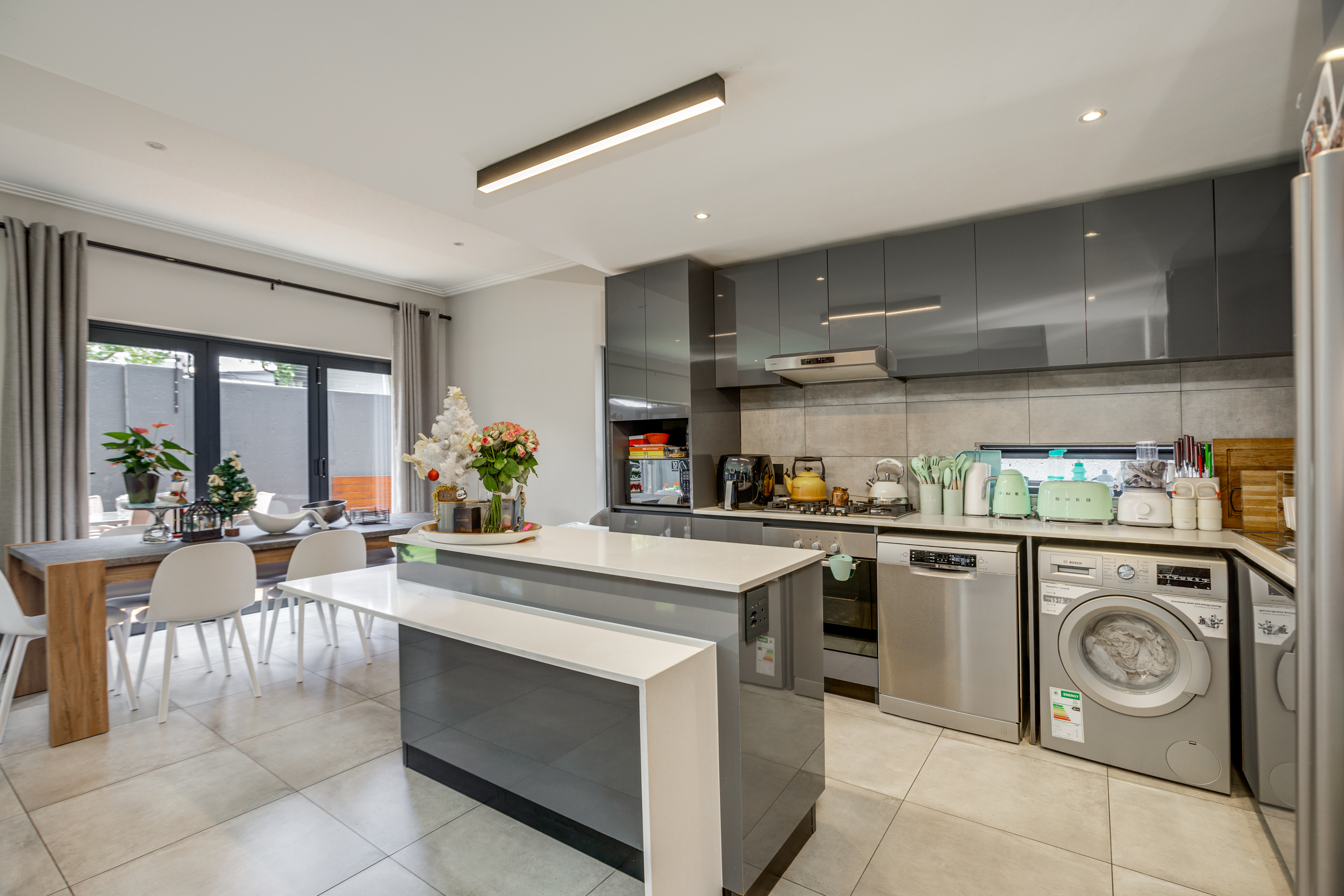 The elegant open-plan living and dining area flows effortlessly to the outdoors through full stack doors, creating a seamless indoor–outdoor lifestyle ideal for both everyday living and entertaining. The designer kitchen is finished to a high standard and fitted with a gas hob, perfectly suited to modern, sophisticated living. Outside, a well-designed entertainment area overlooks the garden and wooden deck, offering the perfect setting for hosting guests or enjoying quiet evenings at home.