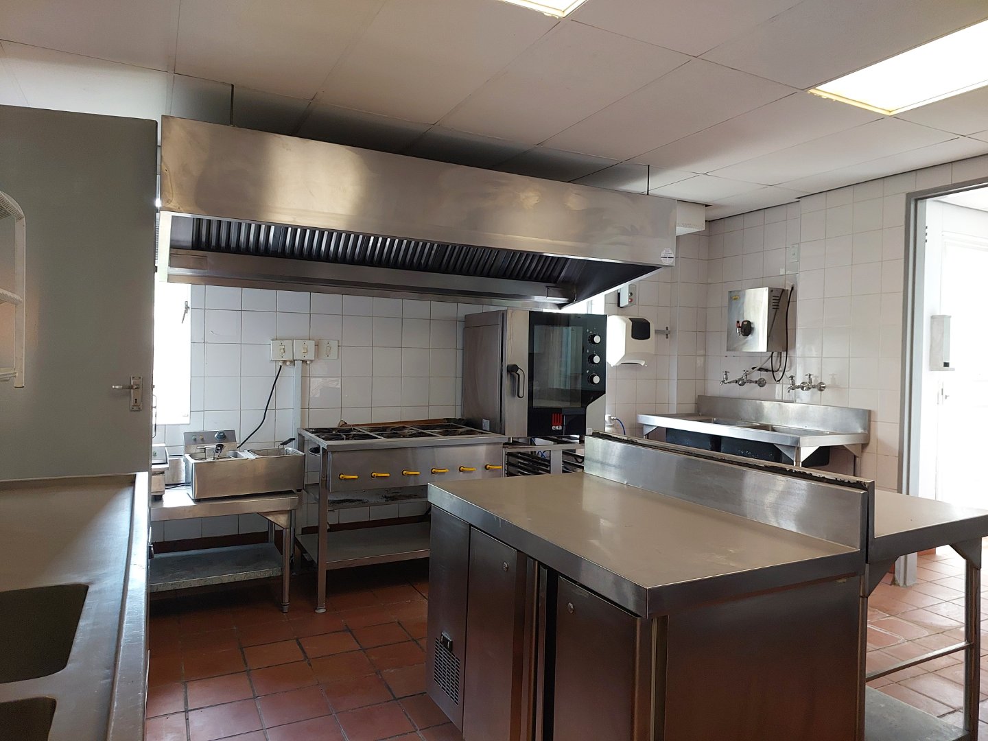 Fully fitted canteen with a fully equipped kitchen, bar, and entertainment area opening onto an outdoor patio and garden area