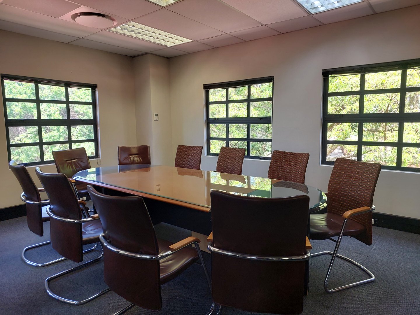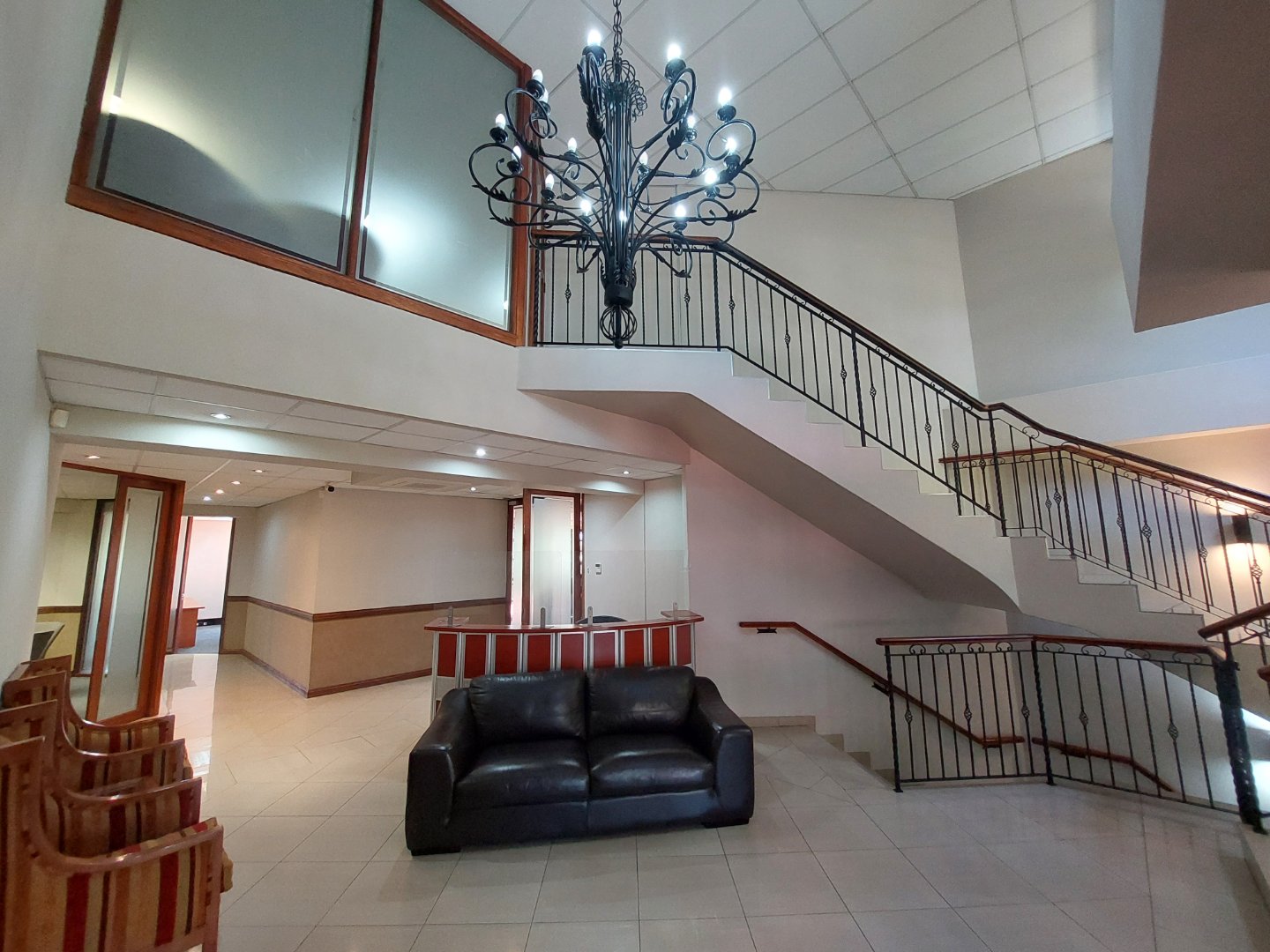 The ground floor boasts an impressive double-volume reception area leading to a large boardroom, meeting room, two management offices, and a spacious open-plan area. A highlight of the building is the generous entertainment patio extending from the ground floor offices, offering beautiful views of the landscaped gardens and mature trees—perfect for client functions or staff breaks.