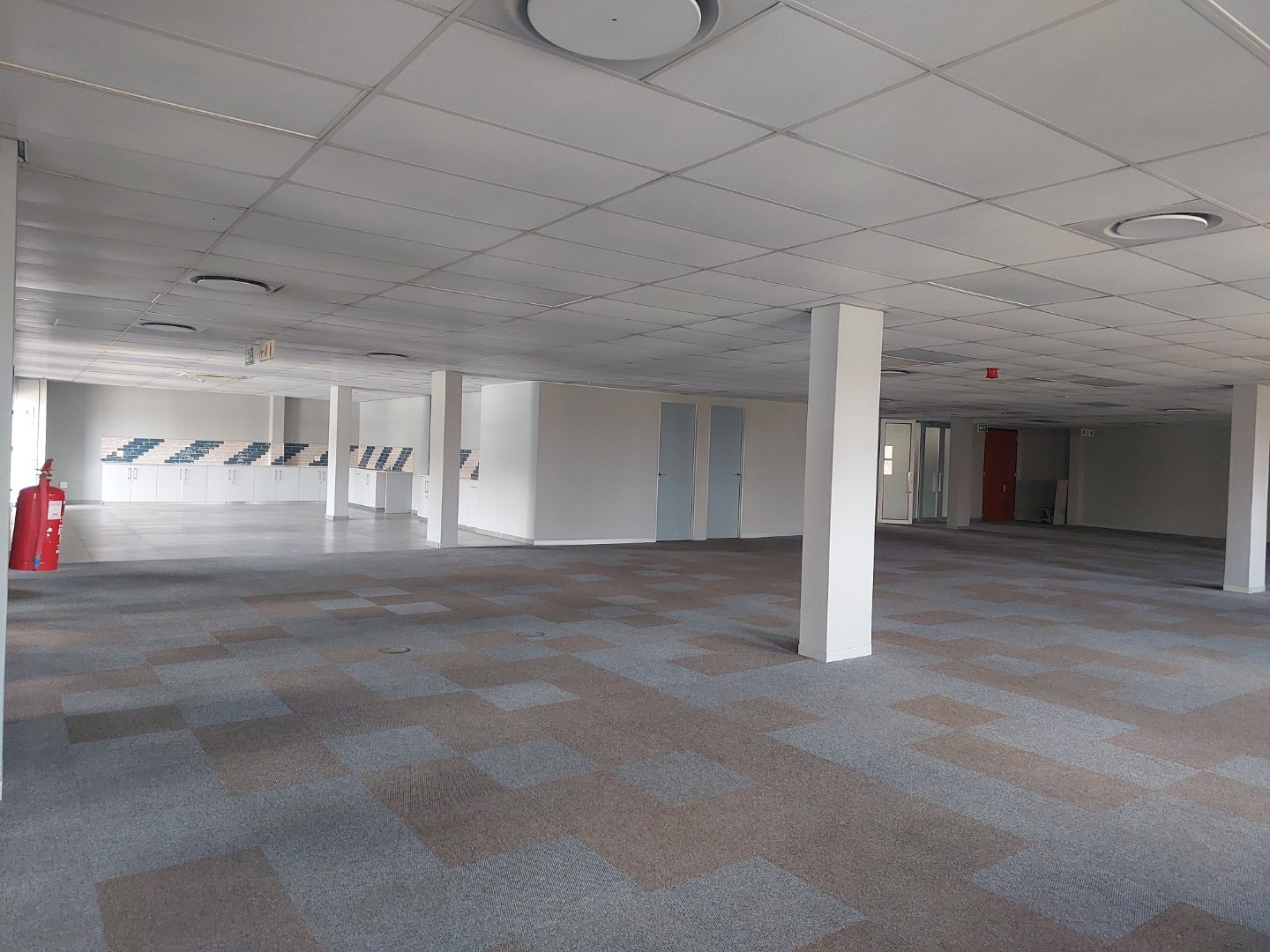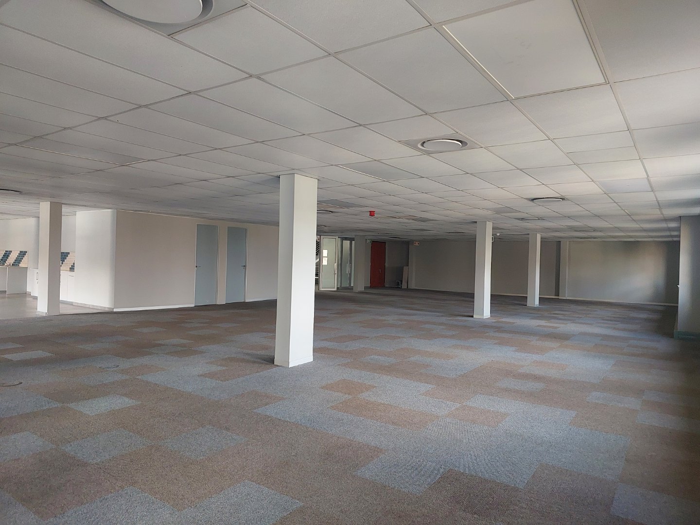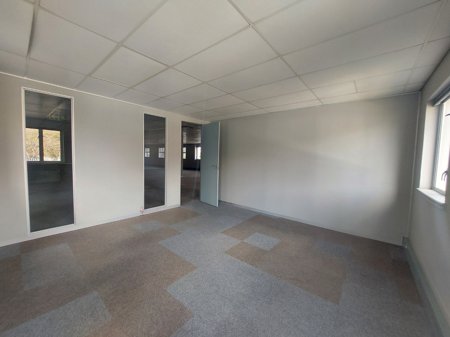 Through double glass doors, you enter a spacious, carpeted open-plan office area that receives abundant natural light, creating a bright and welcoming environment. The space includes a large kitchen and canteen area that opens onto a private outdoor patio, ideal for staff breaks or informal meetings. The layout also offers a sizeable boardroom or training room, a management office, and a store or server room.
