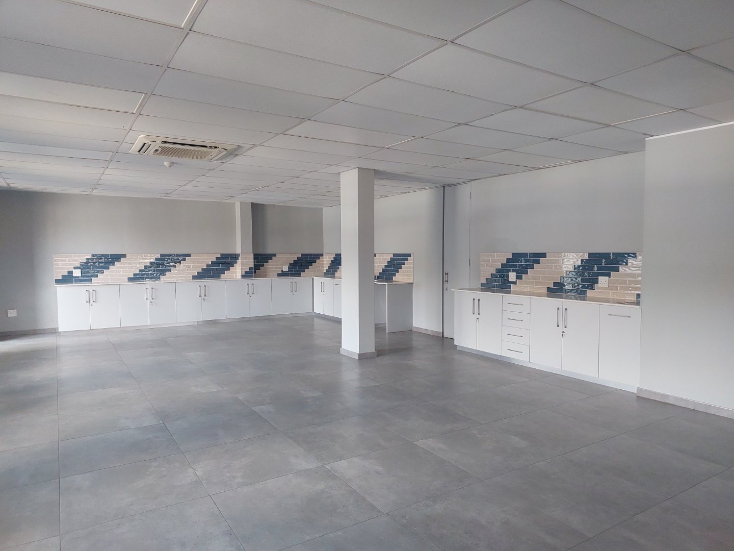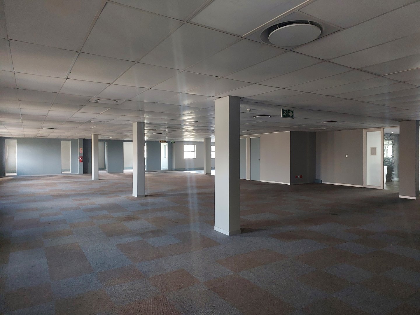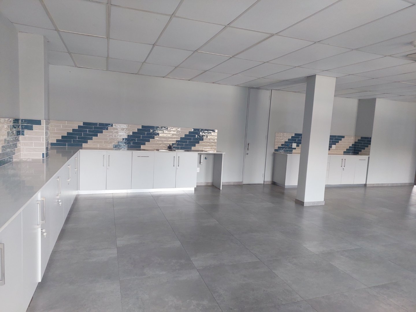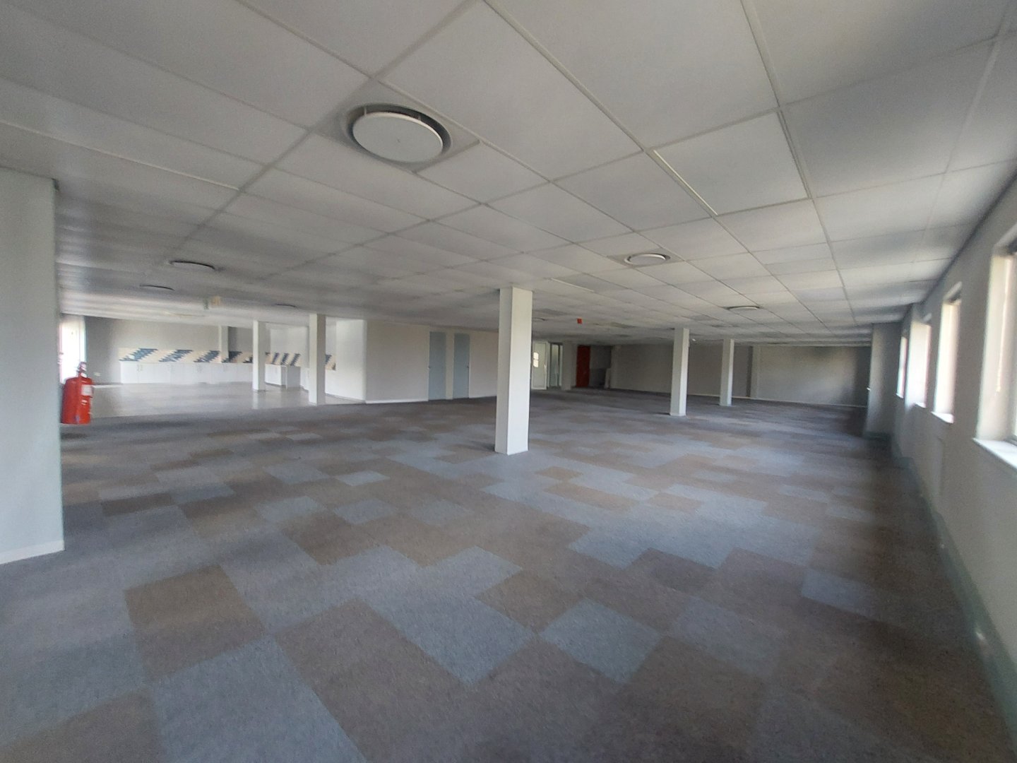 Through double glass doors, you enter a spacious, carpeted open-plan office area that receives abundant natural light, creating a bright and welcoming environment. The space includes a large kitchen and canteen area that opens onto a private outdoor patio, ideal for staff breaks or informal meetings. The layout also offers a sizeable boardroom or training room, a management office, and a store or server room.
