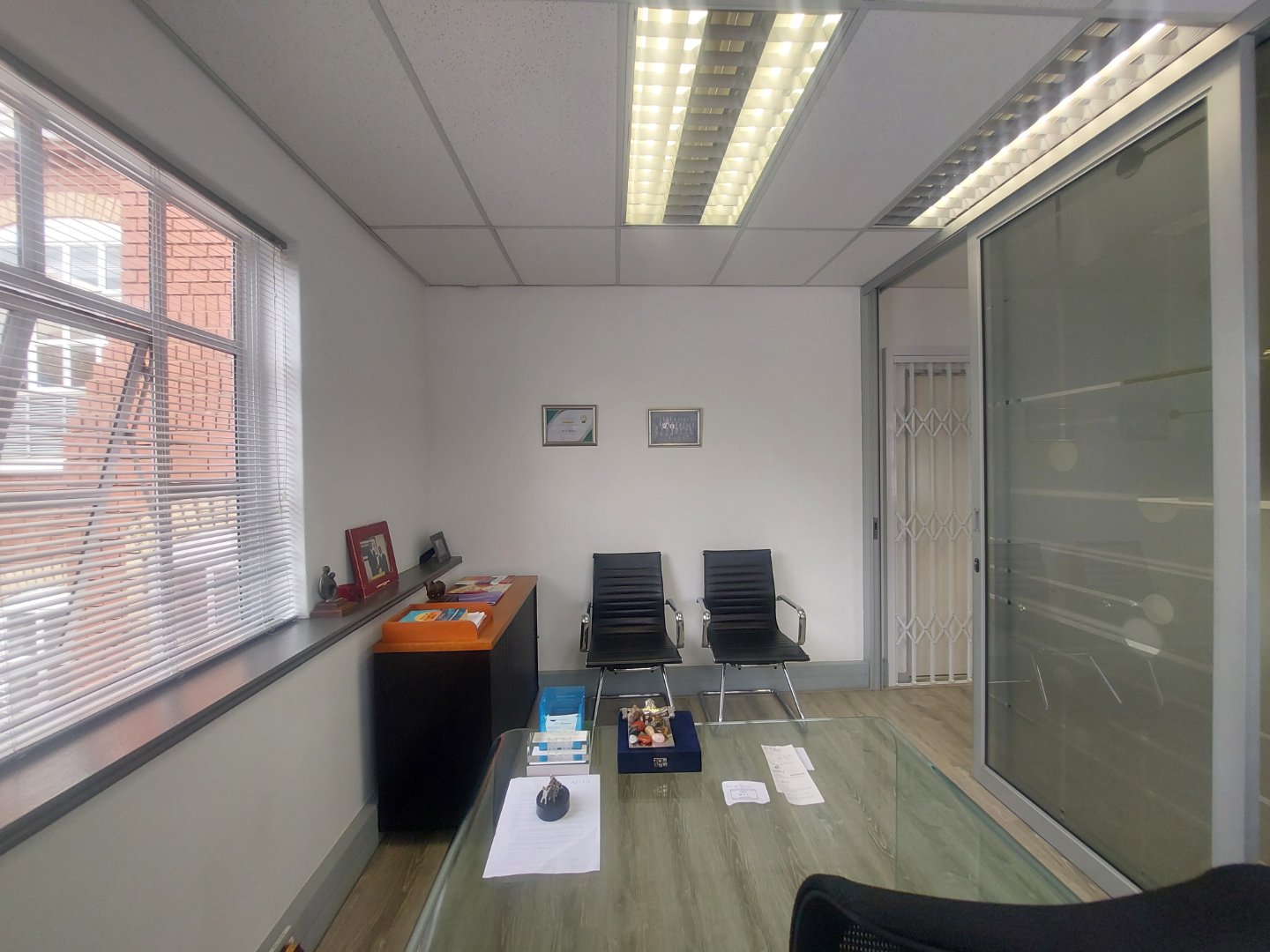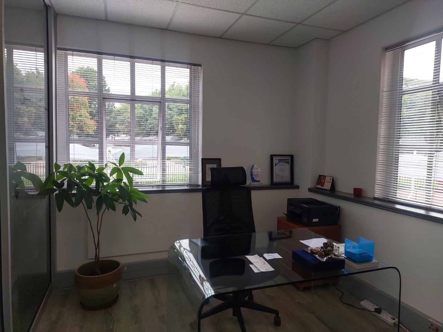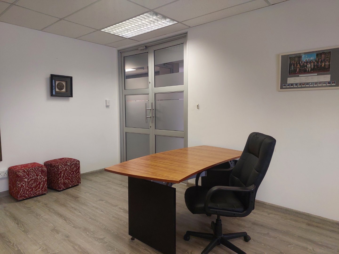 This A-Grade first-floor office in Bryanston offers a light, bright, and modern workspace with an excellent fit-out that includes laminate flooring, glass partitions, a welcoming reception area, a boardroom, a management office, and an open-plan area.