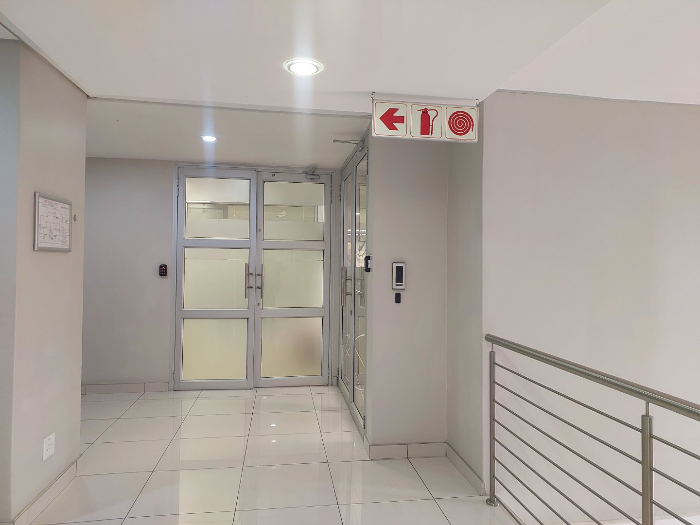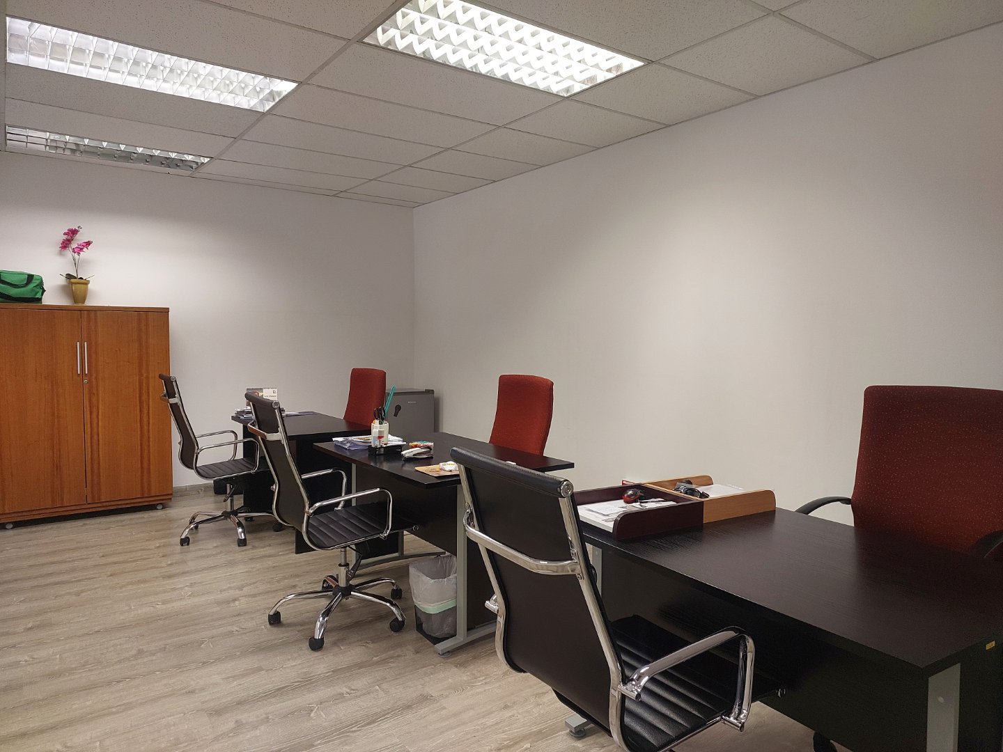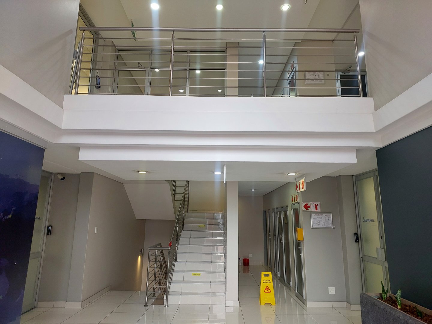 This A-Grade first-floor office in Bryanston offers a light, bright, and modern workspace with an excellent fit-out that includes laminate flooring, glass partitions, a welcoming reception area, a boardroom, a management office, and an open-plan area.