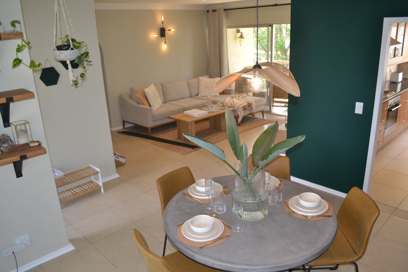 Tiled open plan lounge and dining area