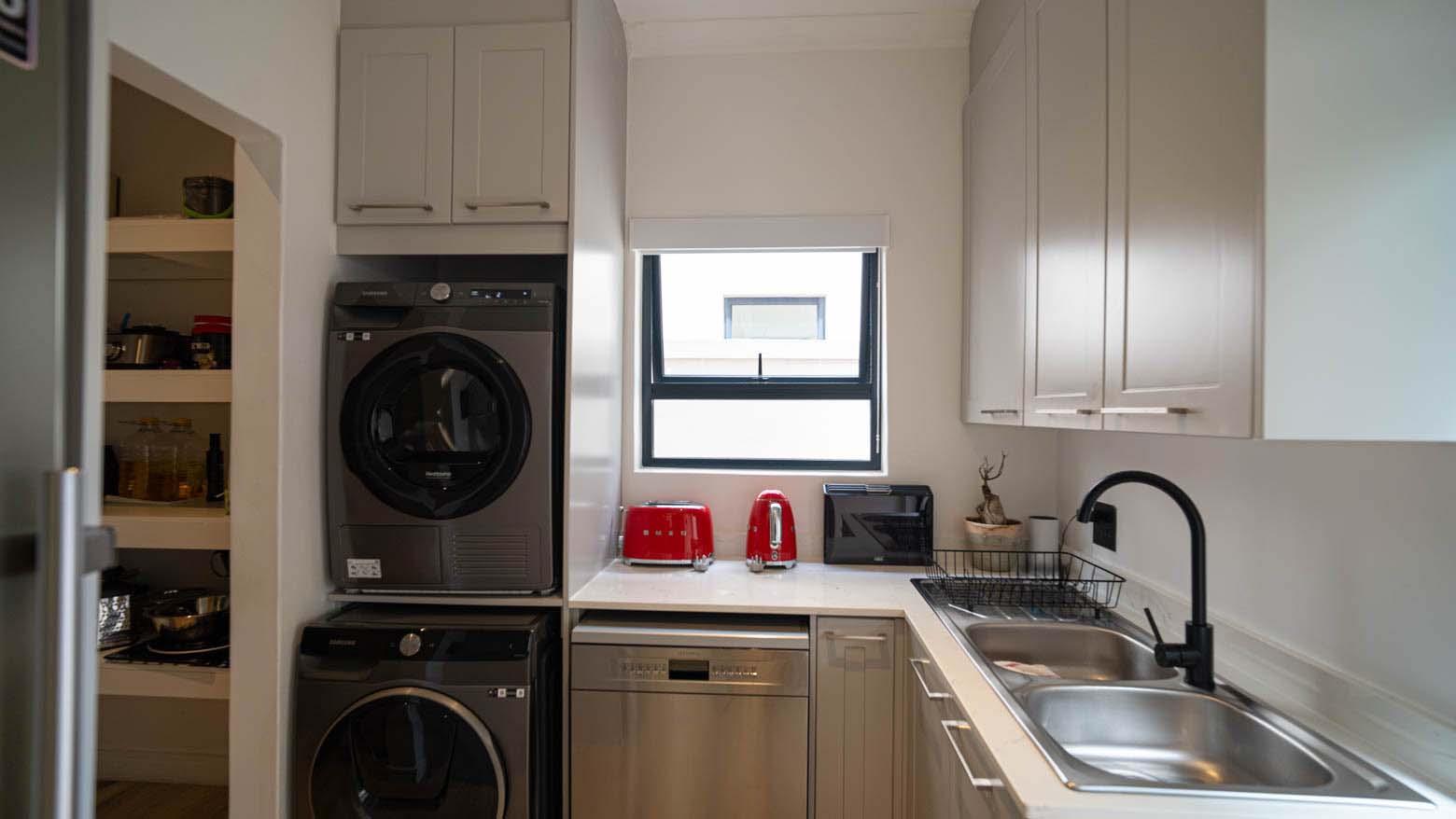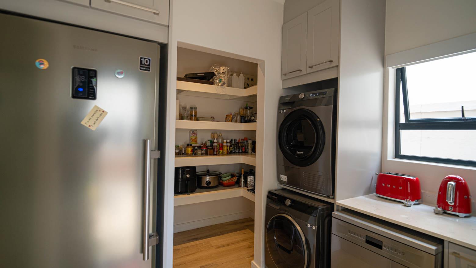 The kitchen is a standout feature, fitted with an induction stove and premium finishes. A concealed scullery and utility area is discreetly positioned behind the kitchen, ensuring clean lines and effortless functionality. A dedicated wine cellar adds a further touch of luxury.
