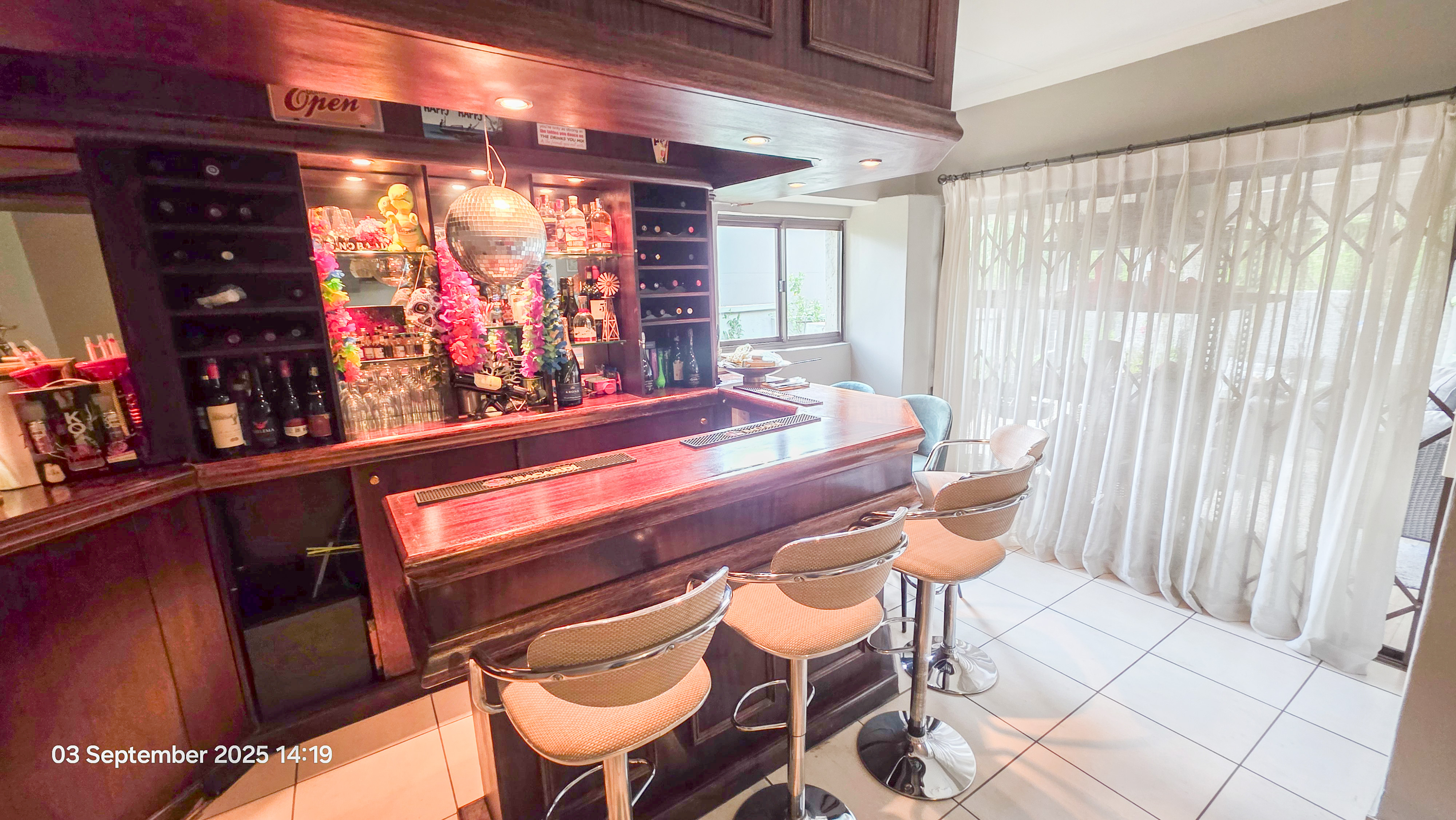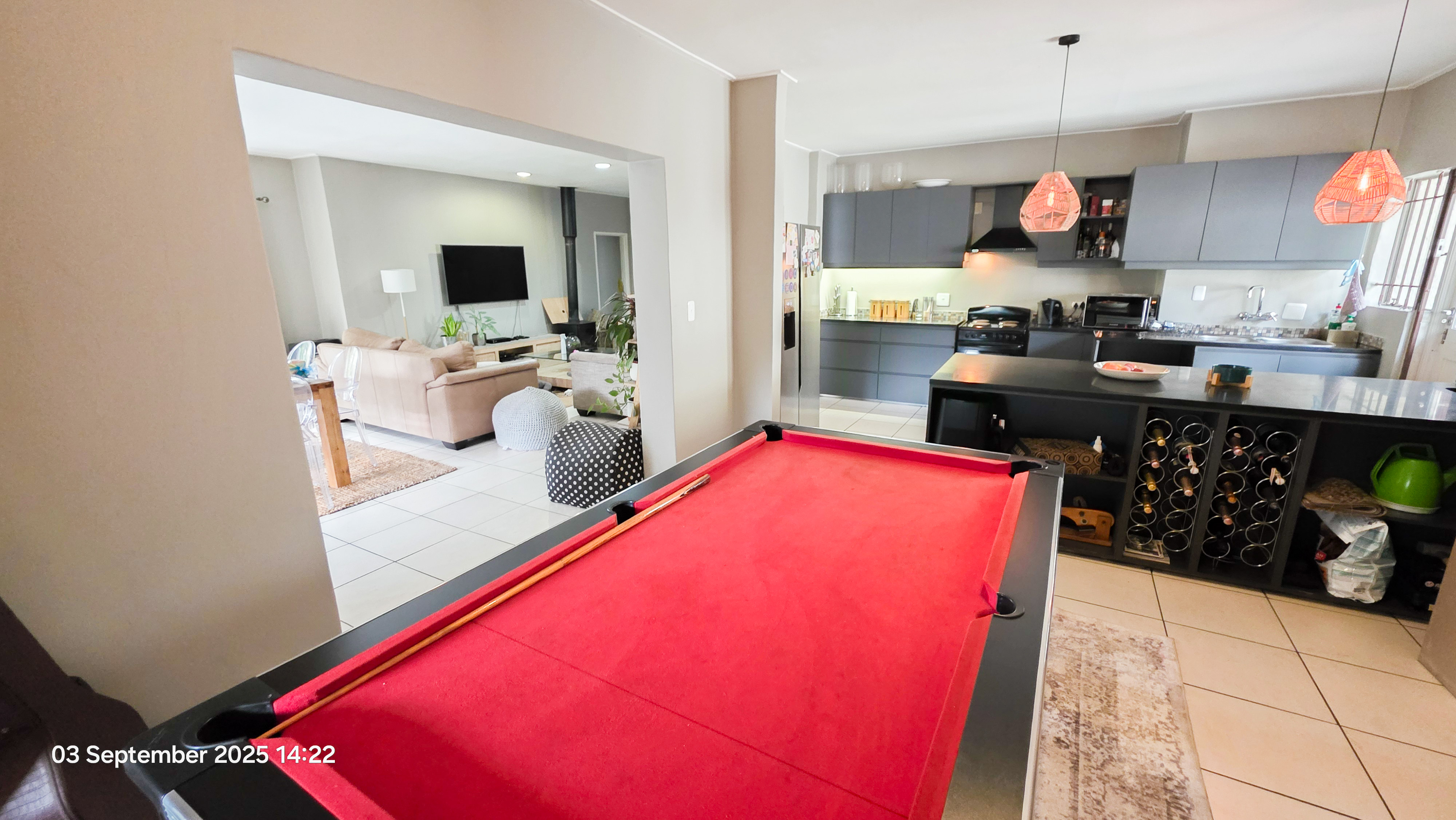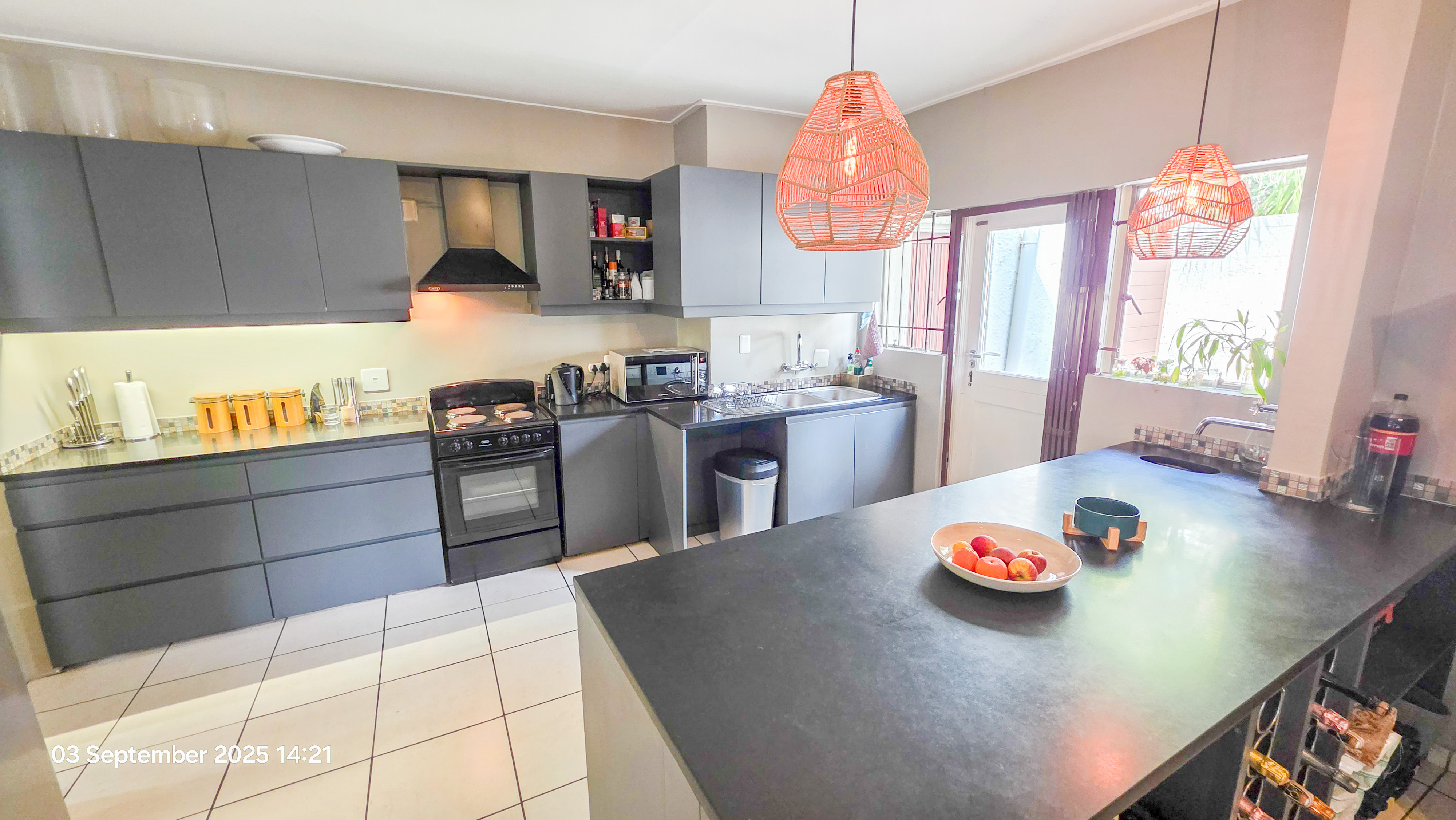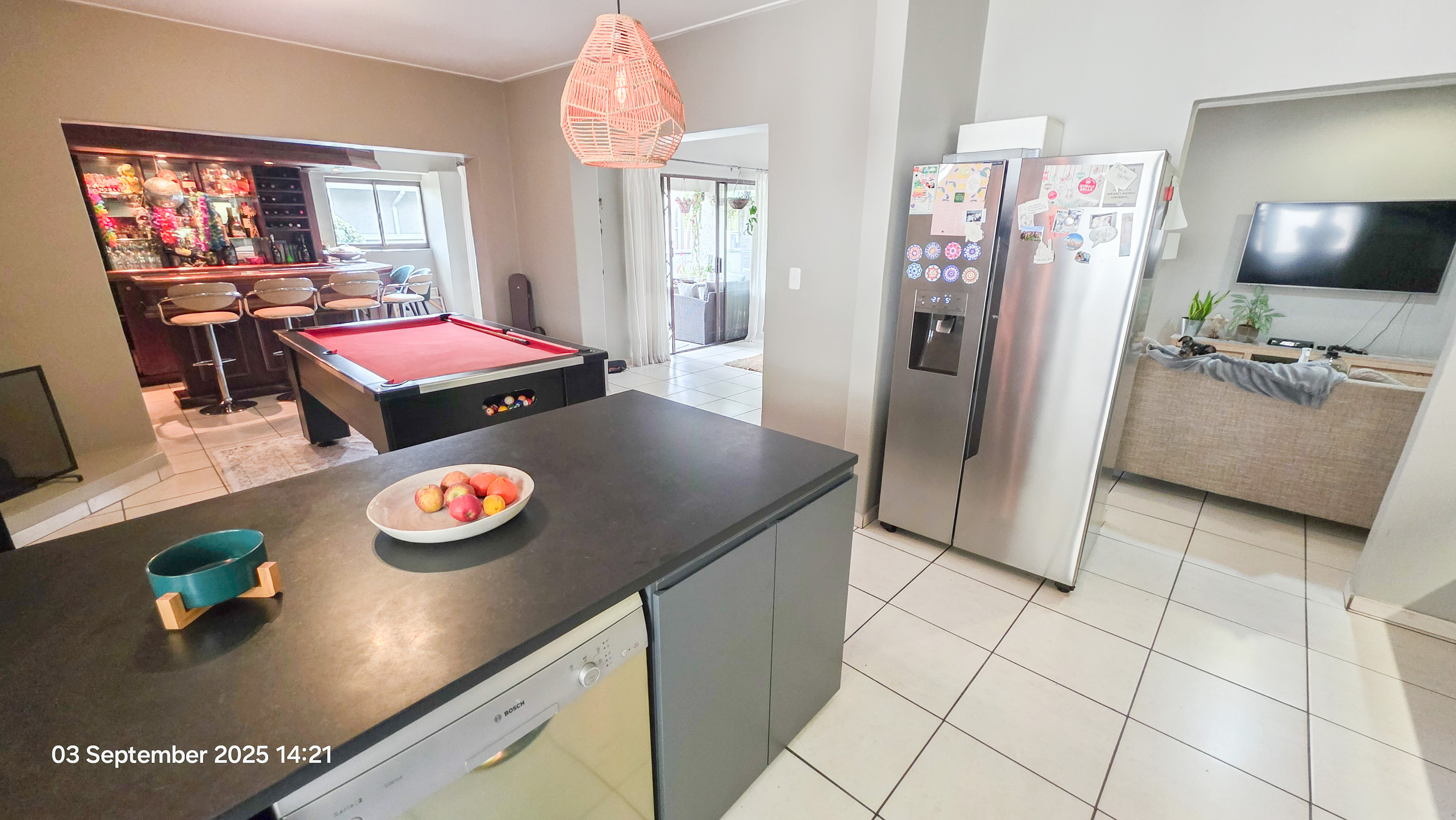 Kitchen with ample cupboards, granite tops that leads to a built-in bar for your entertainment needs