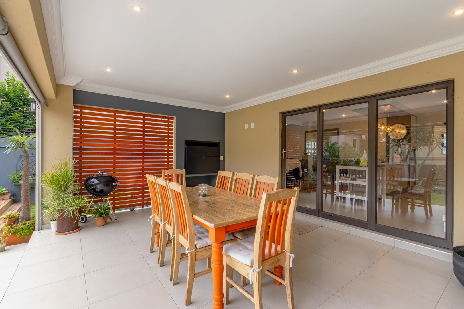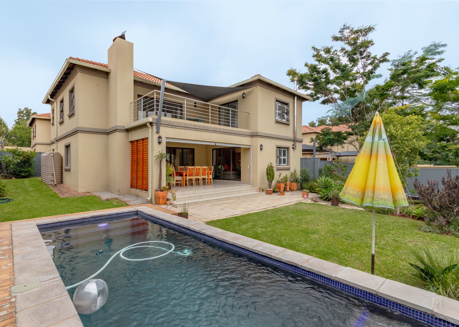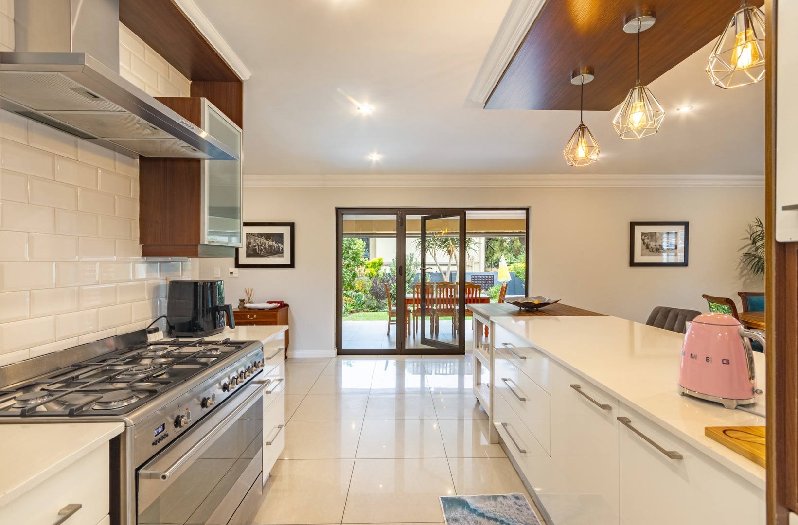 Situated in a secure, intimate estate of just six homes, this beautifully designed residence offers the perfect blend of modern elegance and natural tranquility. The open-plan kitchen, complete with a separate scullery, flows seamlessly through stacking doors to a covered patio—ideal for effortless entertaining. Beyond the patio, a sparkling pool is framed by a meticulously maintained, fully indigenous garden, designed for low maintenance and year-round beauty.