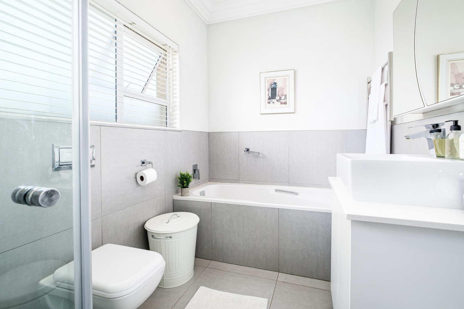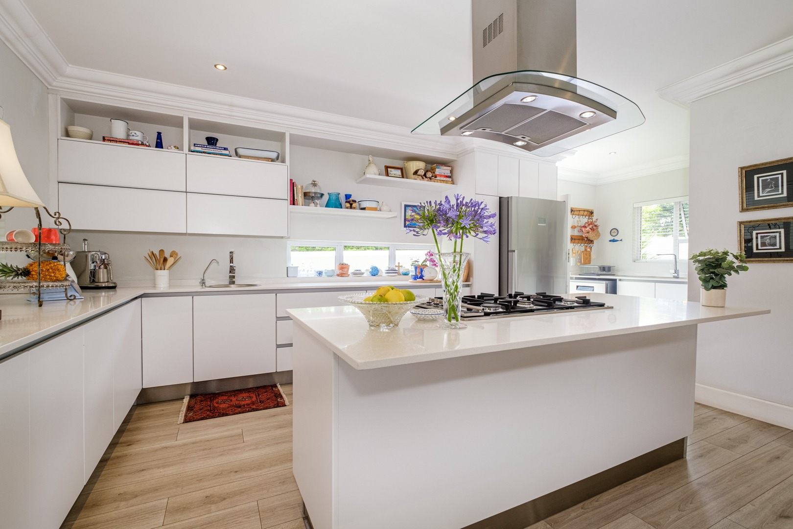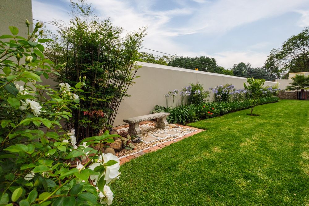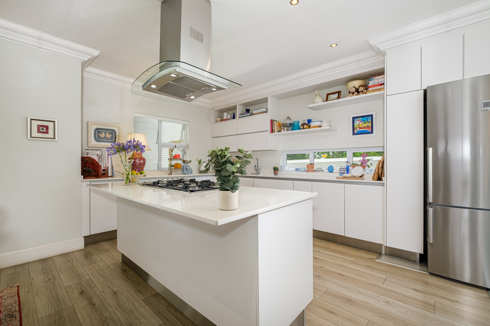 The gourmet kitchen with its top-of-the-range gas hob, breakfast nook, and Caesarstone tops awaits the most discerning of chefs. The glass sliding doors leading to the tiled patio with LED lighting allows for seamless indoor-outdoor living, where you can unwind or entertain with ease, all while enjoying stunning views of the beautiful landscaped garden with it's fountain and view full of established huge trees, full of incredible bird life.