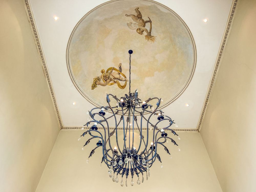 Upon arrival, a magnificent, expansive front courtyard welcomes you, providing ample parking for up to six vehicles. A striking water feature adds to the grandeur, creating a serene ambiance that sets the tone for the exquisite interiors. Enter through the impressive double-volume entrance, where a hand-painted dome ceiling crowned with a towering chandelier captures the essence of classical Italian refinement