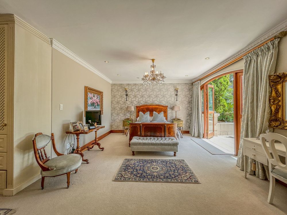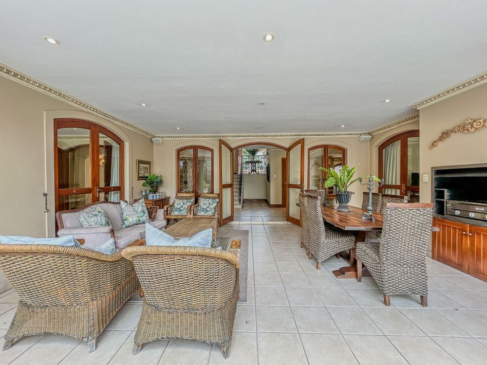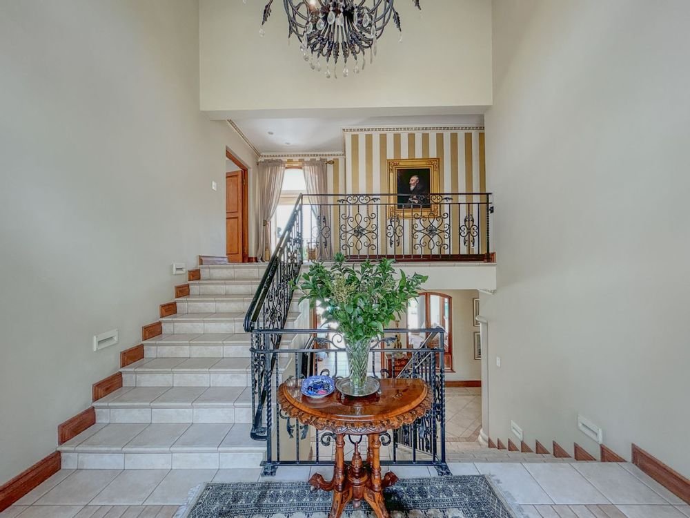 Descending the stately staircase, you are greeted by an expansive formal lounge and a sun-drenched family room. Pillars and double-height ceilings frame the space, while glass doors with wooden frames seamlessly merge the indoors with the picturesque gardens. A sophisticated fitted bar, adorned with rich dark wood, invites intimate gatherings, while a gas fireplace ensures warmth and ambiance during cooler months.