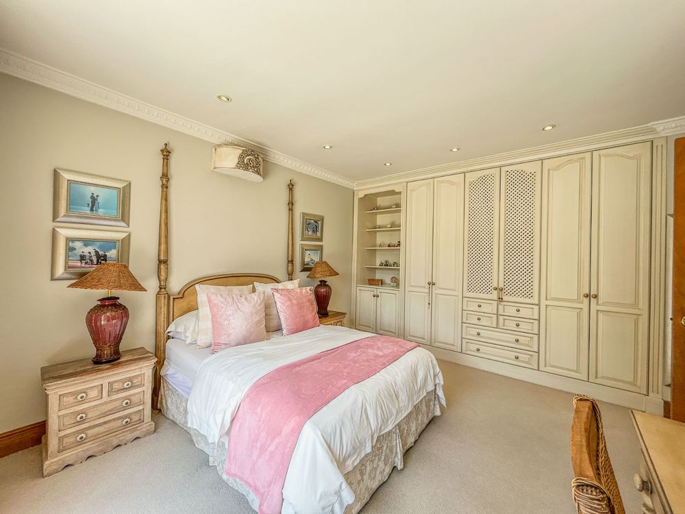 Adjacent to the living areas, an opulent formal dining room overlooks a secluded courtyard, complete with a tranquil water feature, offering an ideal setting for family dinners and elegant soirées. A spacious study, featuring custom-built dark wood cabinetry and ample storage, doubles as a guest bedroom, conveniently positioned next to a full bathroom.