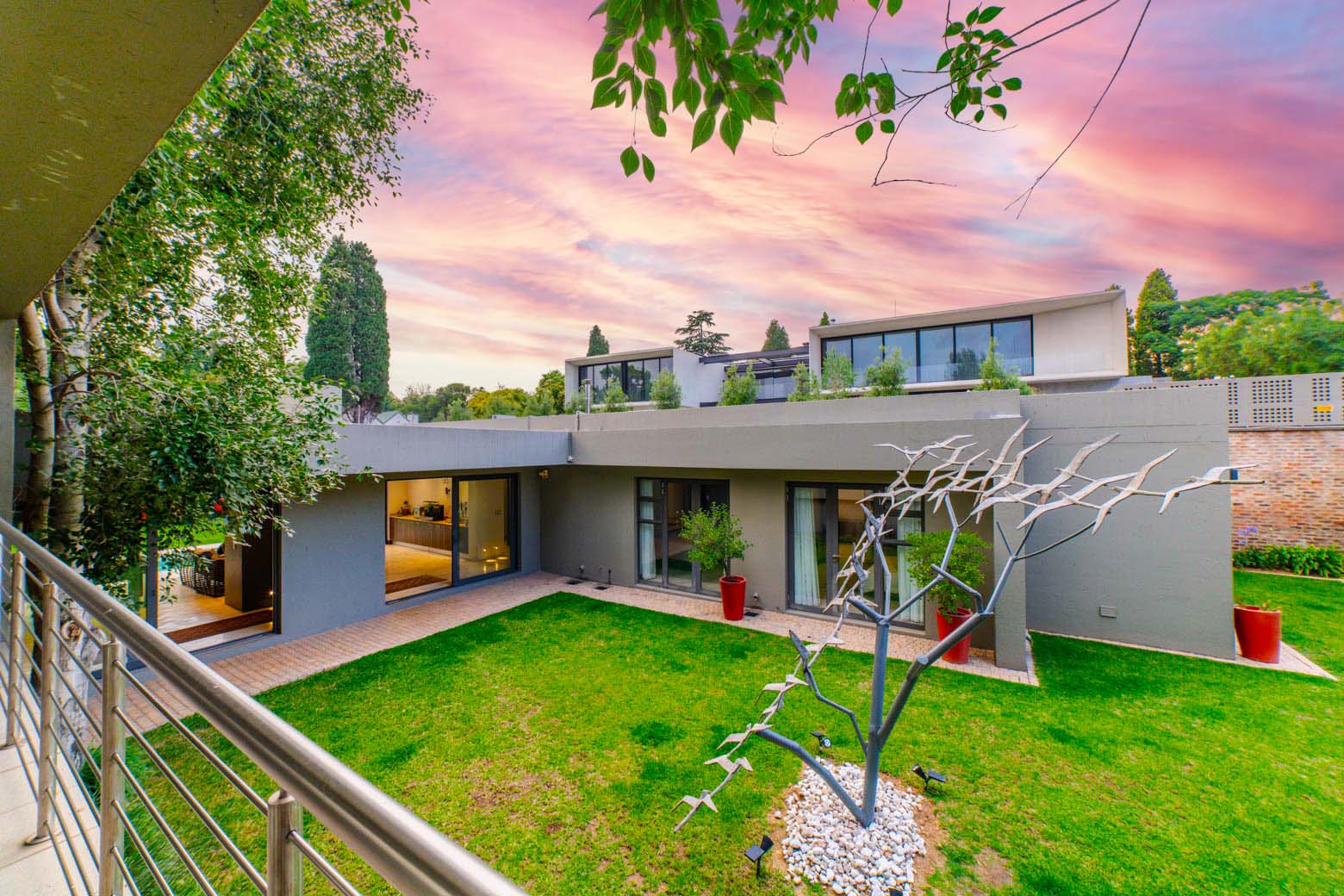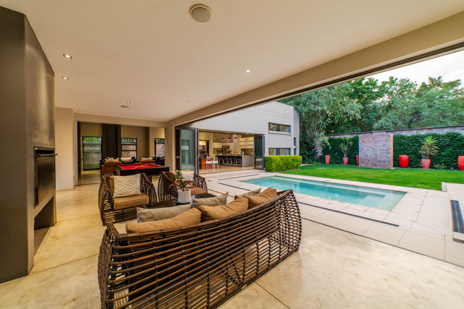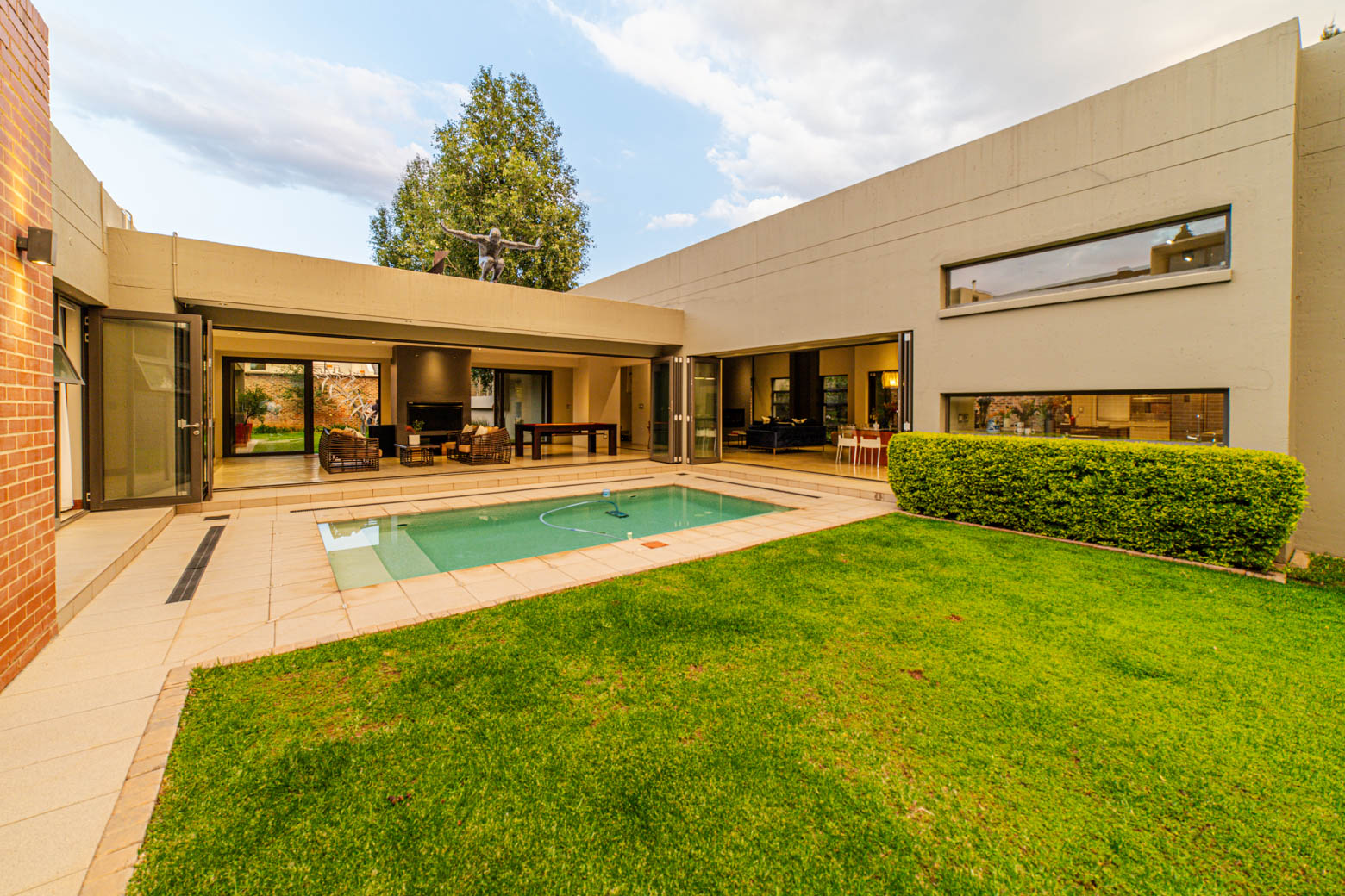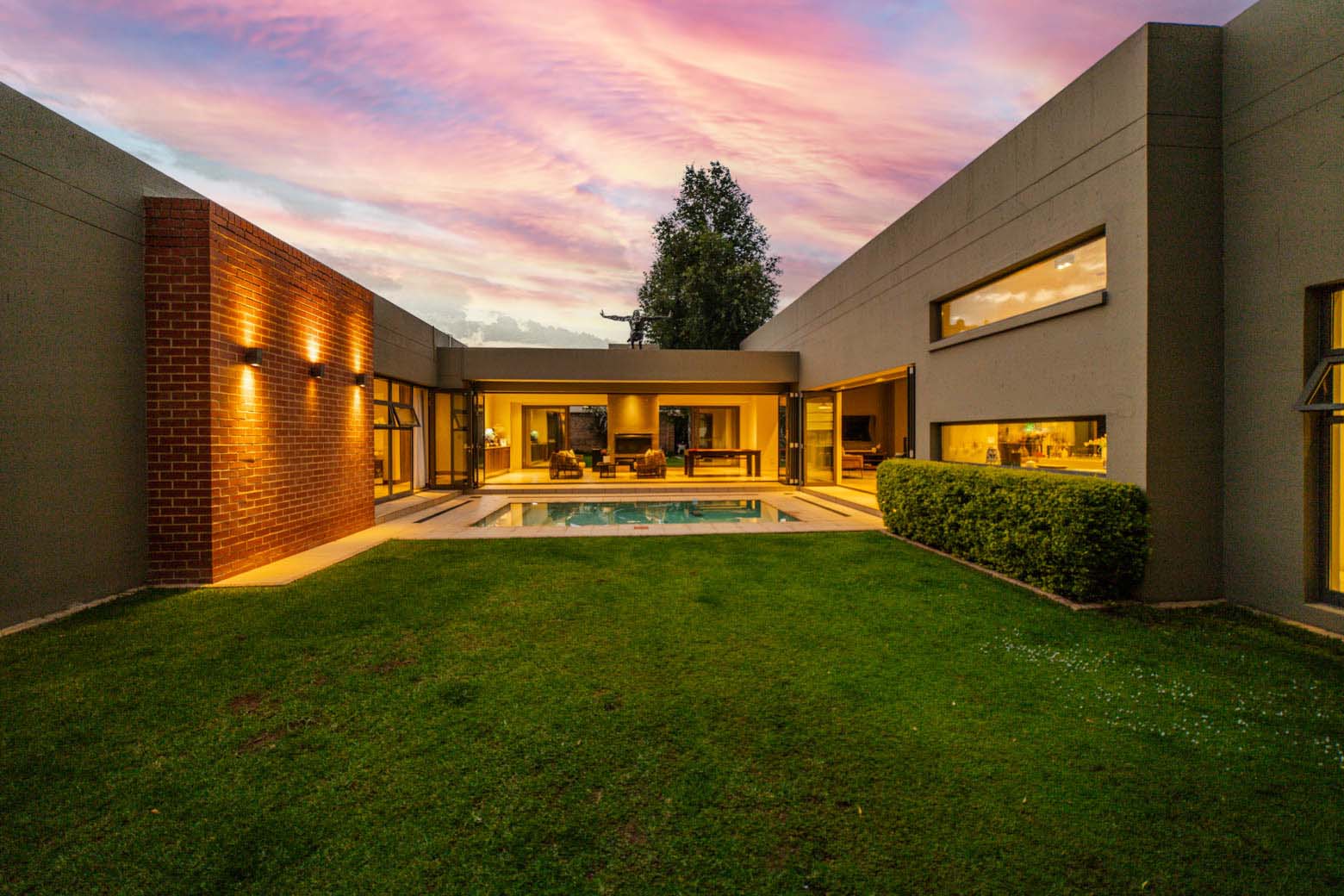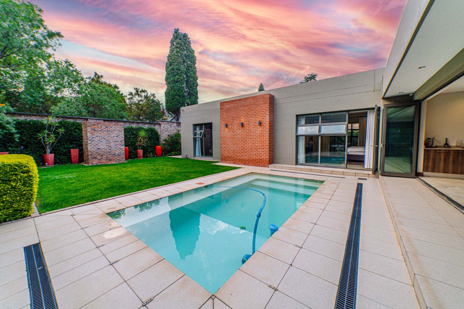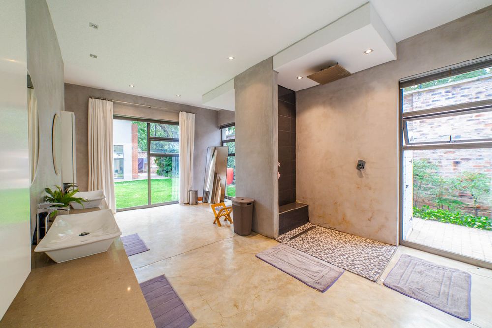 There are Bryanston addresses—and then there’s this one. Set on 1,500m2 in one of Bryanston’s most exclusive pockets, this home offers a rare blend of architectural excellence, luxury finishes, and effortless indoor-outdoor living. High-volume ceilings, sunlit spaces, seamless screeded floors, and full-height aluminium stack doors create a modern, gallery-like atmosphere that leaves a lasting impression. The layout includes a private guest suite with dual balconies, an expansive open-plan living and dining area with fireplace, and a designer kitchen with Caesarstone surfaces, integrated appliances, and a concealed scullery and pantry. The central pool forms the heart of the entertainment spaces, connecting the lounge, dining area, and a dedicated pool room complete with fitted bar and fireplace. The main suite features a generous dressing room, en-suite bathroom, and ample storage. Two additional bedrooms open to the garden and include built-in study spaces, sharing a bright, modern bathroom. Practical features include an 8KVA solar system (two batteries, UPS, 16 panels), whole-home water filtration, CCTV, beams, electric fencing, and triple automated garages. Perfectly located near Nicolway, Hobart Grove, top restaurants, the Bryanston Organic Market, Bryanston Country Club, and leading schools such as St Stithians, Brescia House, and BIC, this home delivers the lifestyle buyers most want in Bryanston. A property of this calibre is seldom available and quickly secured. Arrange your private viewing today.