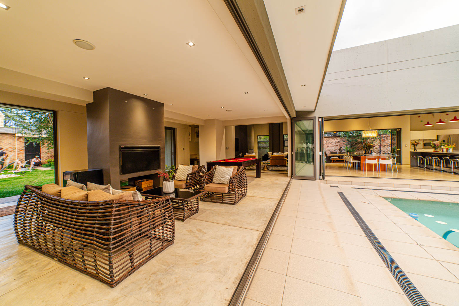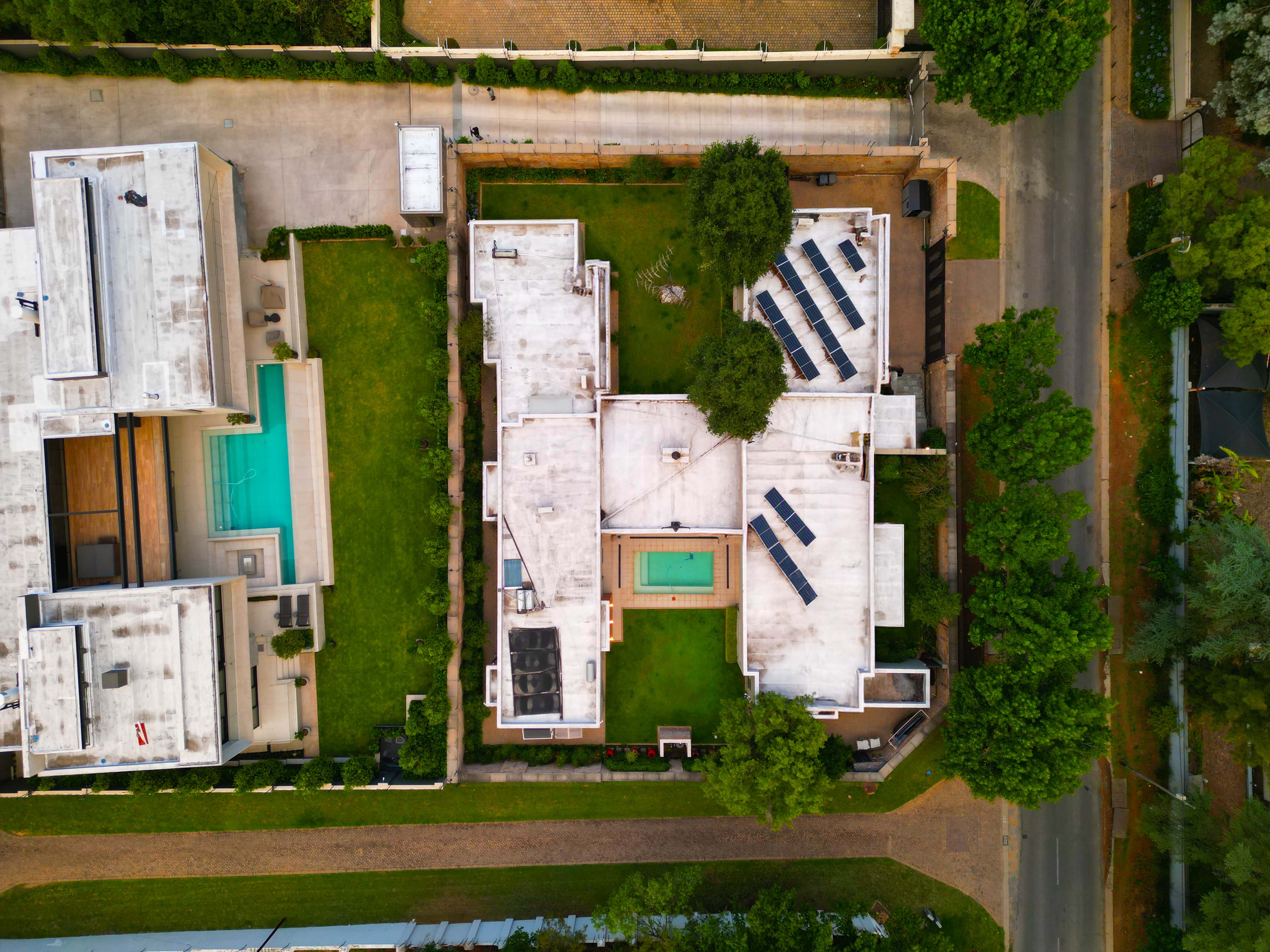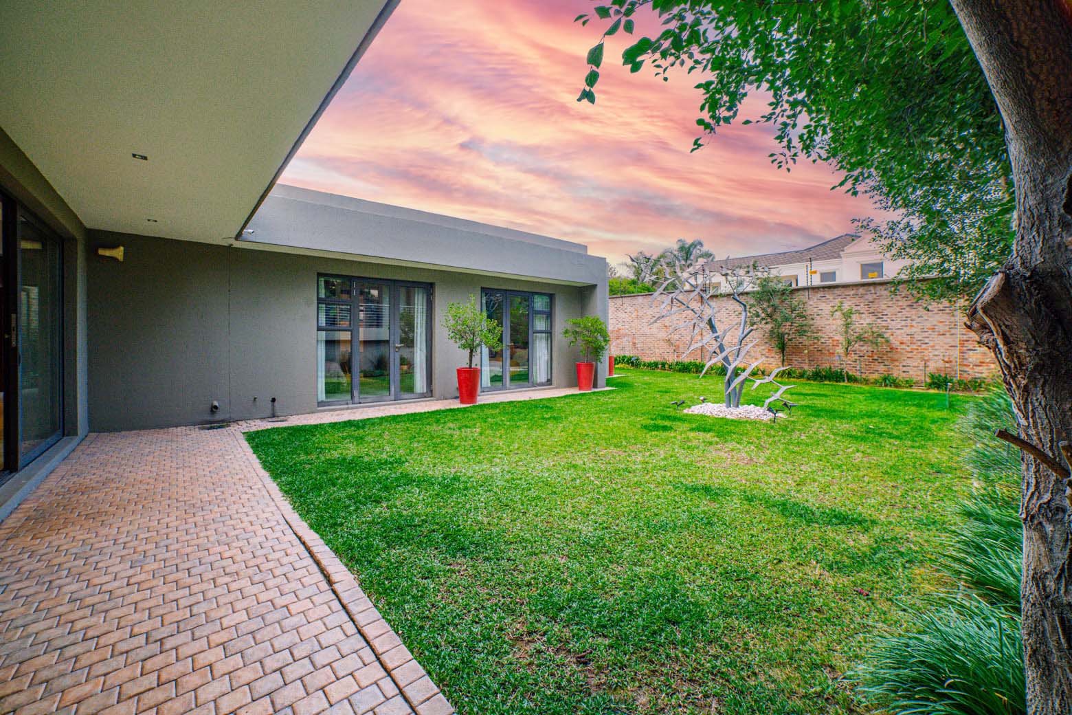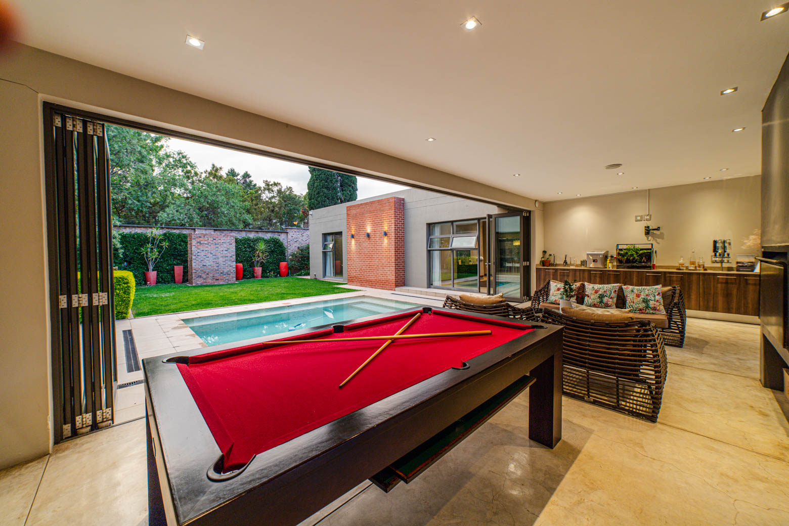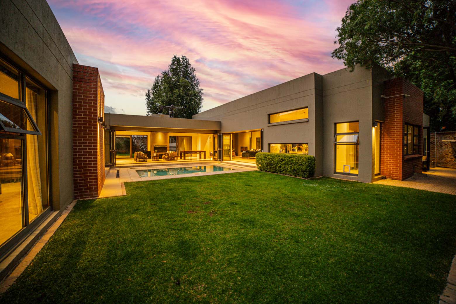 There are Bryanston addresses—and then there’s this one. Set on 1,500m2 in one of Bryanston’s most exclusive pockets, this home offers a rare blend of architectural excellence, luxury finishes, and effortless indoor-outdoor living. High-volume ceilings, sunlit spaces, seamless screeded floors, and full-height aluminium stack doors create a modern, gallery-like atmosphere that leaves a lasting impression. The layout includes a private guest suite with dual balconies, an expansive open-plan living and dining area with fireplace, and a designer kitchen with Caesarstone surfaces, integrated appliances, and a concealed scullery and pantry. The central pool forms the heart of the entertainment spaces, connecting the lounge, dining area, and a dedicated pool room complete with fitted bar and fireplace. The main suite features a generous dressing room, en-suite bathroom, and ample storage. Two additional bedrooms open to the garden and include built-in study spaces, sharing a bright, modern bathroom. Practical features include an 8KVA solar system (two batteries, UPS, 16 panels), whole-home water filtration, CCTV, beams, electric fencing, and triple automated garages. Perfectly located near Nicolway, Hobart Grove, top restaurants, the Bryanston Organic Market, Bryanston Country Club, and leading schools such as St Stithians, Brescia House, and BIC, this home delivers the lifestyle buyers most want in Bryanston. A property of this calibre is seldom available and quickly secured. Arrange your private viewing today.