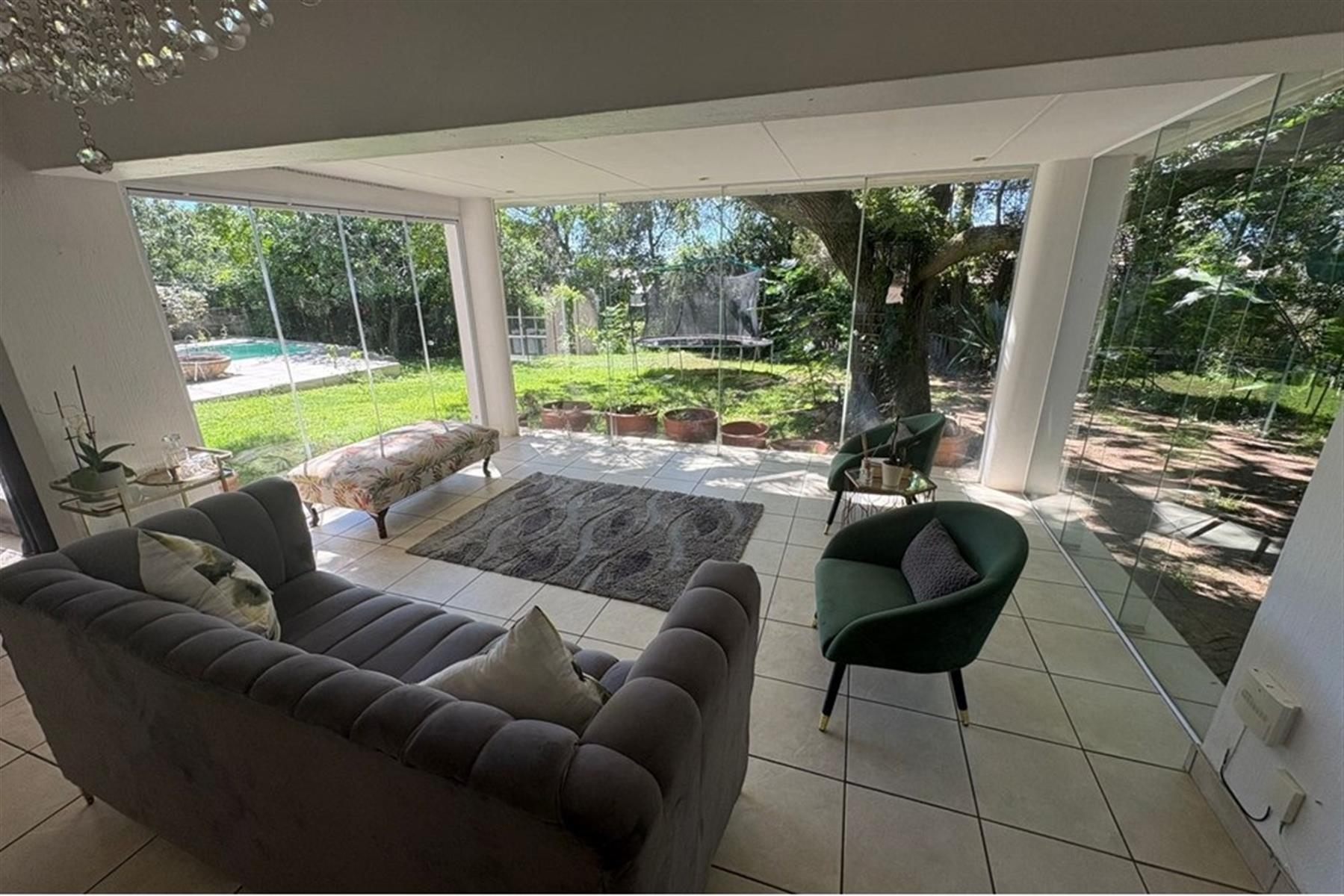 Frameless glass sunroom with folding doors, perfect for entertaining or unwinding