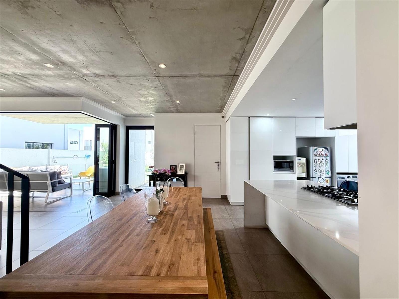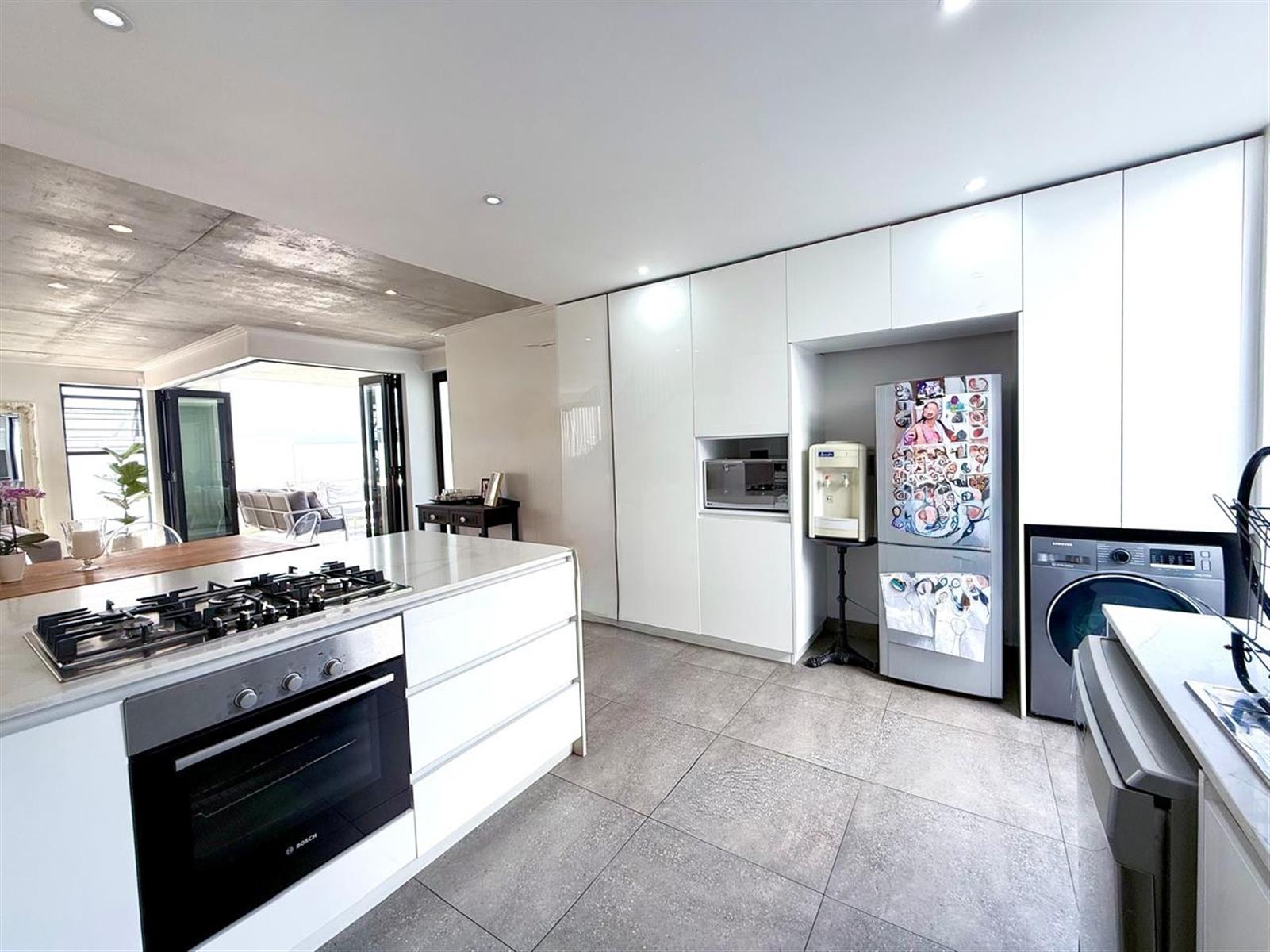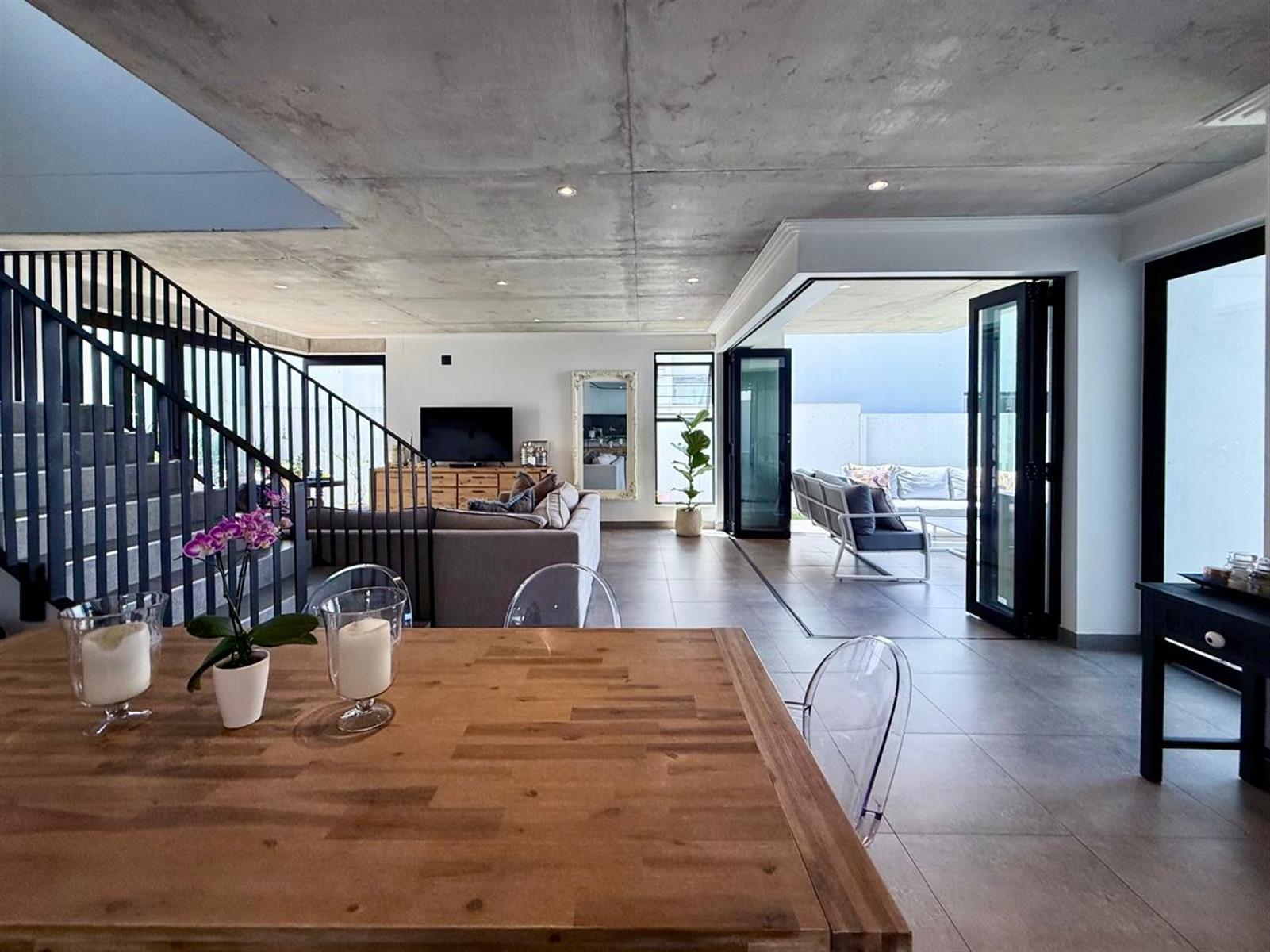 The light, airy open plan living area integrates the modern seamless kitchen harmoniously with the dining and lounge areas leading onto the covered patio with a built- in braai, pool, and garden.