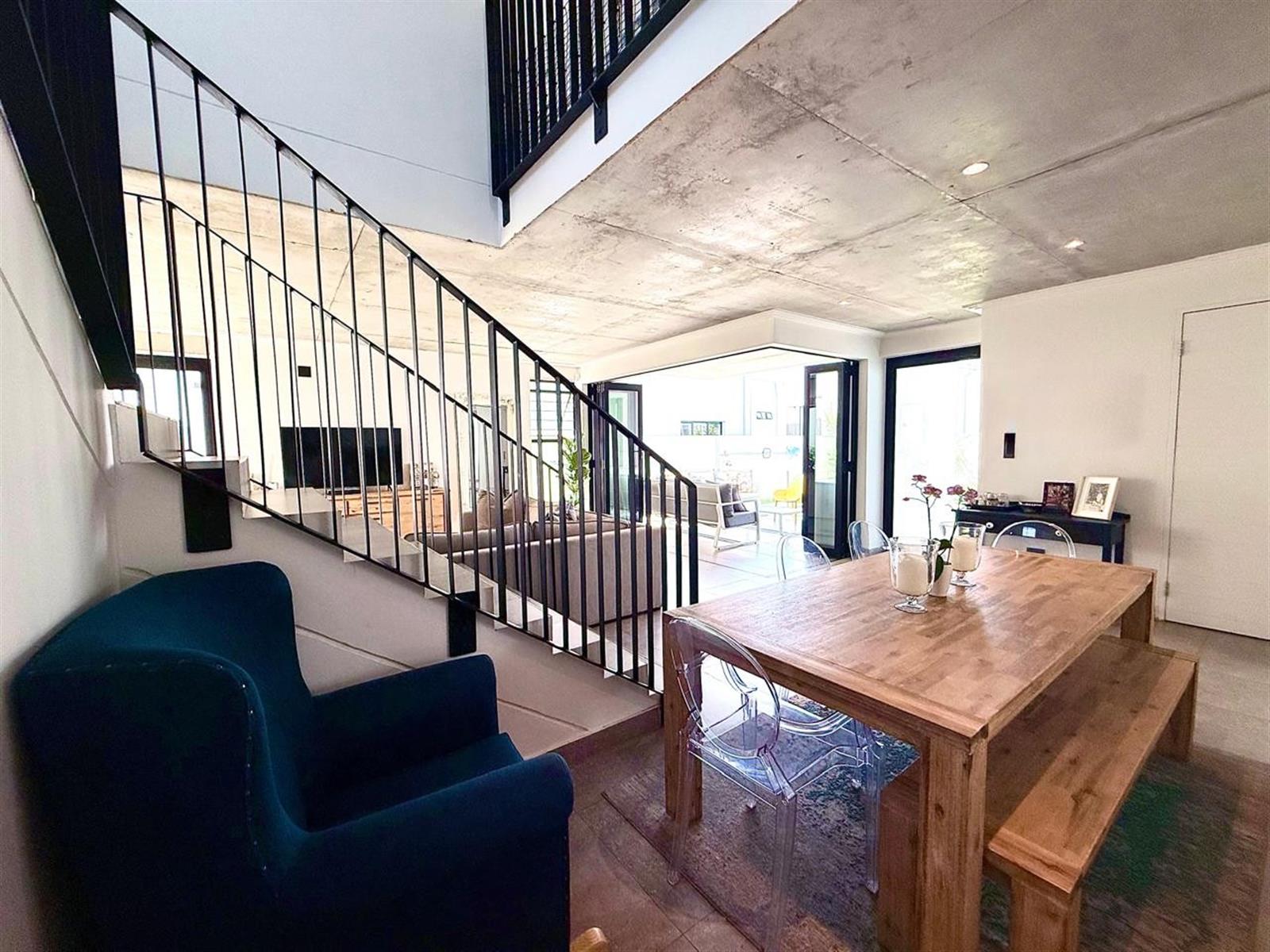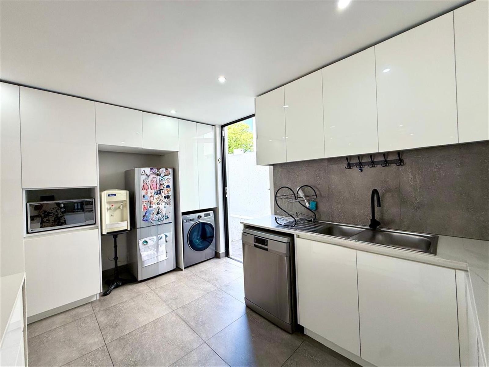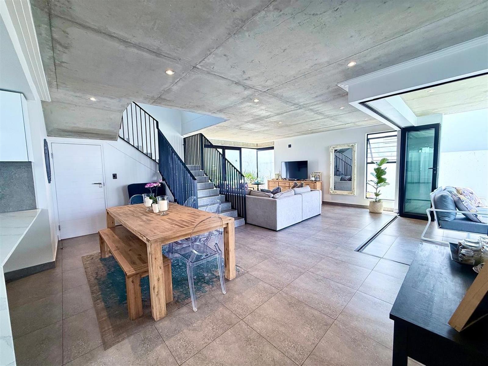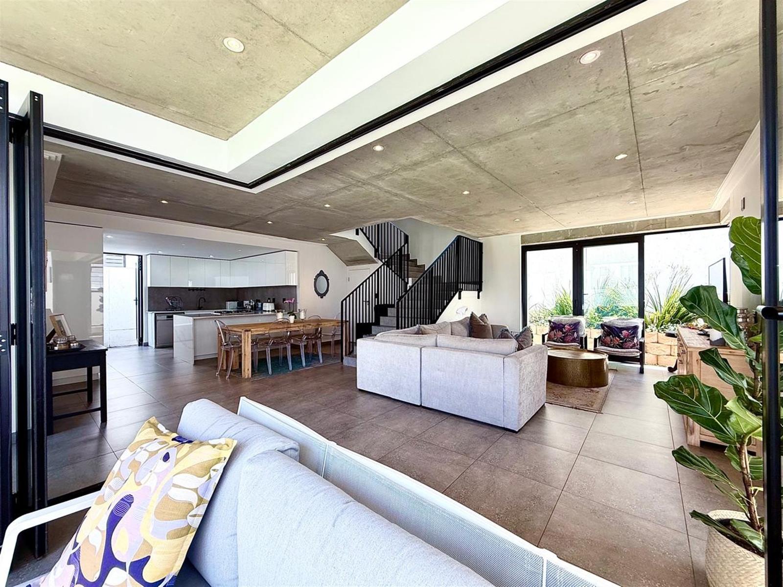 The light, airy open plan living area integrates the modern seamless kitchen harmoniously with the dining and lounge areas leading onto the covered patio with a built- in braai, pool, and garden.