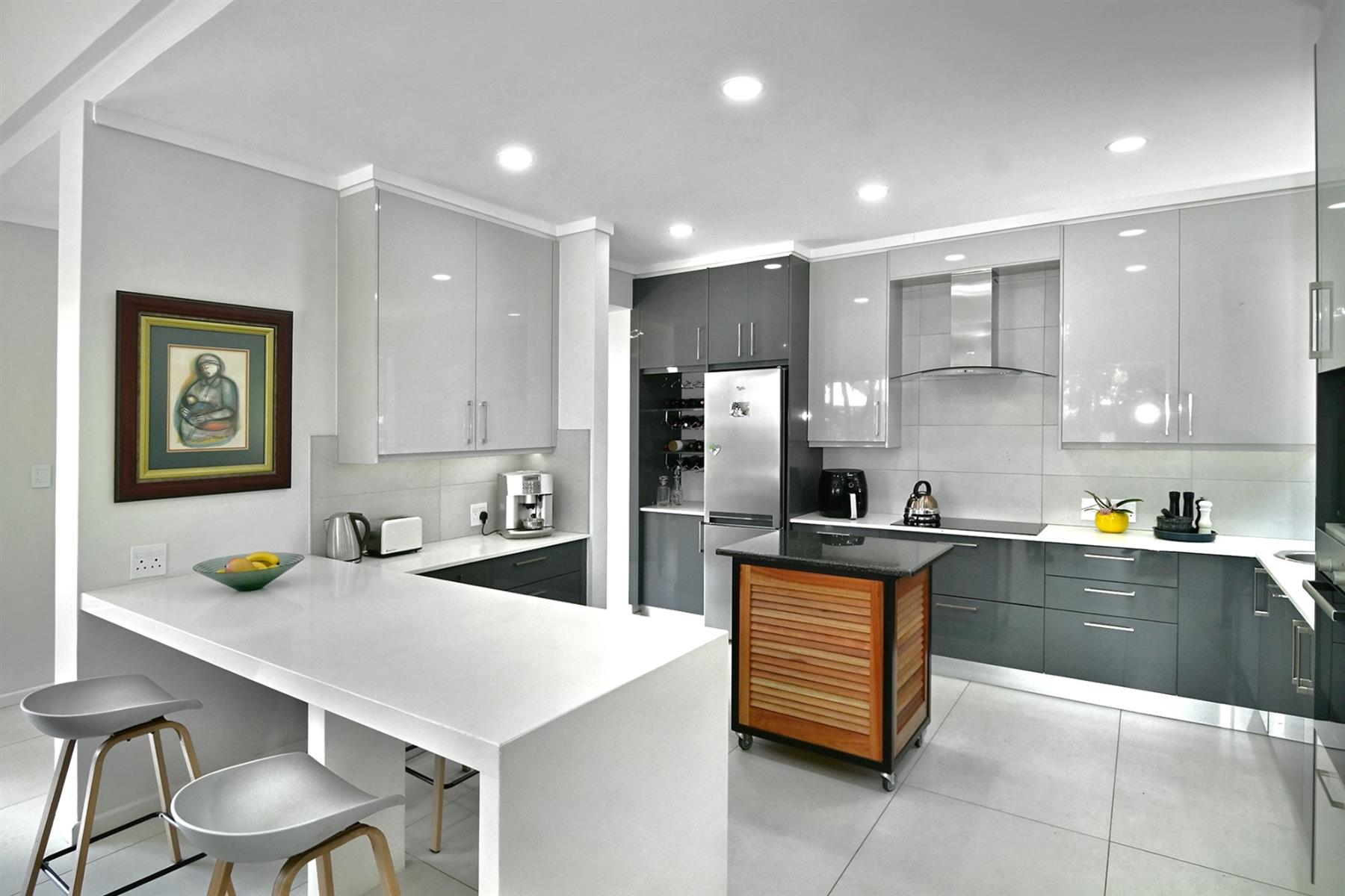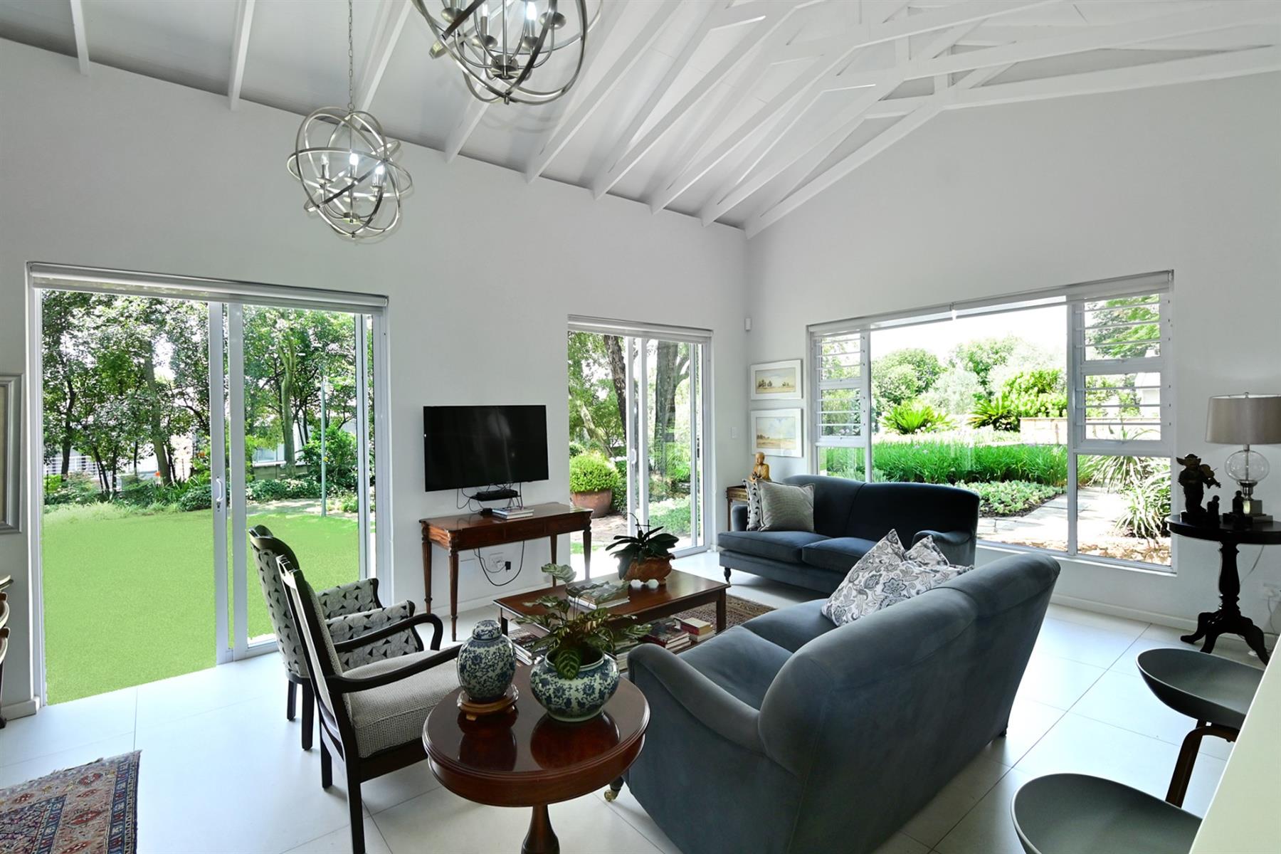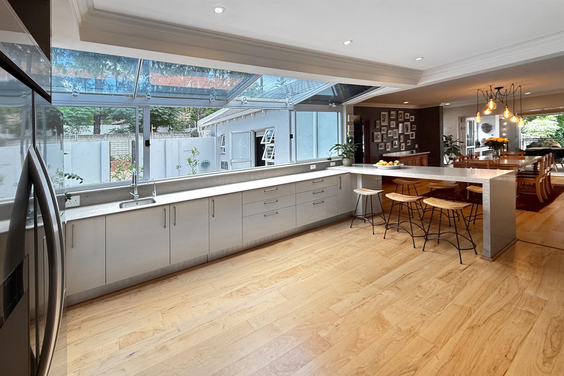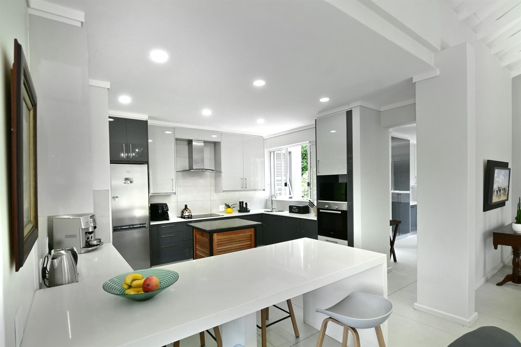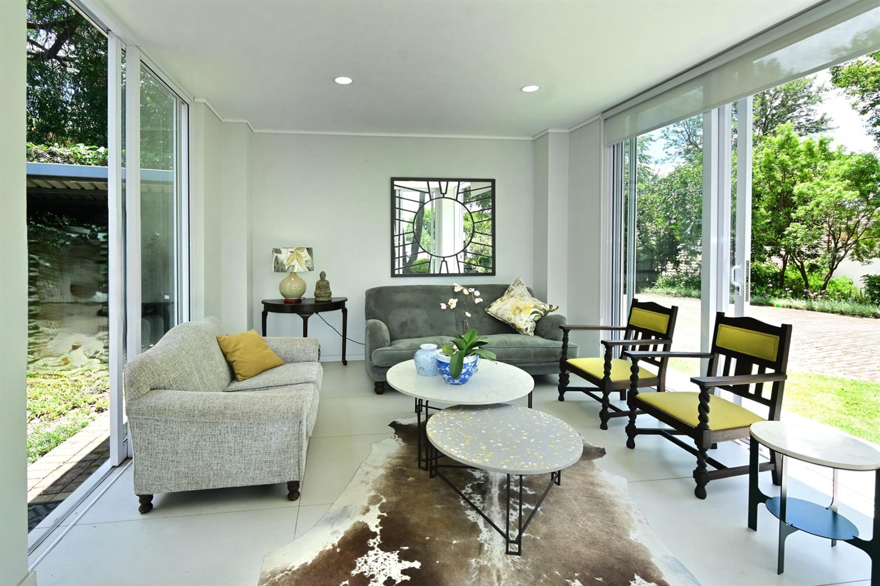 The designer kitchen is a standout, featuring sleek, contemporary lines, expansive glass skylight and sliding windows, plus a separate scullery. It is the heart of this stunning home and is a space that is both functional and visually captivating. A cozy tv room offers a relaxed retreat, while a guest suite and guest cloakroom ensures comfort for visitors.