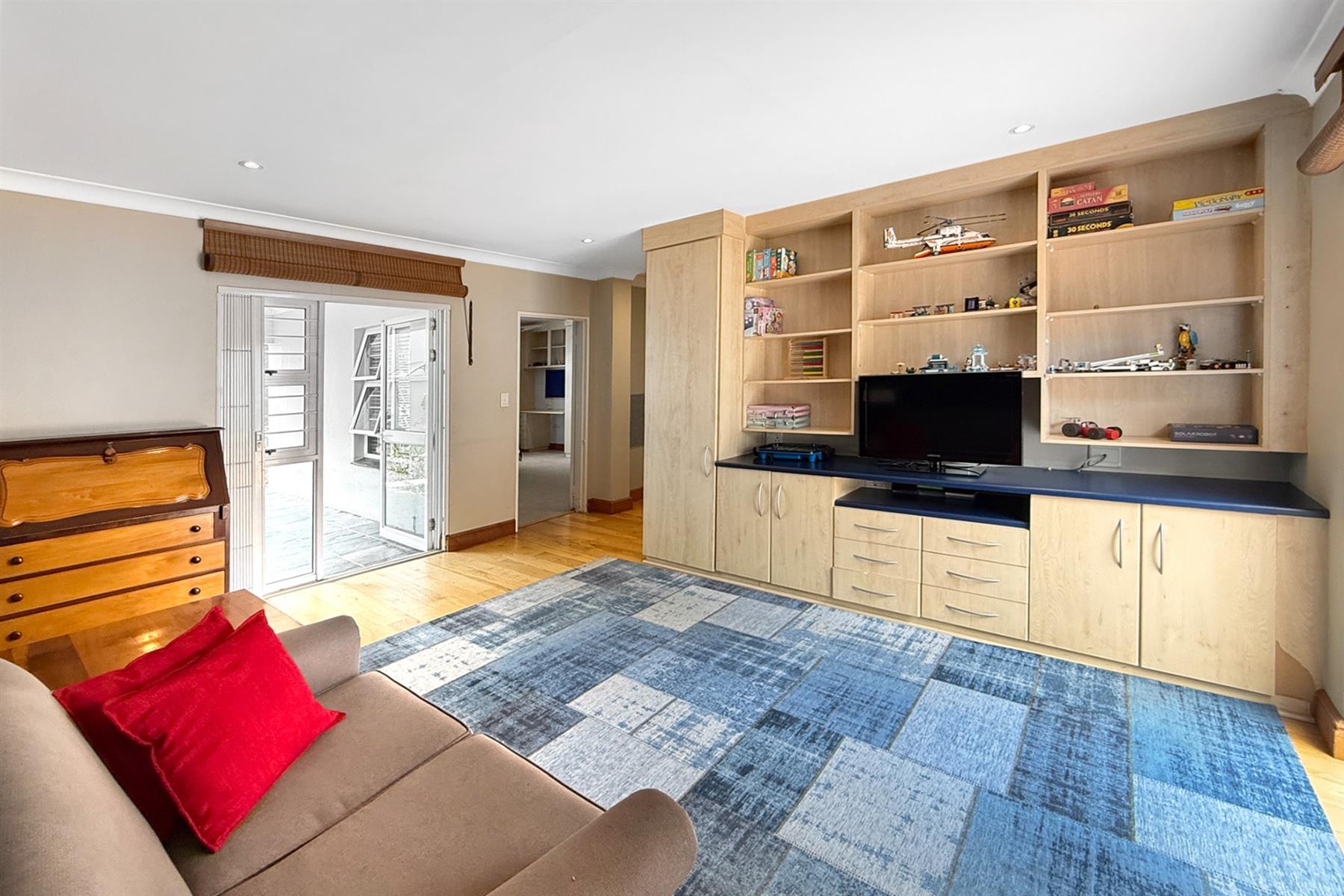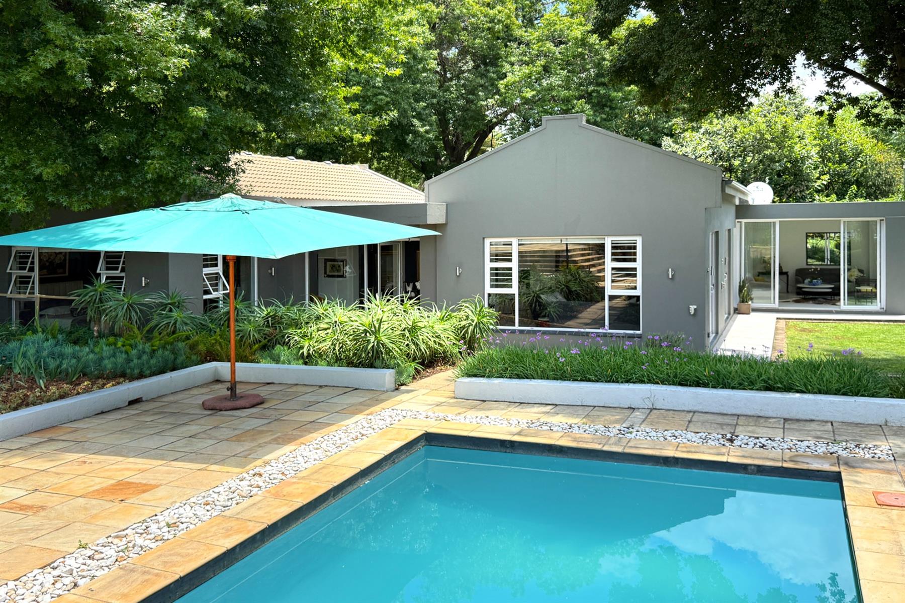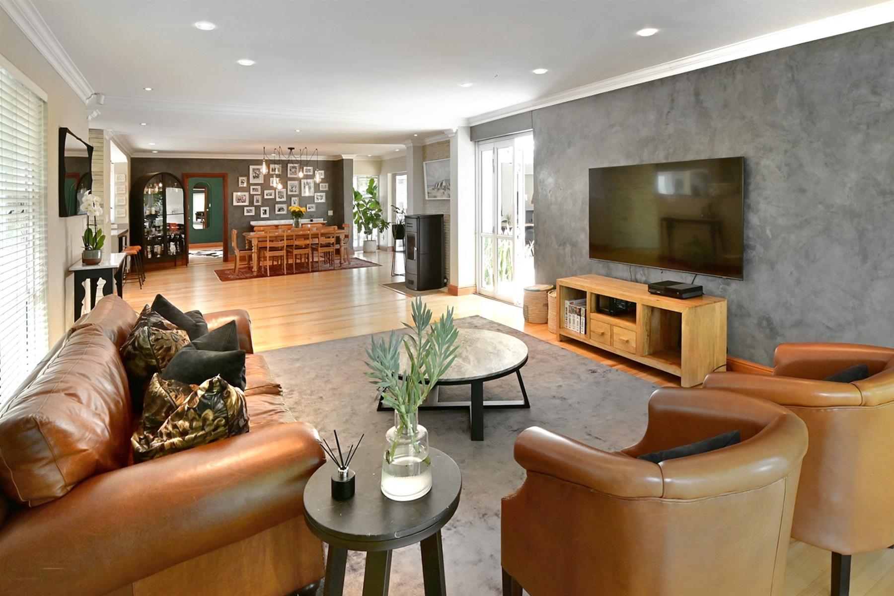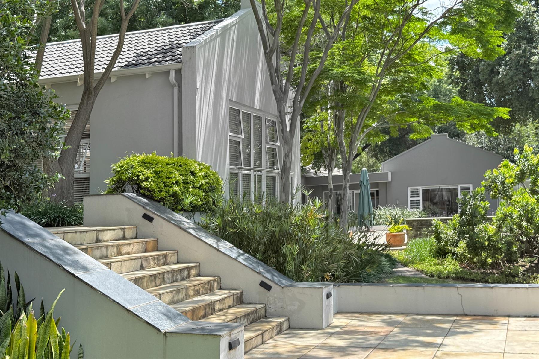 The main residence (+/- 550 sqm) welcomes you through a striking feature entrance into a world of effortless indoor-outdoor flow. Sunlit living and dining areas seamlessly connect to a covered entertainer’s patio complete with drop down blinds, gas braai and pizza oven, overlooking a sparkling pool and a beautifully established garden – a true sanctuary.