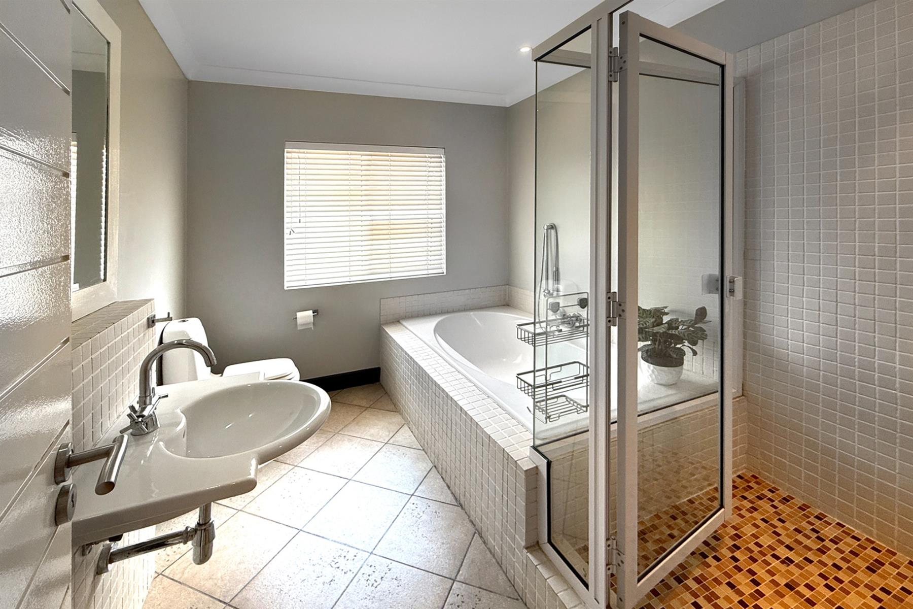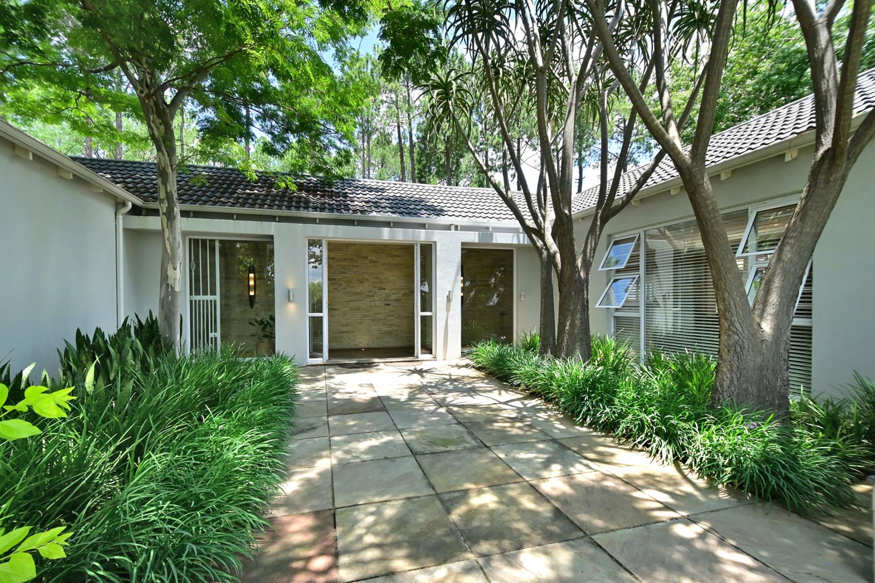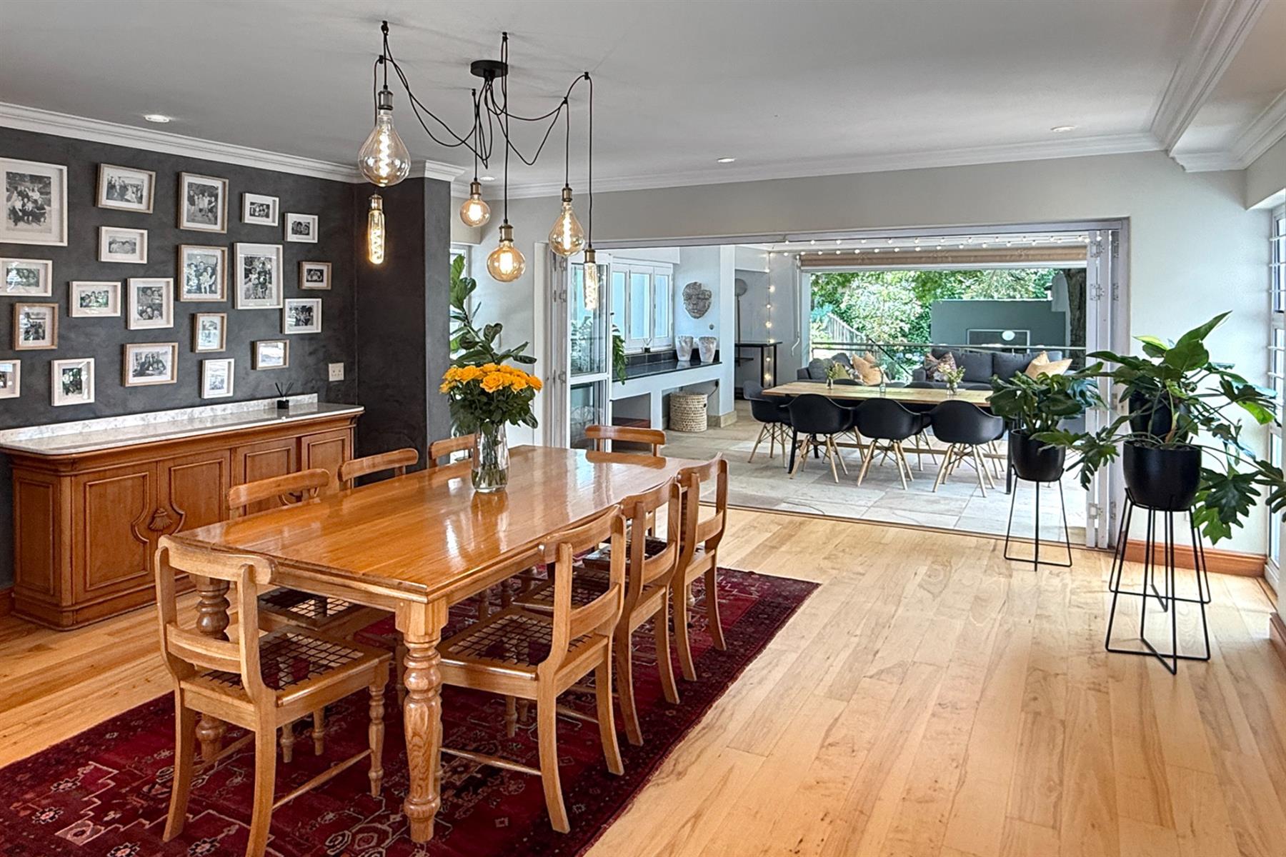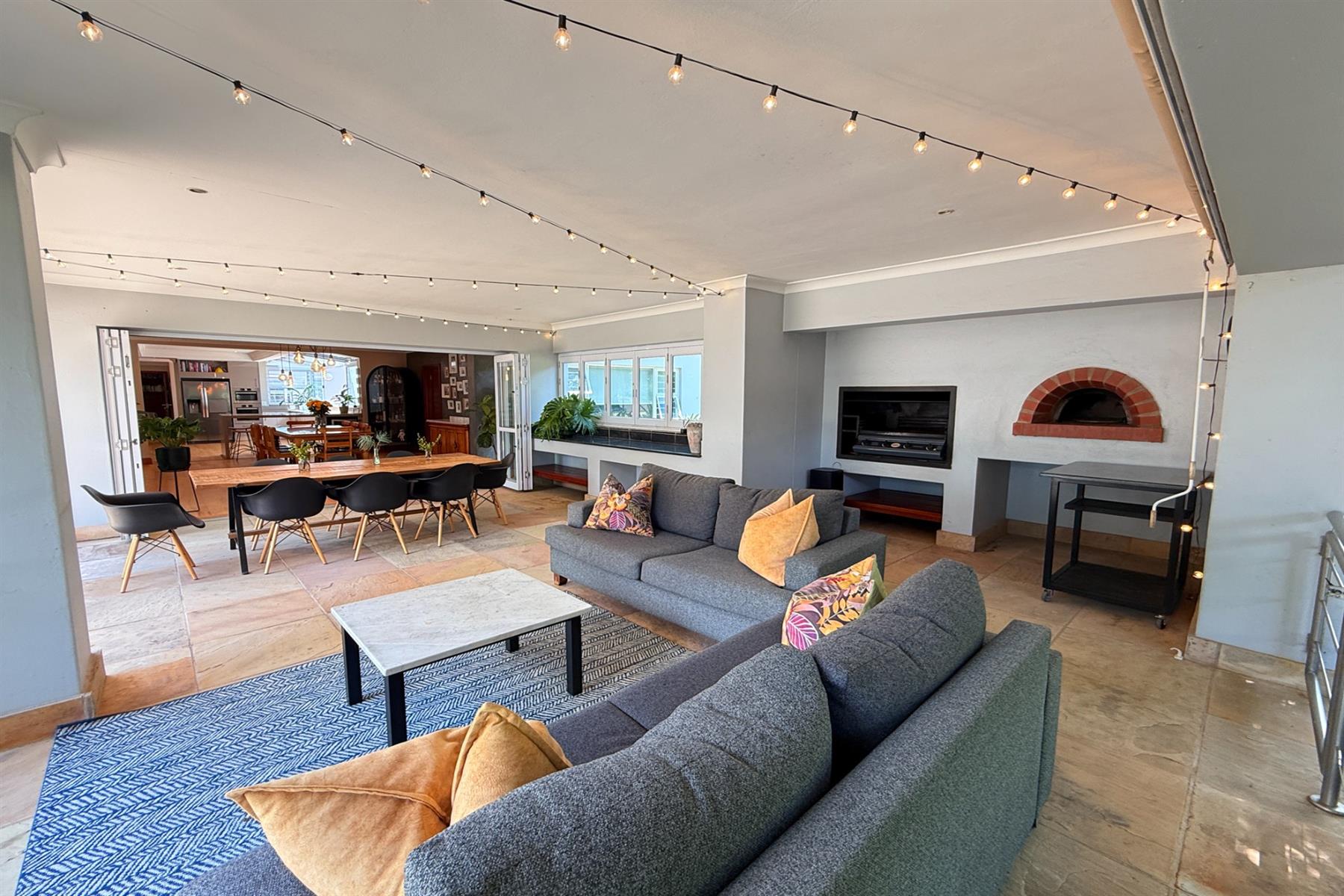 The main residence (+/- 550 sqm) welcomes you through a striking feature entrance into a world of effortless indoor-outdoor flow. Sunlit living and dining areas seamlessly connect to a covered entertainer’s patio complete with drop down blinds, gas braai and pizza oven, overlooking a sparkling pool and a beautifully established garden – a true sanctuary.