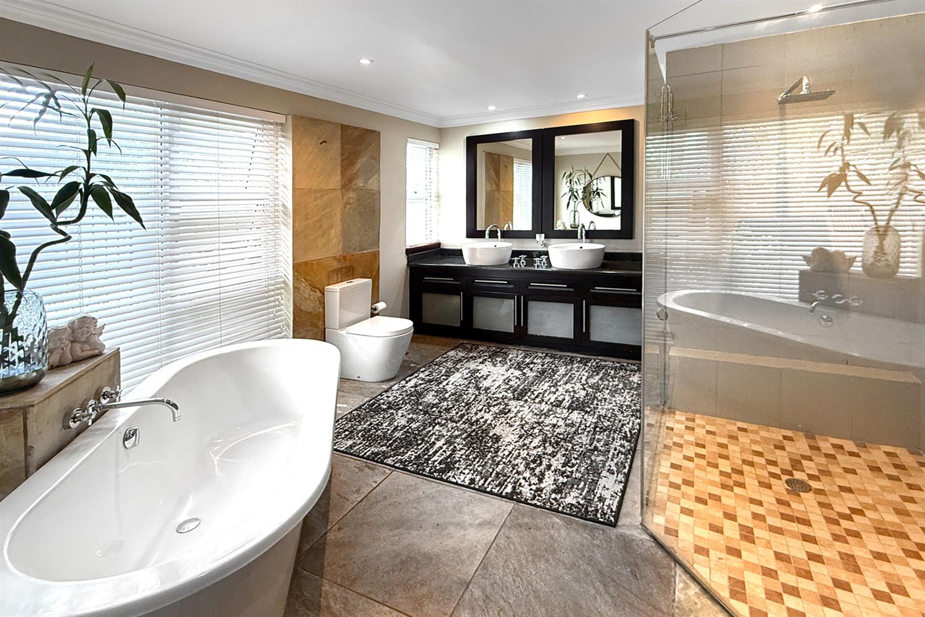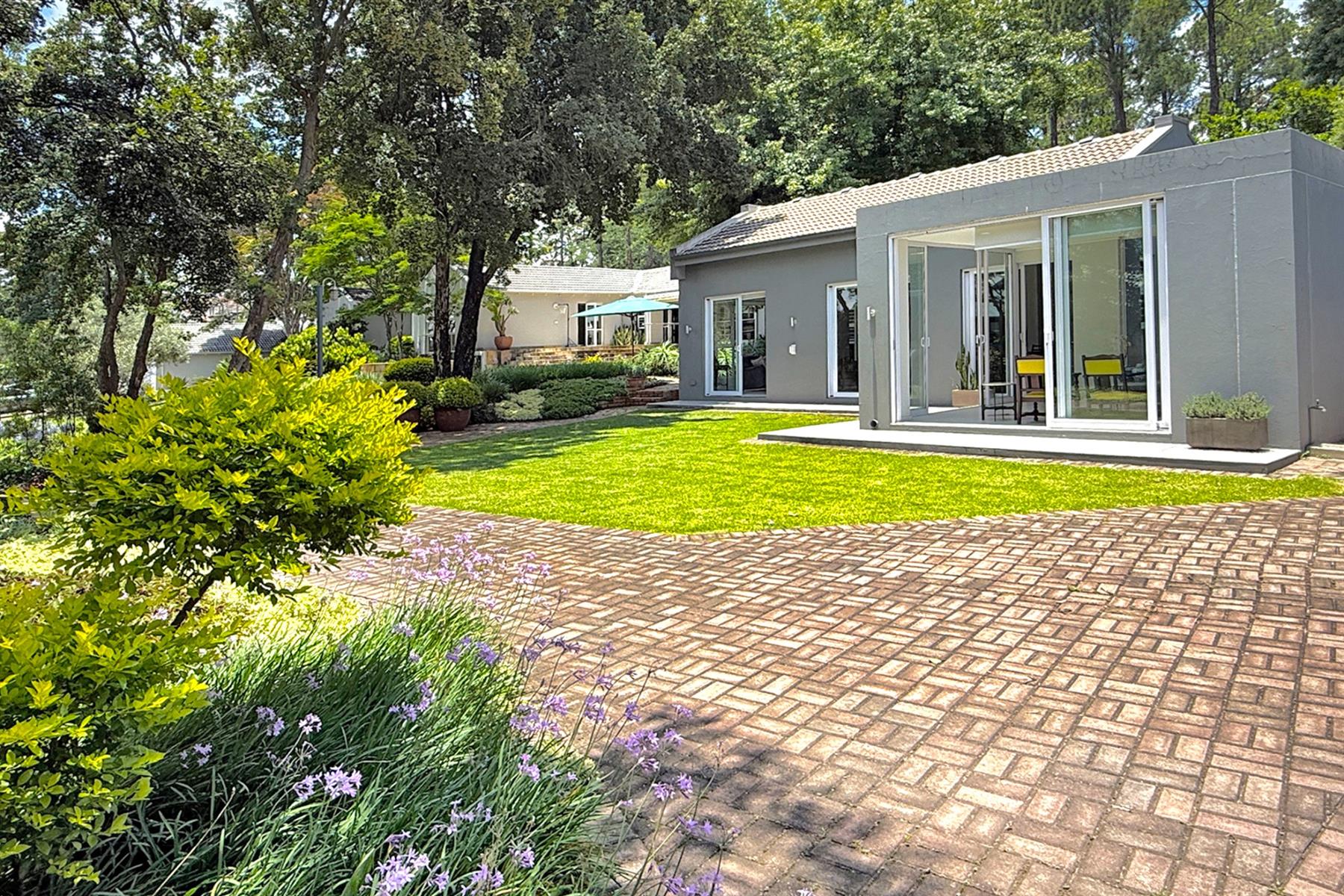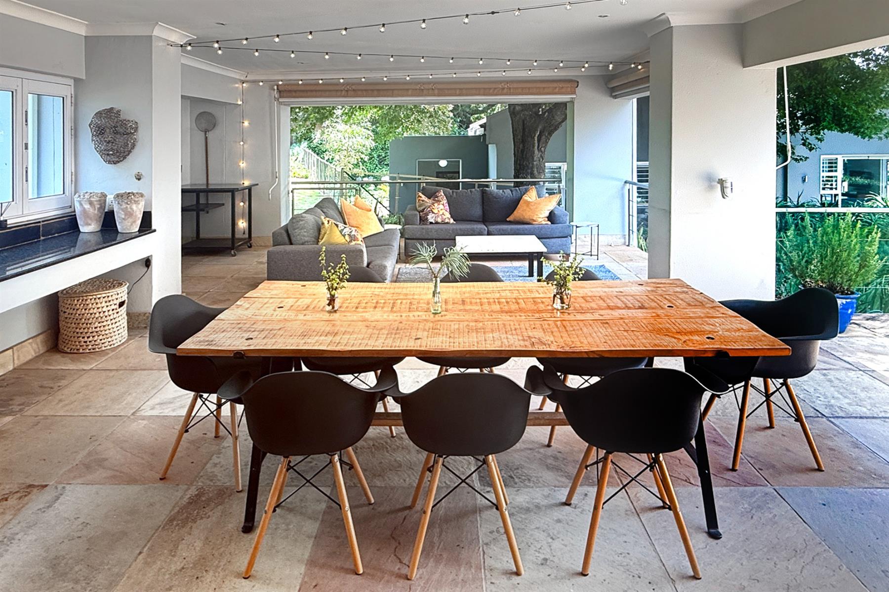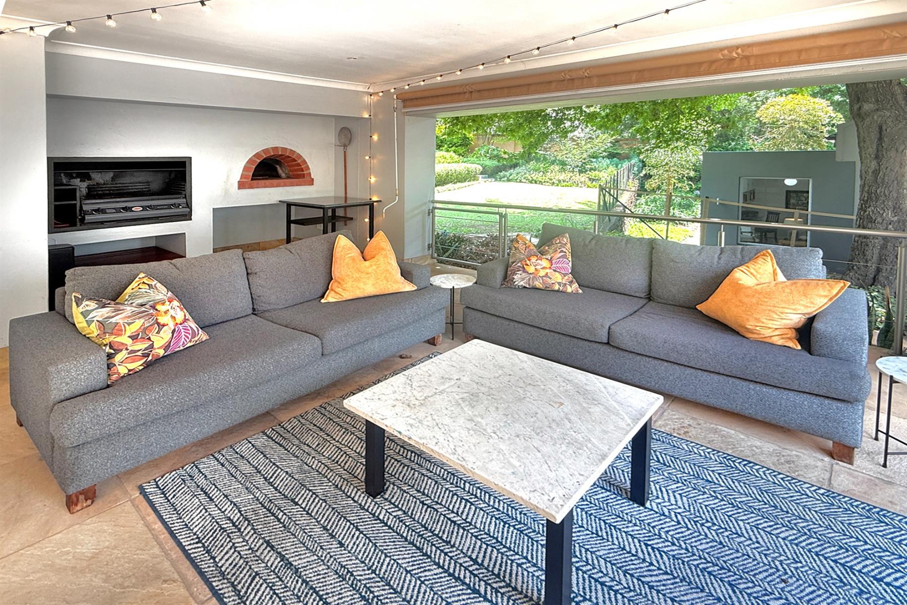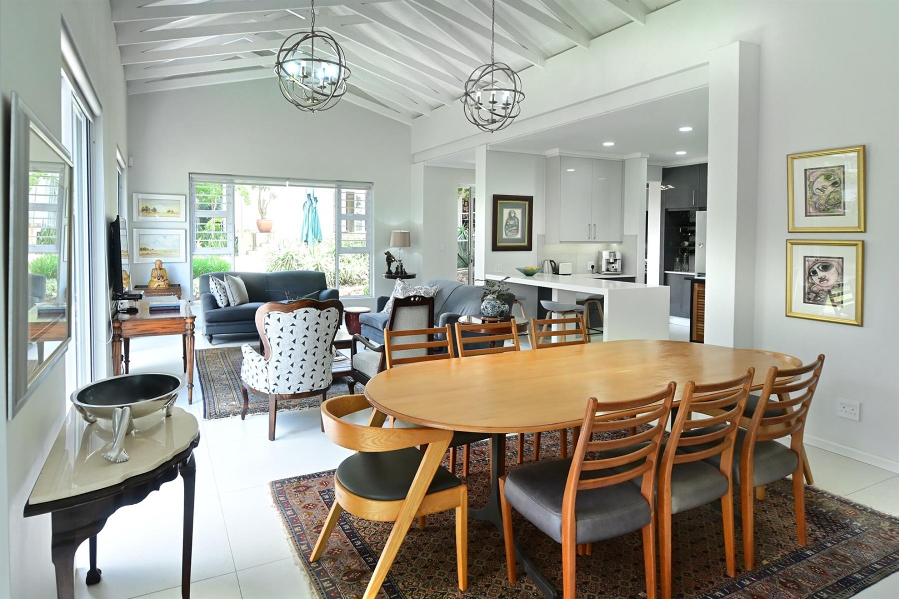 The main residence (+/- 550 sqm) welcomes you through a striking feature entrance into a world of effortless indoor-outdoor flow. Sunlit living and dining areas seamlessly connect to a covered entertainer’s patio complete with drop down blinds, gas braai and pizza oven, overlooking a sparkling pool and a beautifully established garden – a true sanctuary.