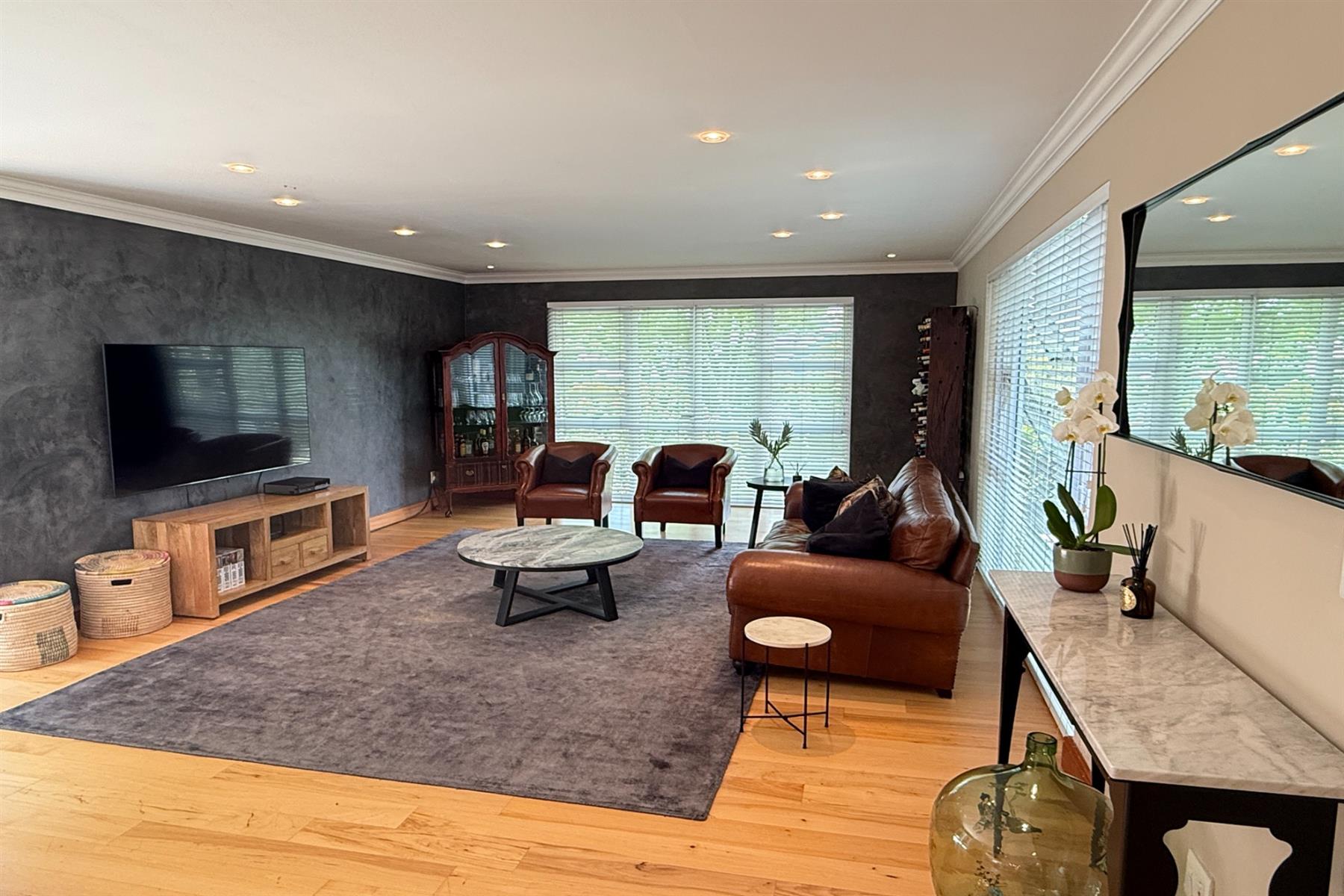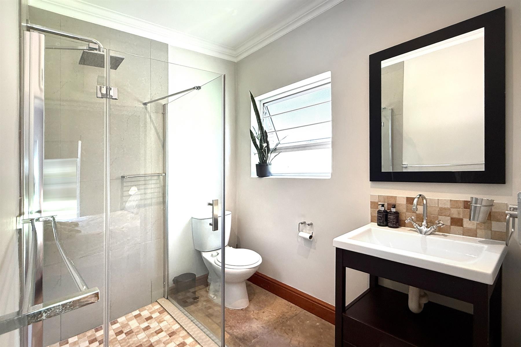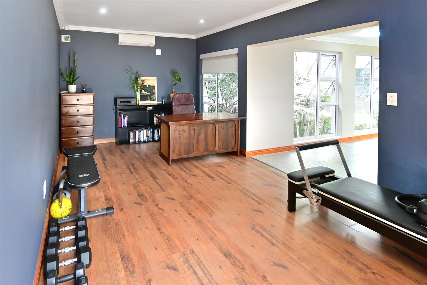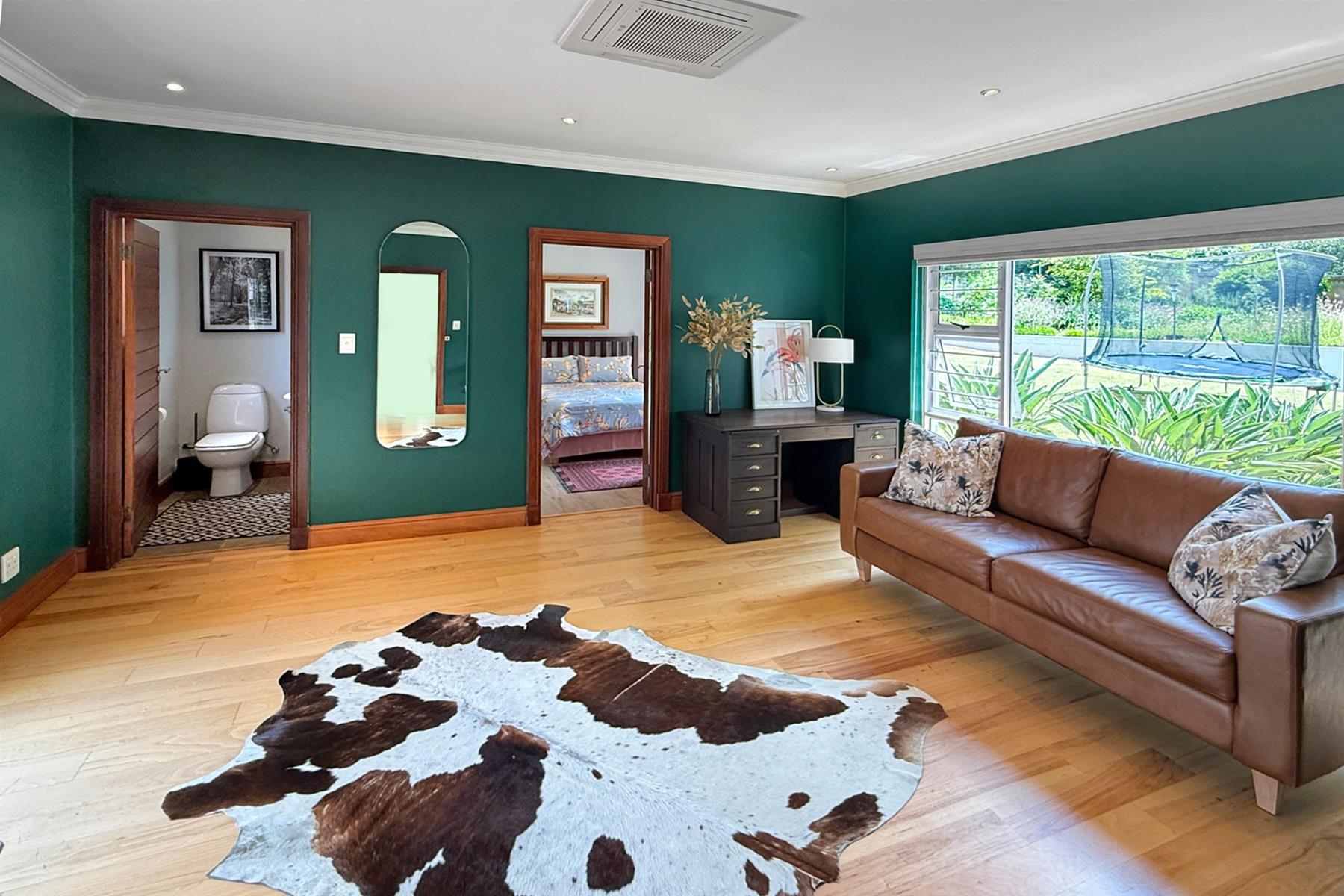 The main residence (+/- 550 sqm) welcomes you through a striking feature entrance into a world of effortless indoor-outdoor flow. Sunlit living and dining areas seamlessly connect to a covered entertainer’s patio complete with drop down blinds, gas braai and pizza oven, overlooking a sparkling pool and a beautifully established garden – a true sanctuary.