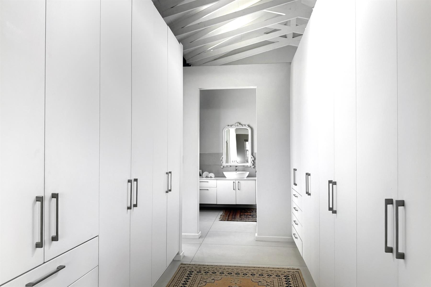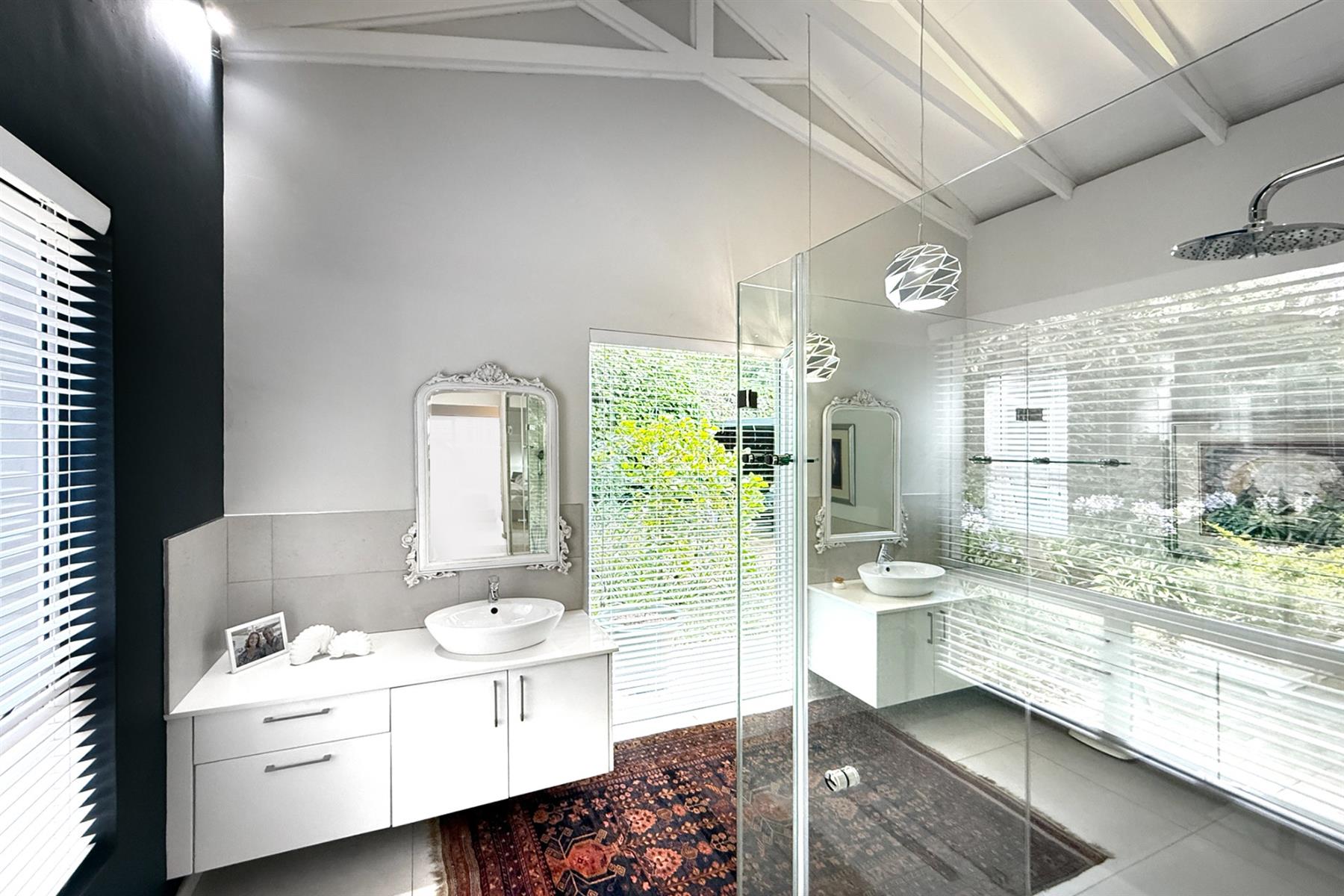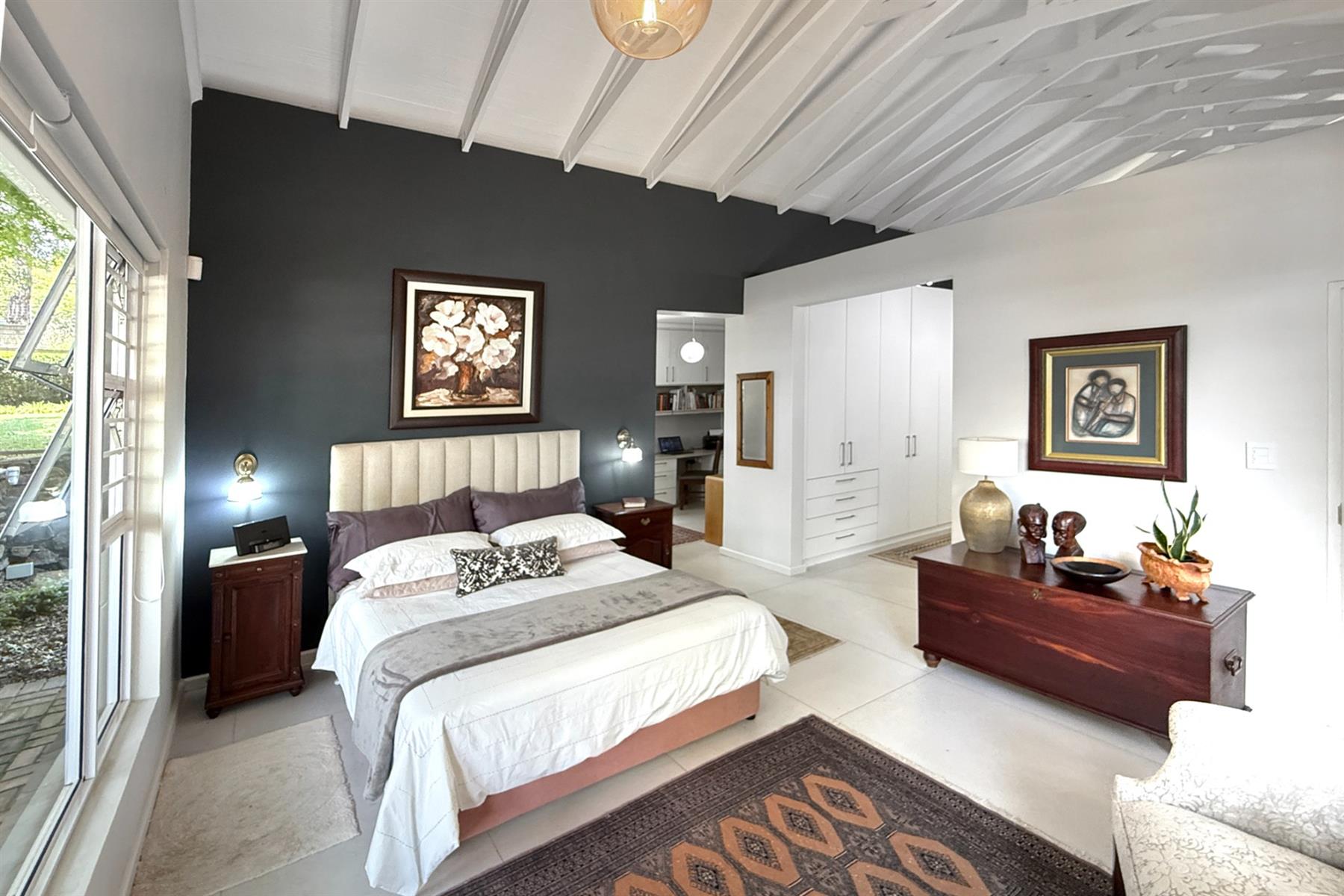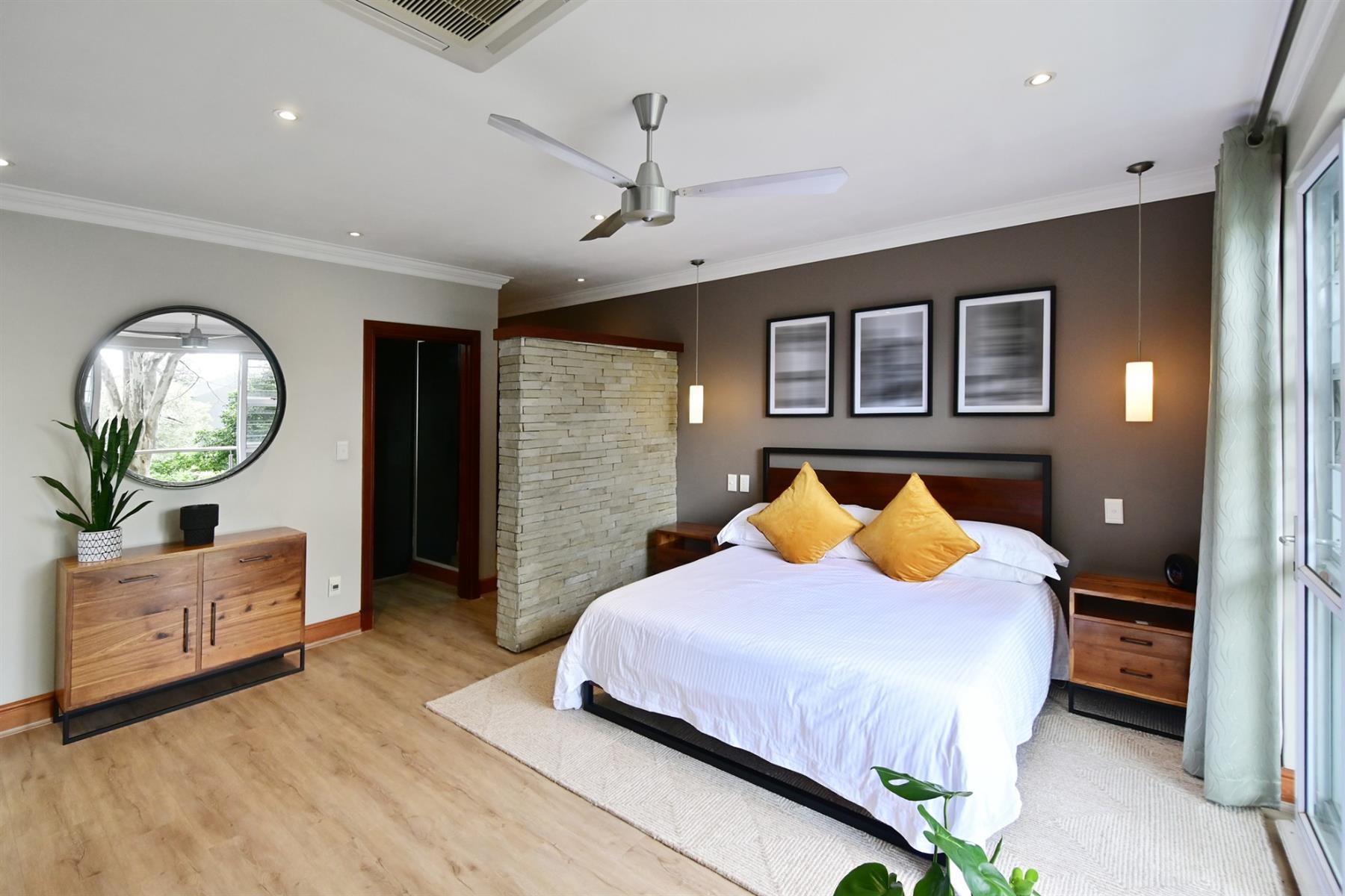 The second home (+/- 165 sqm) is equally impressive, offering double volume living spaces with exposed trusses, a statement kitchen with breakfast counter and scullery, and seamless flow to an all-weather patio. The main bedroom boasts a beautiful dressing room, modern full bathroom, a private study, and it’s own laundry. A tandem carport completes the picture.