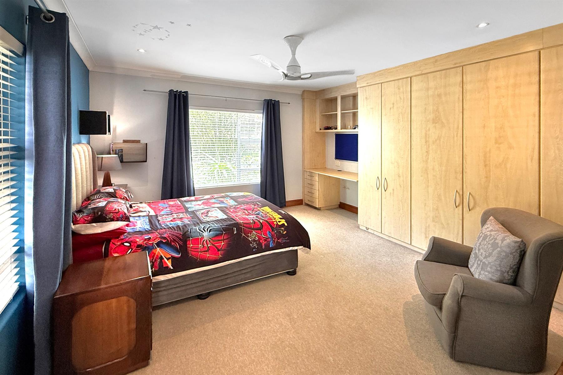 A secure family bedroom wing features a luxurious main suite with Juliet balcony, walk-in dressing room and deluxe full bathroom, two generous family bedrooms, a full shared bathroom, and a pyjama lounge opening to the outdoors – perfect for relaxed family living.