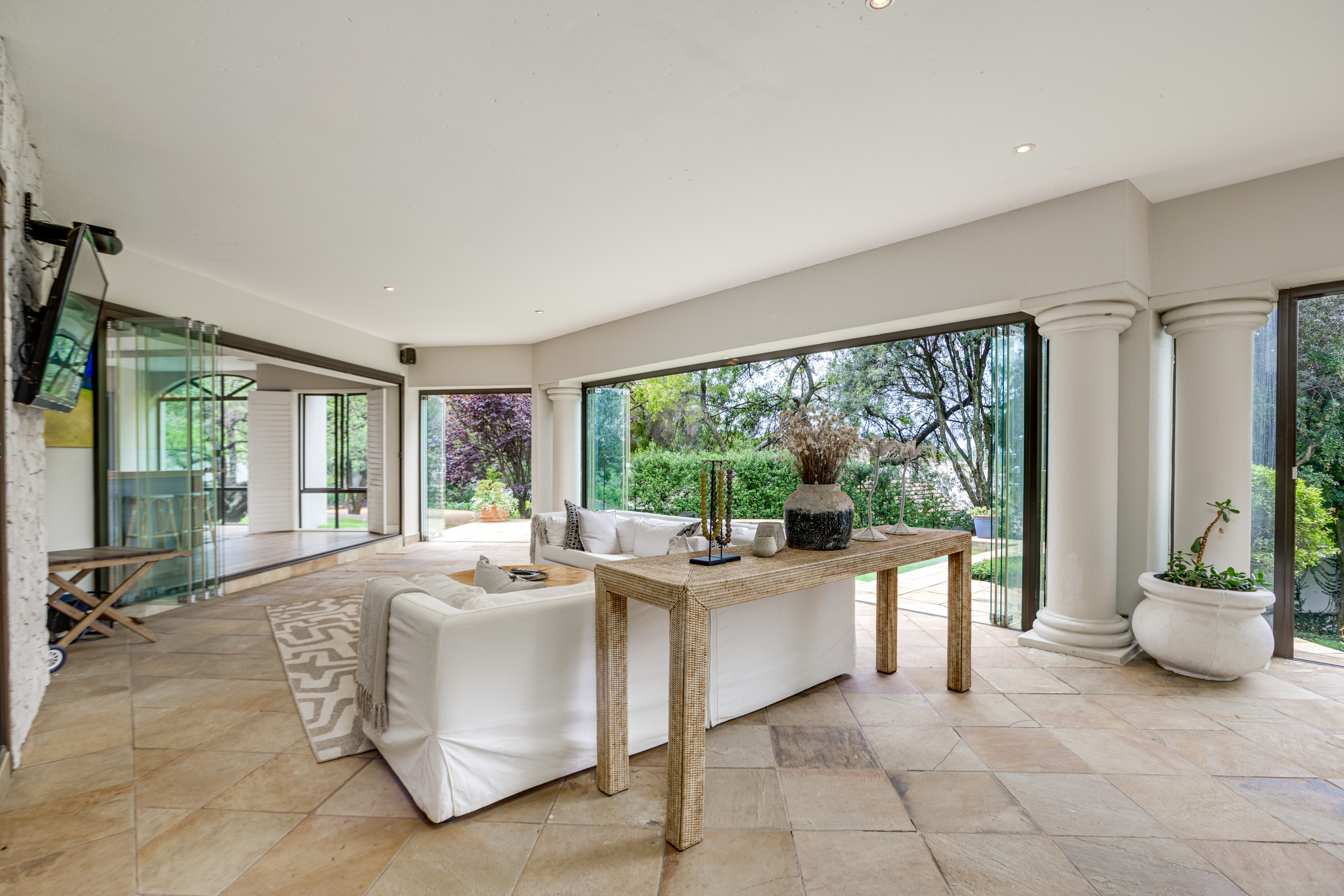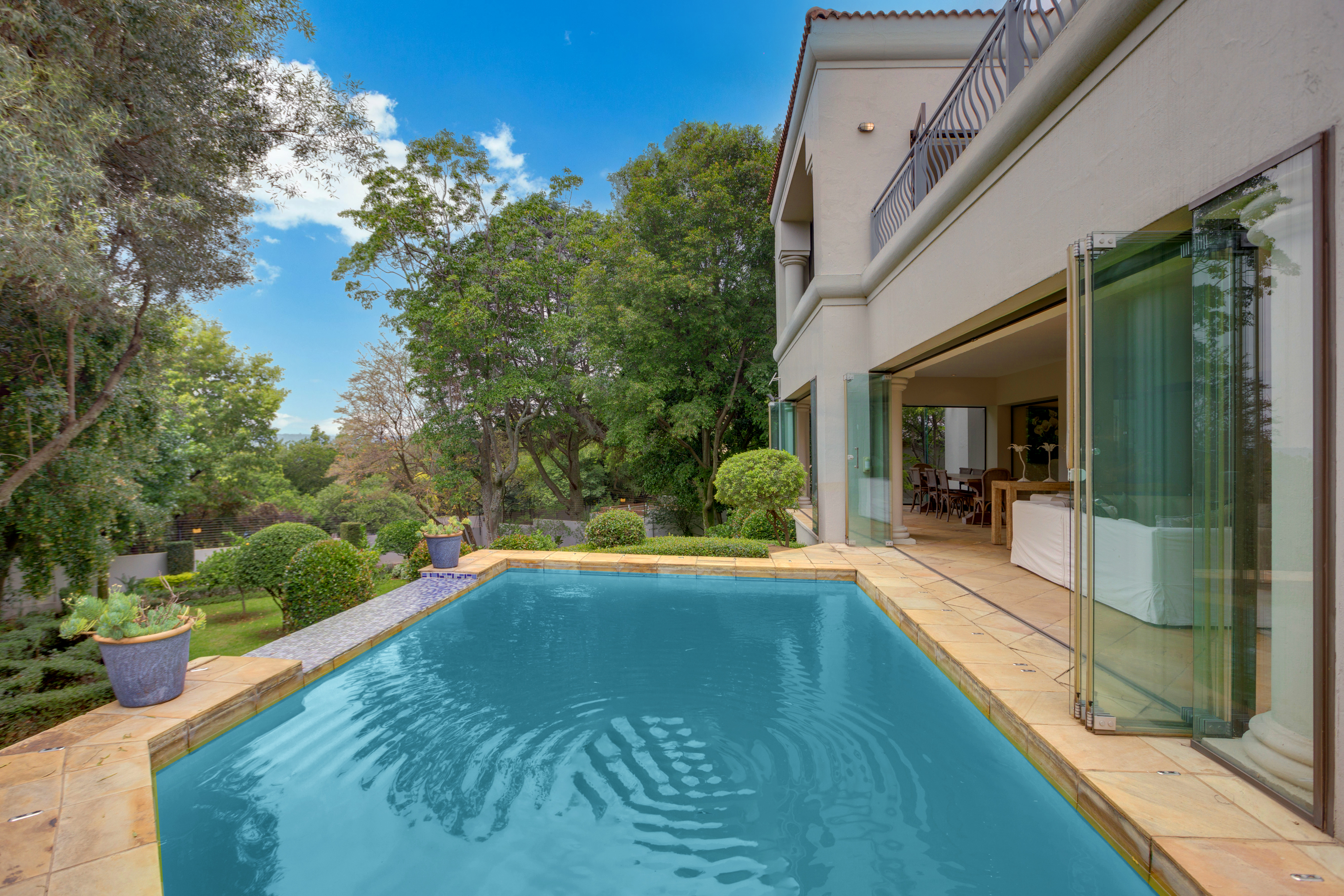 Perched high on one of Bryanston’s most coveted ridges, this flawless masterpiece commands sweeping, cinematic views of the Johannesburg skyline. Every inch of the residence has been crafted with uncompromising attention to luxury, elegance, and contemporary design—an architectural triumph where refined living meets effortless functionality. Designed for both serene daily living and sophisticated entertaining, the home’s open-plan layout allows natural light to cascade throughout. A magnificent enclosed patio, complete with sumptuous dining and lounge areas, features full-width glass cavity doors that dissolve into the manicured garden and glistening rim-flow pool, creating an extraordinary fusion of indoor comfort and outdoor splendour.