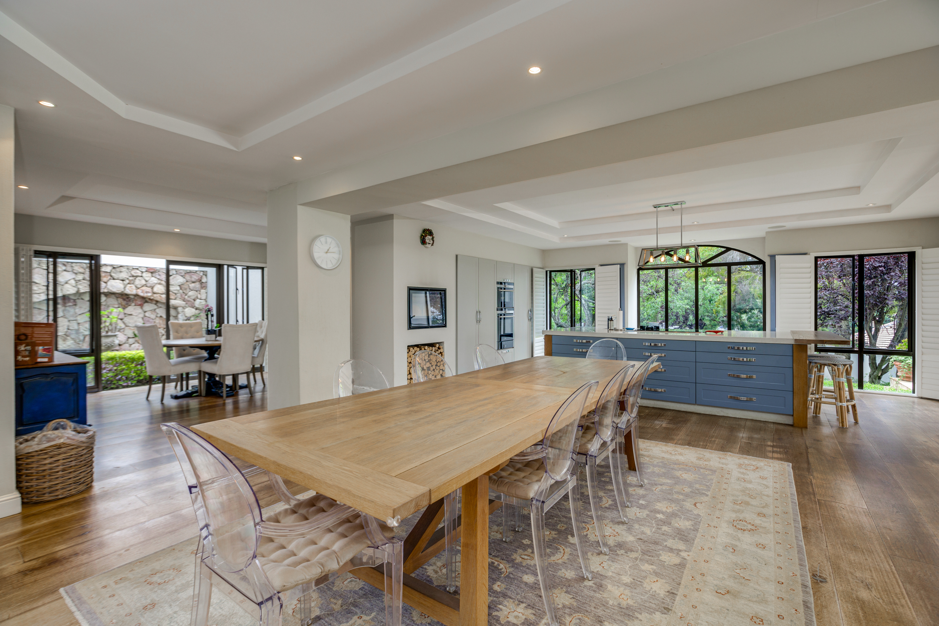 The sophisticated dining space flows into a state-of-the-art gourmet kitchen fitted with an array of integrated luxury appliances, including a steam oven, double convection ovens, induction hob, retractable extractor, integrated fridge/freezer, and dual bar fridges. Soft-touch cabinetry, a walk-in pantry, an expansive scullery and laundry with a second undercounter oven, and a cosy breakfast nook complete this culinary haven. For wine enthusiasts, a climate-controlled wine cellar and tasting room offer an indulgent sanctuary for storing and savouring prized vintages.