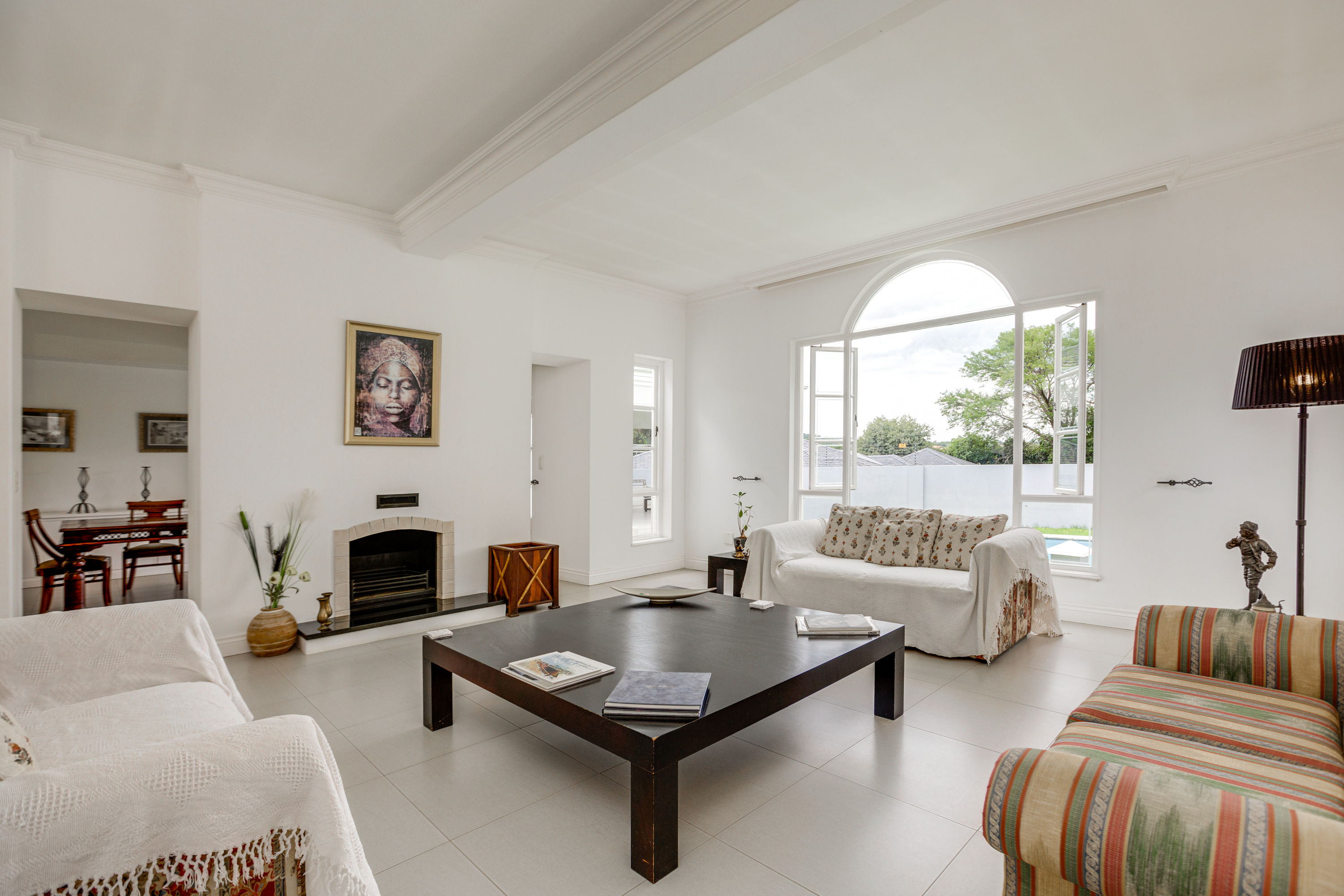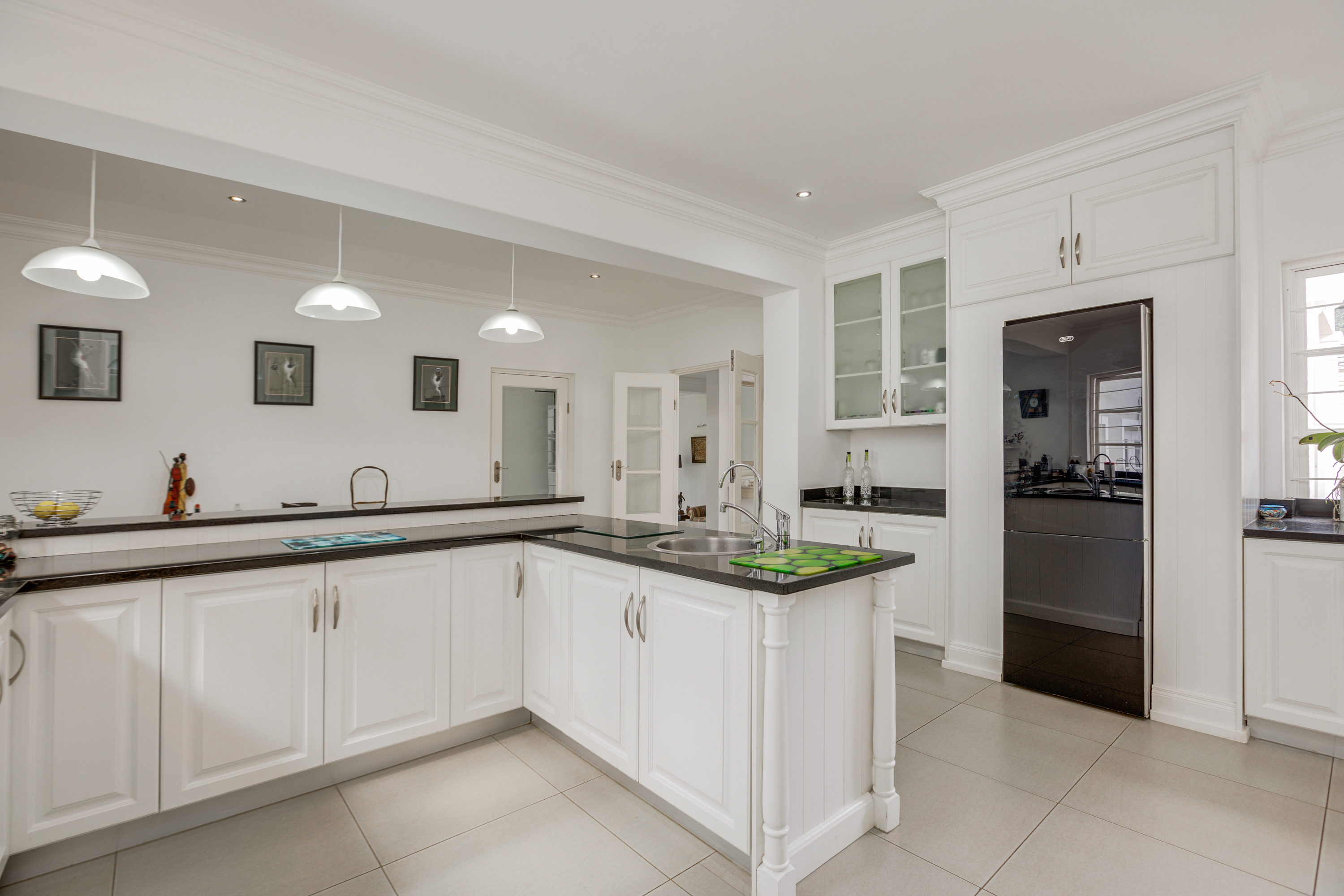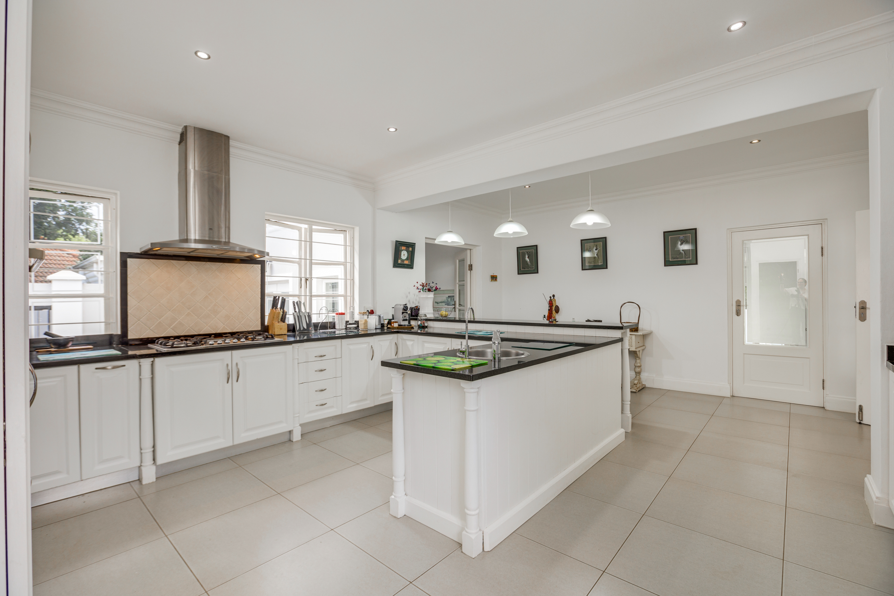 The living areas flow with refined ease, comprising a formal lounge with fireplace, a sophisticated dining room opening onto the garden and kitchen, and an inviting family room with bespoke cabinetry and fireplace. These spaces extend naturally onto a vast, covered entertainer’s patio overlooking the landscaped garden and expansive swimming pool (currently being renovated). Designed for both elegant entertaining and relaxed family gatherings, this outdoor haven is complete with a built-in braai and tranquil garden vistas. At the heart of the home lies a beautifully renovated gourmet kitchen, featuring a breakfast counter, gas hob, extractor, eye-level oven, prep bowl, and ample work surfaces, complemented by a separate scullery and a fully fitted laundry.