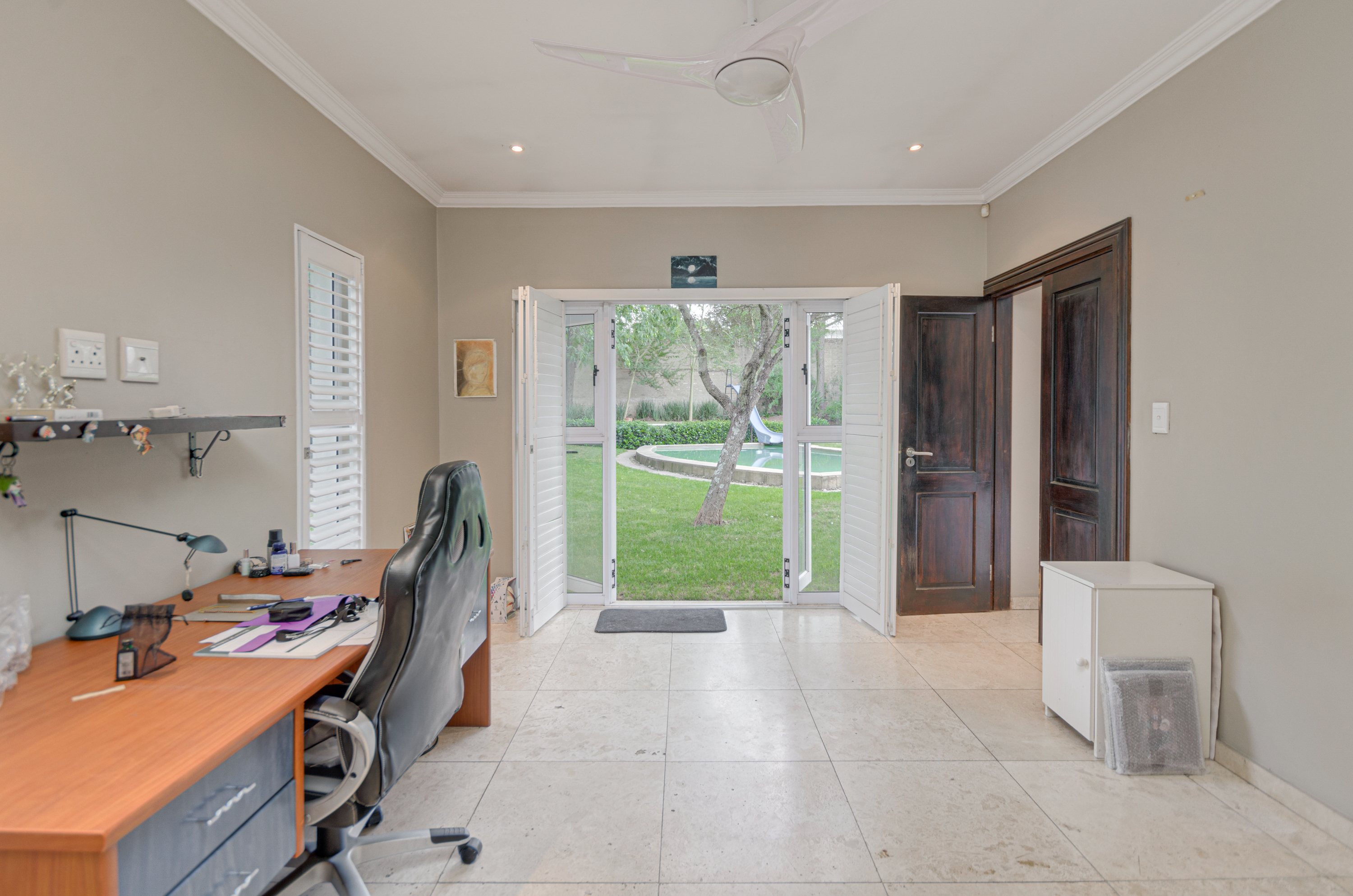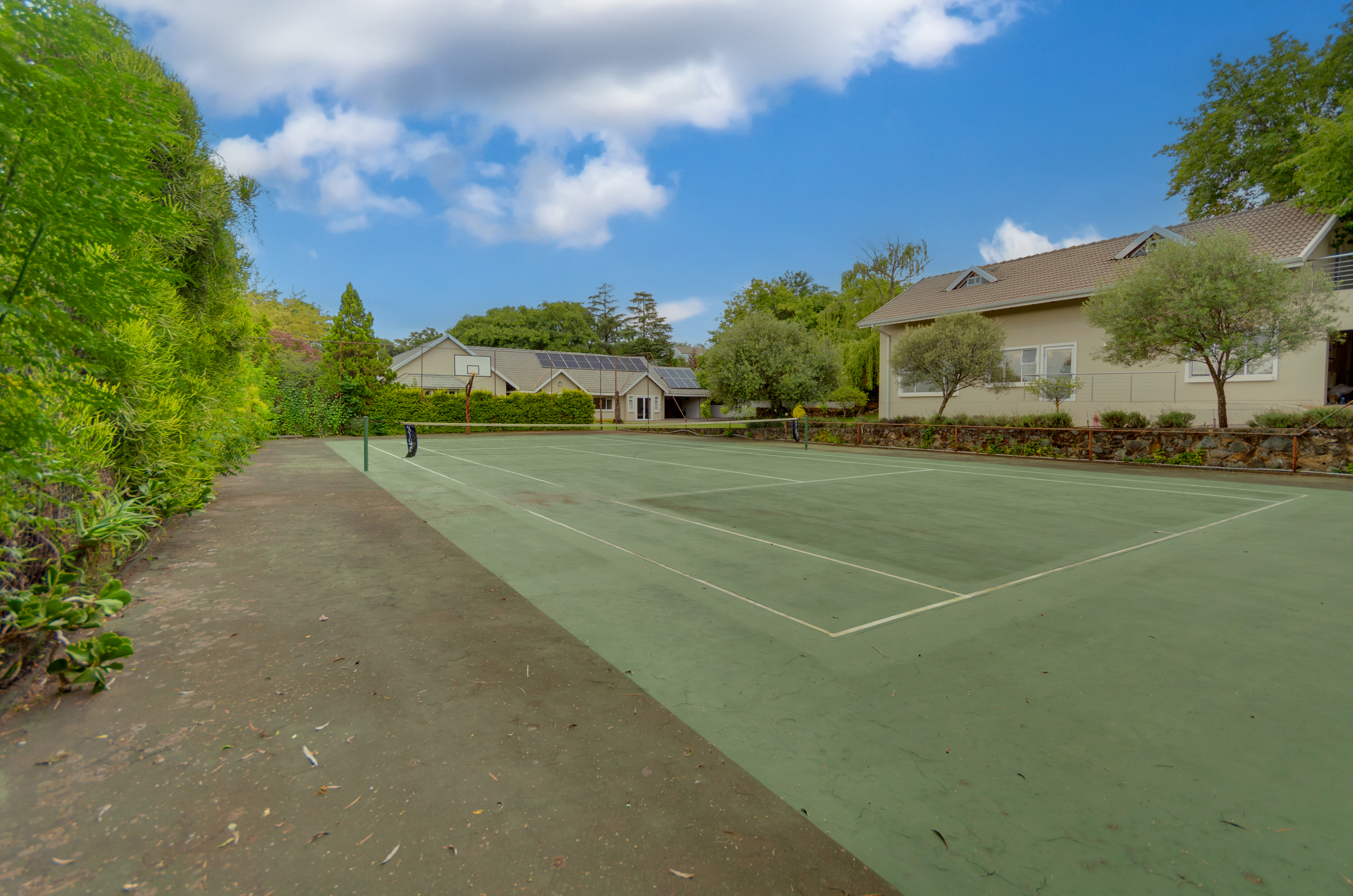 At the centre of the residence lies a sprawling kitchen designed for both practicality and family connection, complemented by an expansive scullery. Stacking doors open effortlessly onto a generous covered patio—an ideal setting for year-round gatherings. From here, the beautifully maintained garden stretches out around a shimmering swimming pool, with the added luxury of a private tennis court elevating the estate’s lifestyle offering.