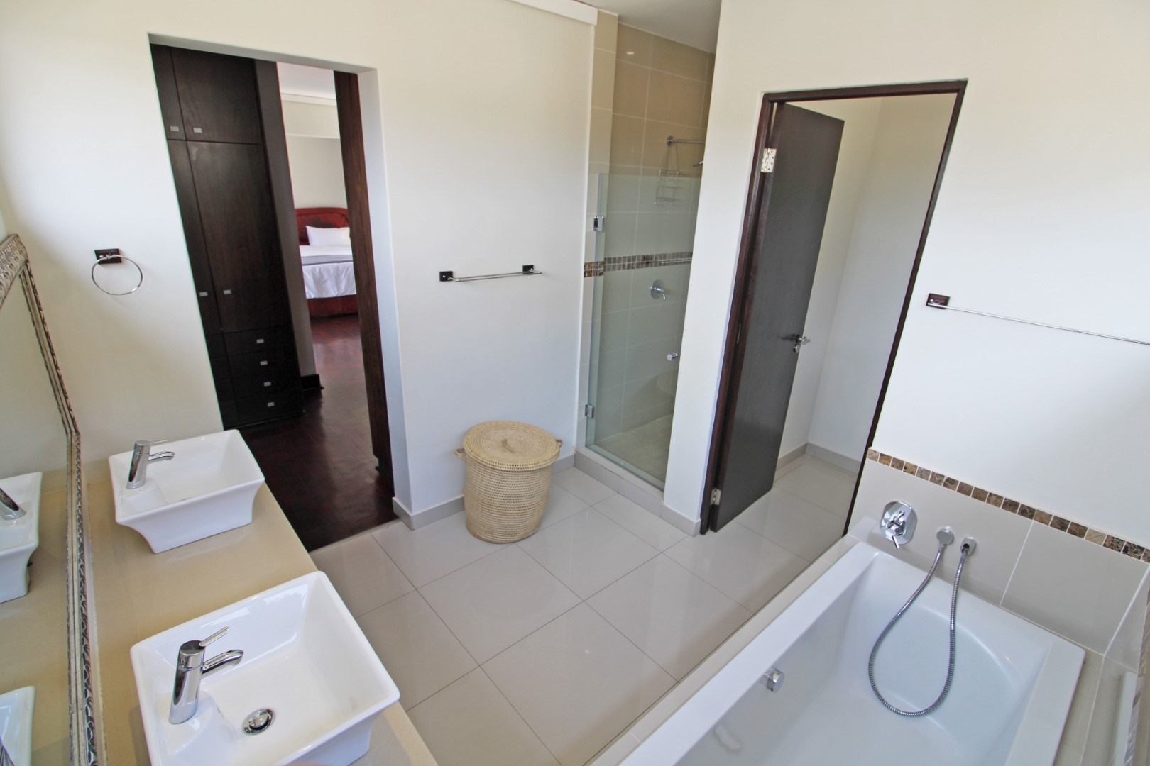 The upstairs bedrooms are secured off at night, with a lockable trellidoor. There are 3 large bedrooms with en-suite bathrooms and a smaller guest bedroom also en-suite. All bedrooms have teak parquet flooring and built- in cupboards.