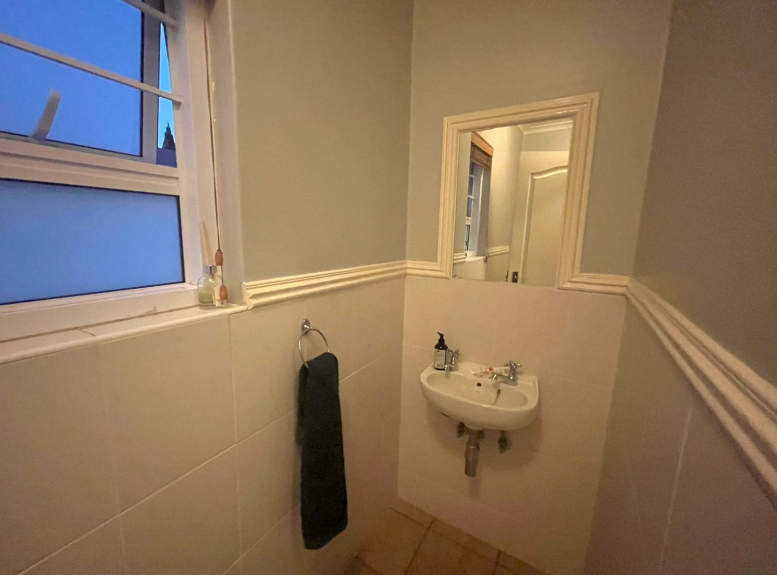 Upstairs, you’ll find three bedrooms. The main suite boasts air-conditioning and a full en-suite bathroom with bath, shower, basin, and toilet. The second bedroom has been converted into a study, while the third is carpeted – ideal as a guest room. A second bathroom serves these bedrooms, and a third bathroom is conveniently located downstairs.