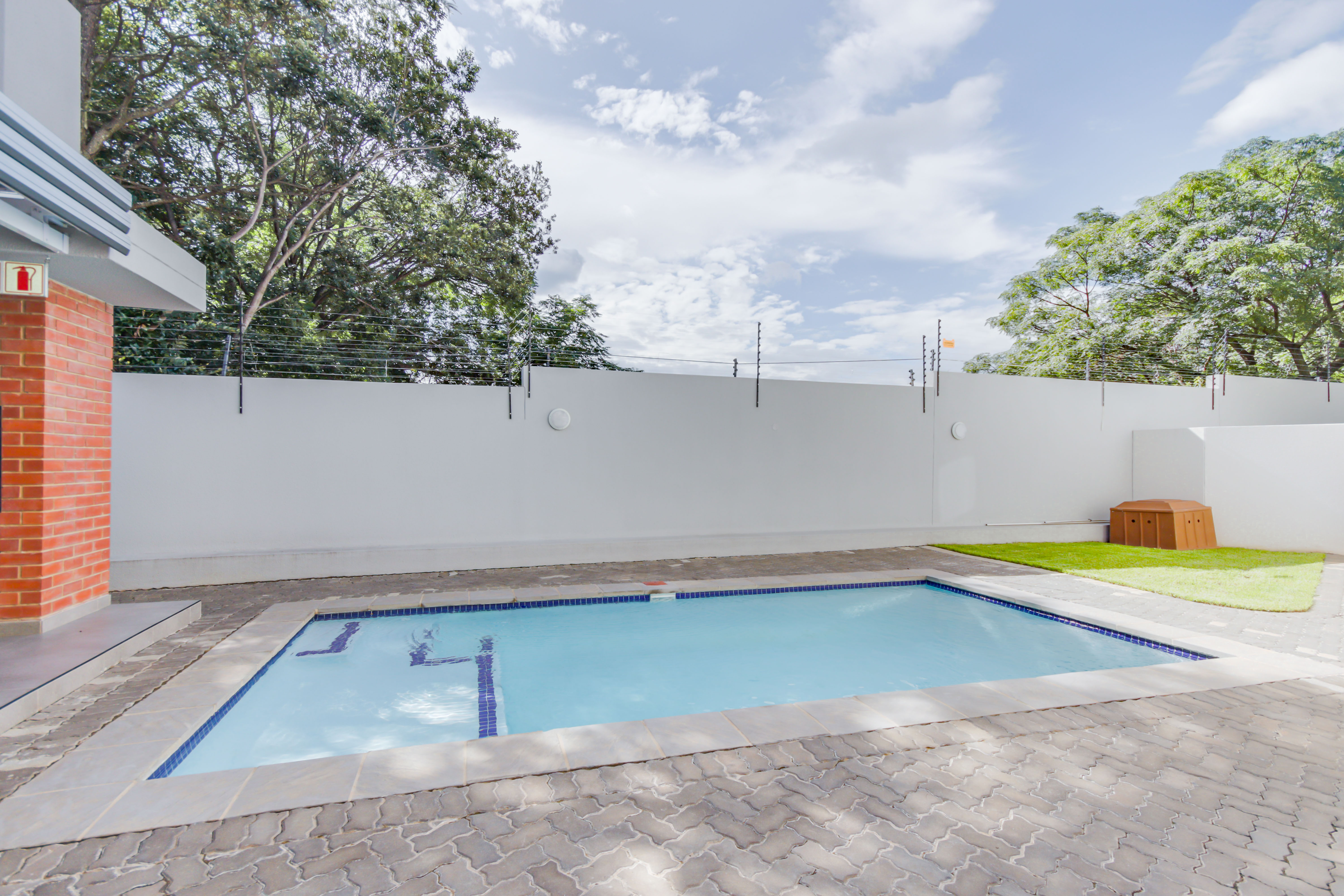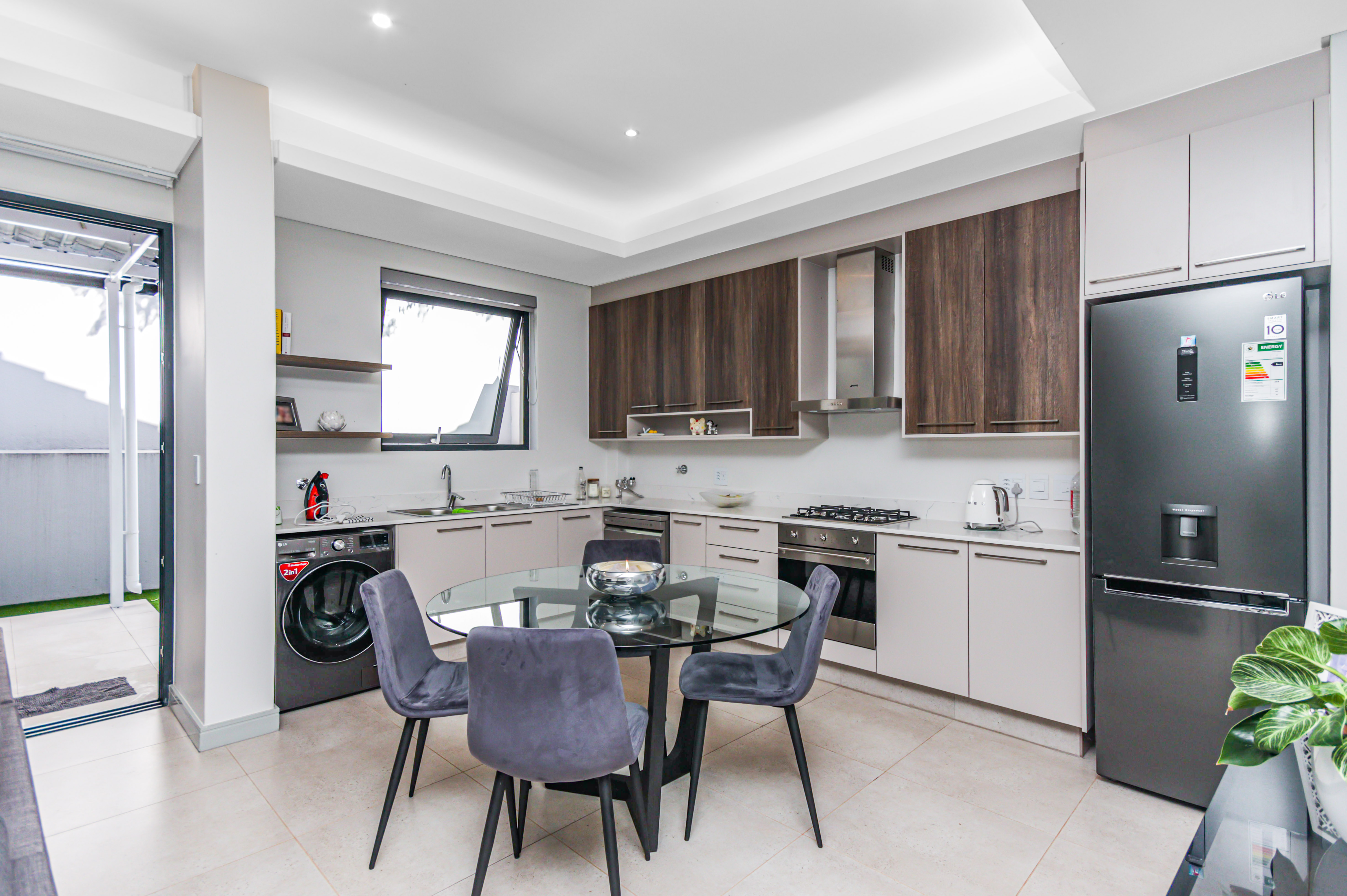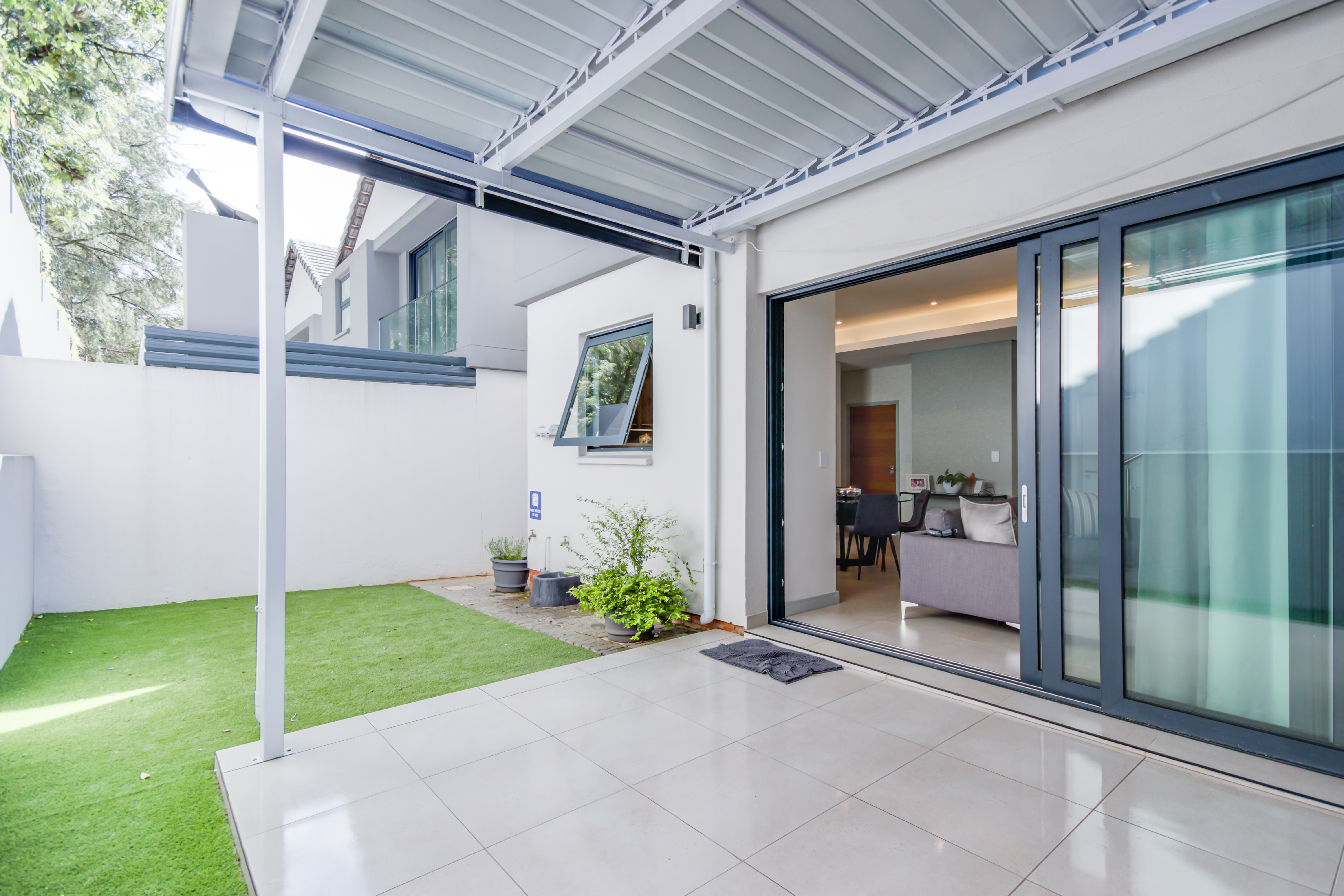 Situated in the highly sought-after Bryanston area, this beautifully finished home offers the perfect combination of luxury and functionality. With top-of-the-line finishes and spacious living areas, this property is a must-view. The home features 3 spacious bedrooms, each with laminate flooring, a private en-suite bathroom, and its own balcony. The expansive main bedroom includes a walk-through closet and a large en-suite bathroom with double sinks, a modern freestanding tub, and a glass-enclosed shower. A landing area offers a perfect space for a small study or reading nook. Downstairs, the home includes an additional guest bathroom for convenience. The modern kitchen boasts Caesarstone countertops, a gas stove and hob, and high-end cabinetry. The open-plan lounge and dining area are highlighted by a striking ceiling feature with downlights. Glass doors open out to a covered patio with an adjustable roof, ideal for year-round entertaining. The built-in braai area, complete with a work counter, adds to the appeal. This home also comes equipped with an inverter that automatically activates during load shedding, ensuring you’ll never be without power. Additionally, the complex offers a clubhouse with braai facilities and a refreshing pool for residents to enjoy. Located close to popular schools, shopping centers, and with easy access to major business routes, this home offers the perfect blend of comfort, convenience, and modern living. Don’t miss out on this modern gem in a prime location—contact us today to arrange a viewing!