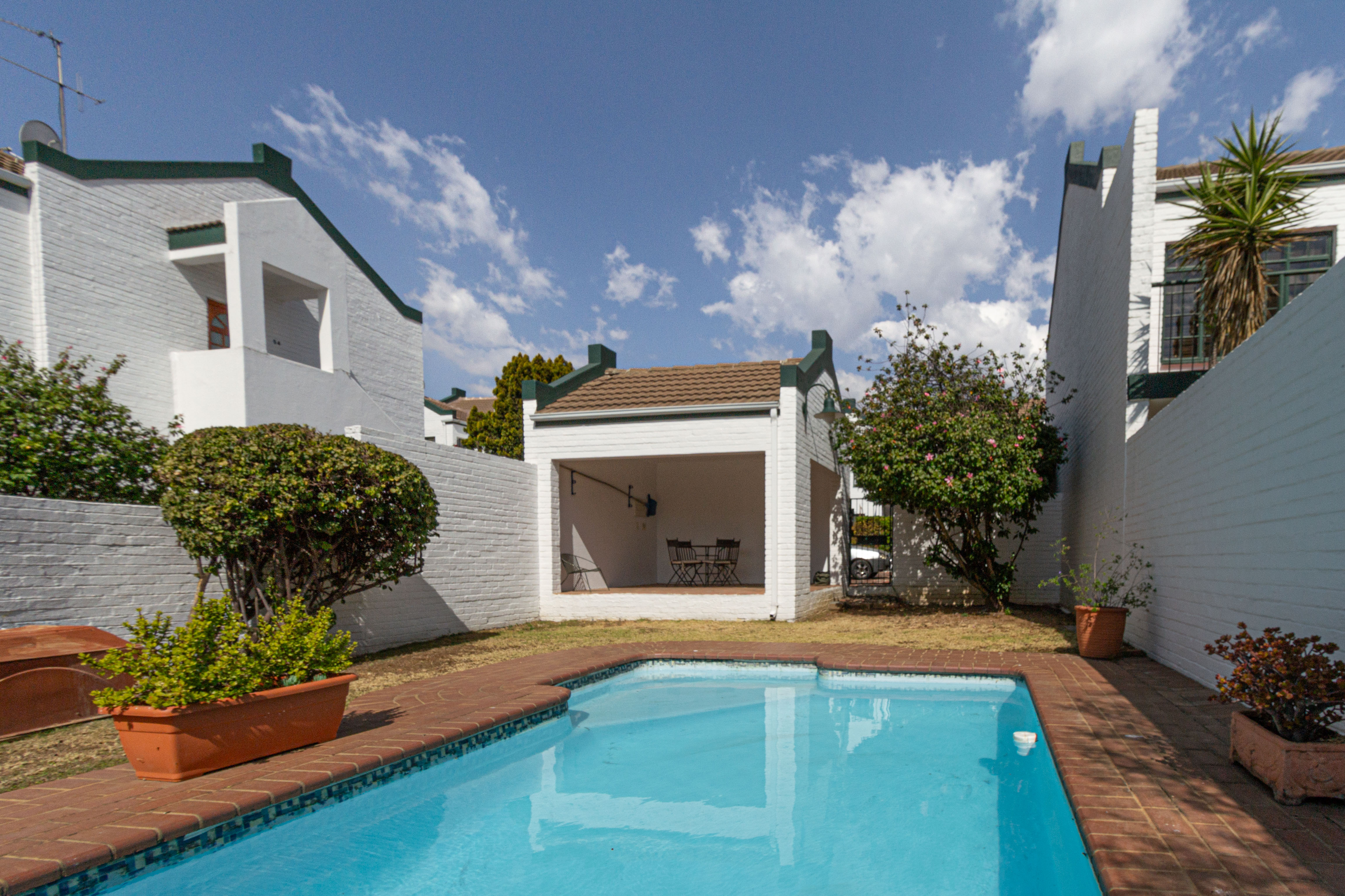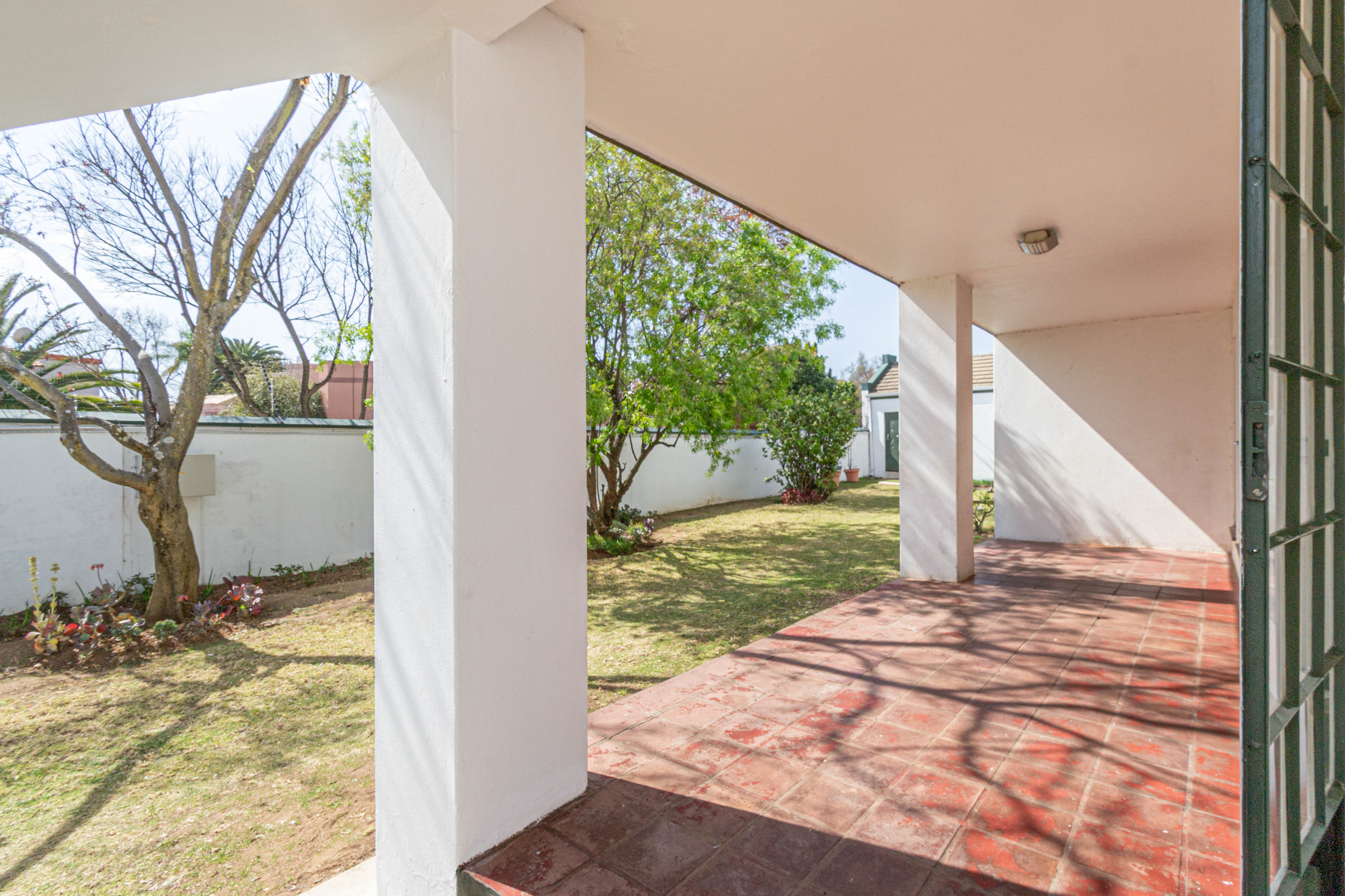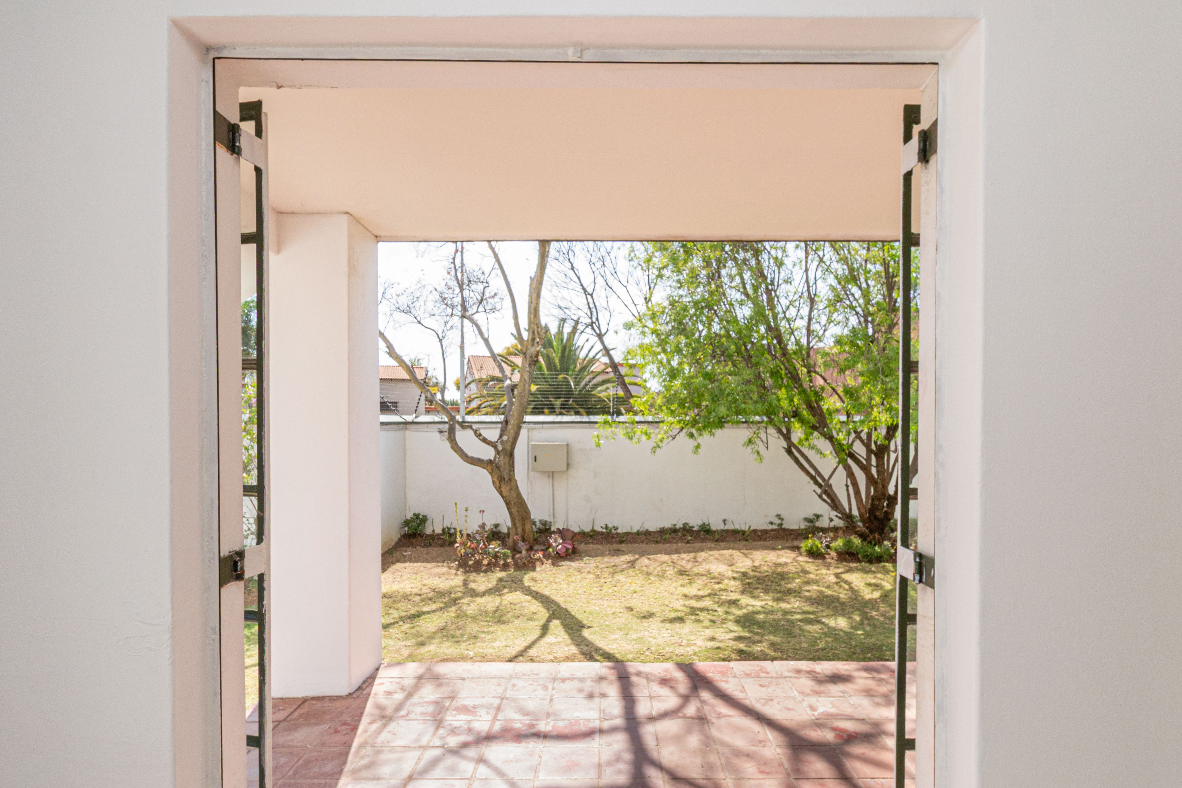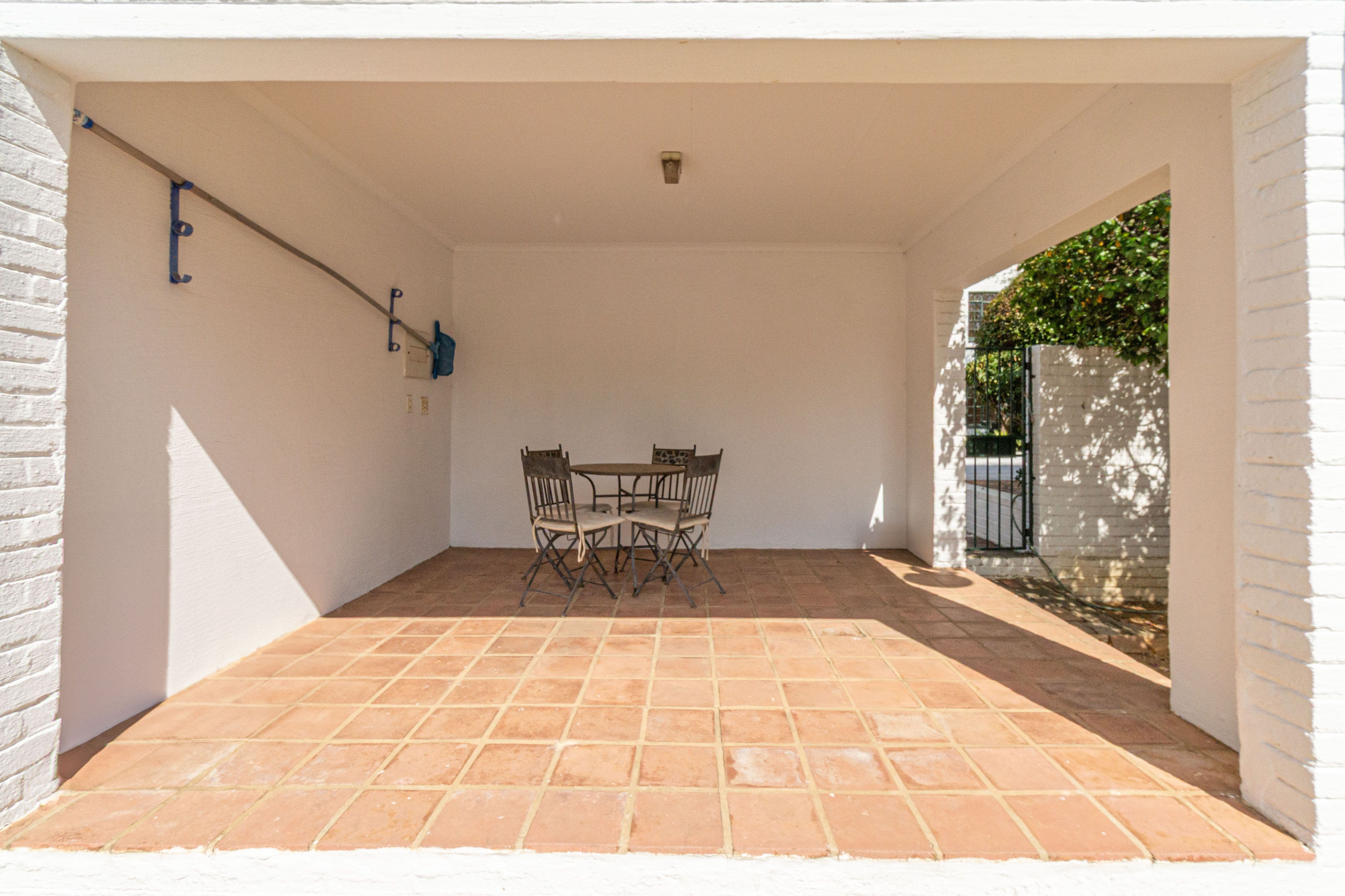 Living Area: Open-plan layout with room for a dining table and lounge suite. The living area flows effortlessly onto a covered patio that opens to a charming communal garden, perfect for relaxing or entertaining.
