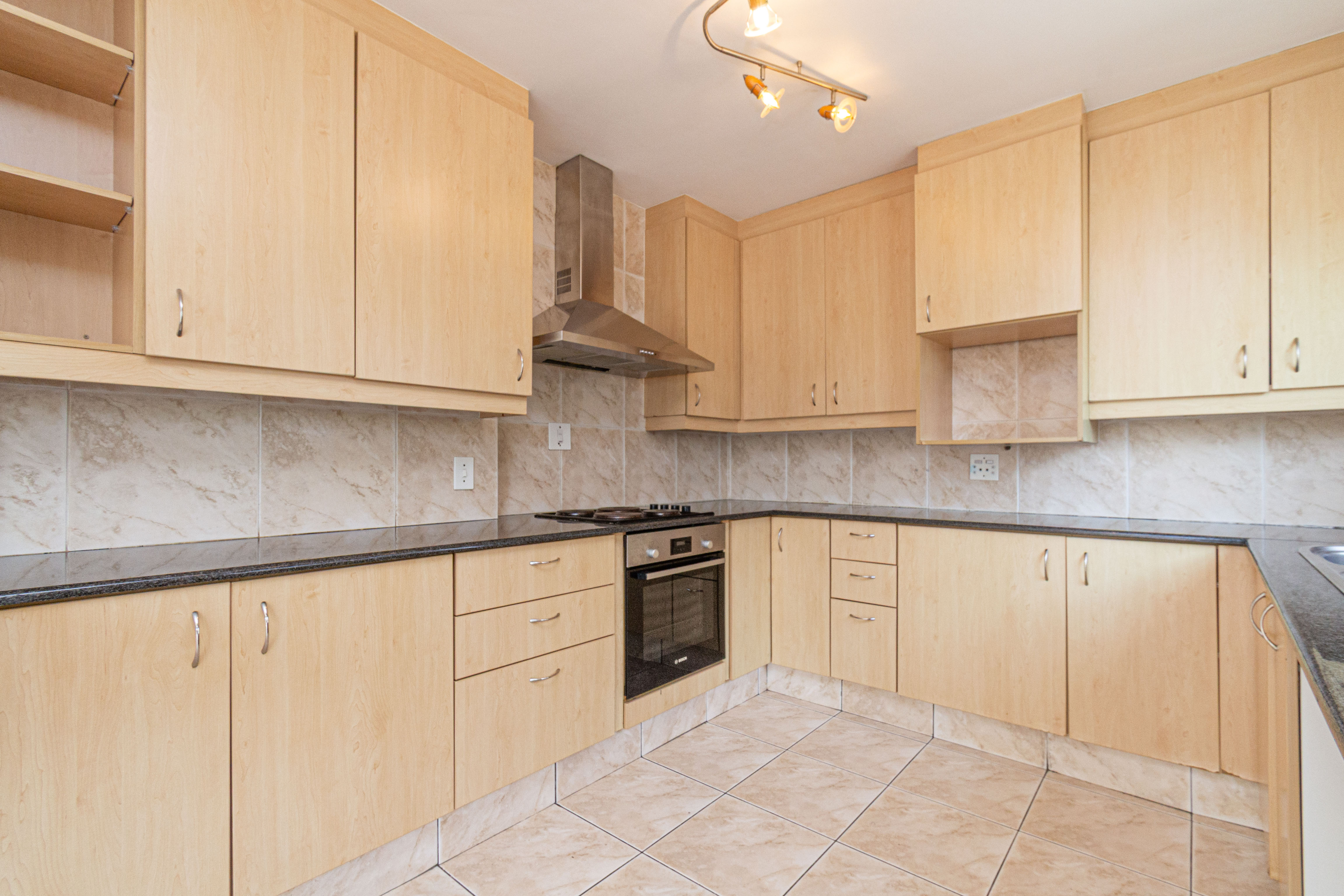 Kitchen: Modern kitchen with granite countertops, and space for two wet appliances.